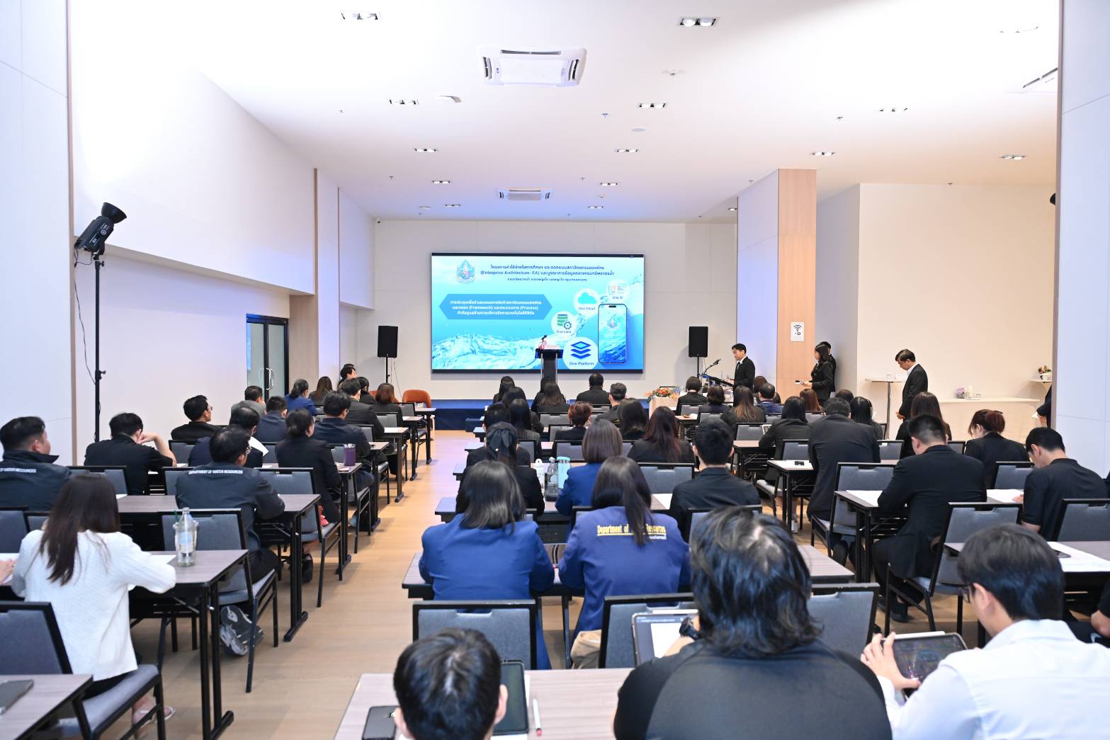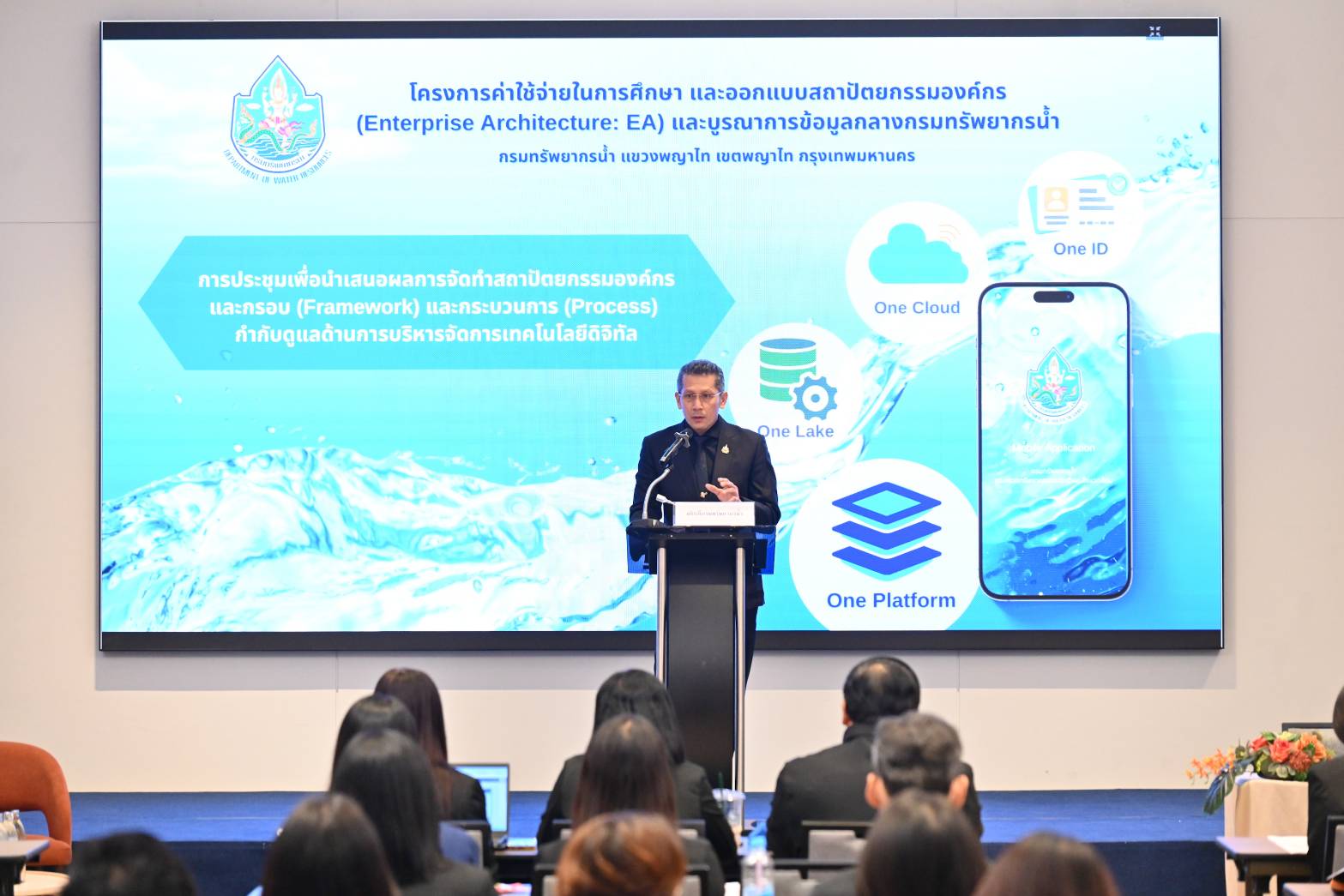 วันที่ 29 มกราคม 2569 นายธีระชุณ บุญสิทธิ์ อธิบดีกรมทรัพยากรน้ำ เป็นประธานในพิธีเปิดการประชุมนำเสนอสถาปัตยกรรมองค์กรและกรอบ(framework) และกระบวนการ(Process) กำกับดูแลด้านการบริหารจัดการเทคโนโลยีดิจิทัล พร้อมนายเวสารัช โสภณดิเรกรัตน์ รองอธิบดีฯ ผู้บริหาร และเจ้าหน้าที่กรม เข้าร่วม โดยมีนายวรวิทย์ ชัยวิมลกุล ผู้อำนวยการศูนย์เทคโนโลยีและการสื่อสาร กล่าวรายงาน วัตถุประสงค์ในการประชุมเพื่อนำเสนอสถาปัตยกรรมองค์กรและกรอบ(Framework) และกระบวนการ(Process) กำกับดูแลด้านการบริหารจัดการเทคโนโลยีดิจิทัล ทั้ง 5 ด้าน ประกอบด้วย ด้านธุรกิจ ด้านแอปพลิเคชัน ด้านข้อมูล ด้านโครงสร้างพื้นฐาน และด้านความปลอดภัย ของโครงการค่าใช้จ่ายในการศึกษาและออกแบบสถาปัตยกรรมองค์กร(Enterprise Architecture : EA) และบูรณาการข้อมูลกลางกรมทรัพยากรน้ำ กรมทรัพยากรน้ำ แขวงพญาไท เขตพญาไท กรุงเทพฯ ในการถ่ายทอดผลการจัดทำสถาปัตยกรรมองค์กรของกรมทรัพยากรน้ำไปสู่การจัดทำแผนปฏิบัติการดิจิทัลเพื่อเศรษฐกิจและสังคม กรมทรัพยากรน้ำ ระยะ 5 ปี พ.ศ. 2571-2575 สู่การพัฒนาเป็นองค์กรอัจฉริยะ(Intelligent Organization) ที่สามารถนำเทคโนโลยีดิจิทัลและปัญญาประดิษฐ์(AI) ในการสนับสนุนการบริหารจัดการน้ำและการตัดสินใจขององค์กร ณ ห้อง Galleria ชั้น 1 โรงแรม เบสท์ เวสเทิร์น จตุจักร