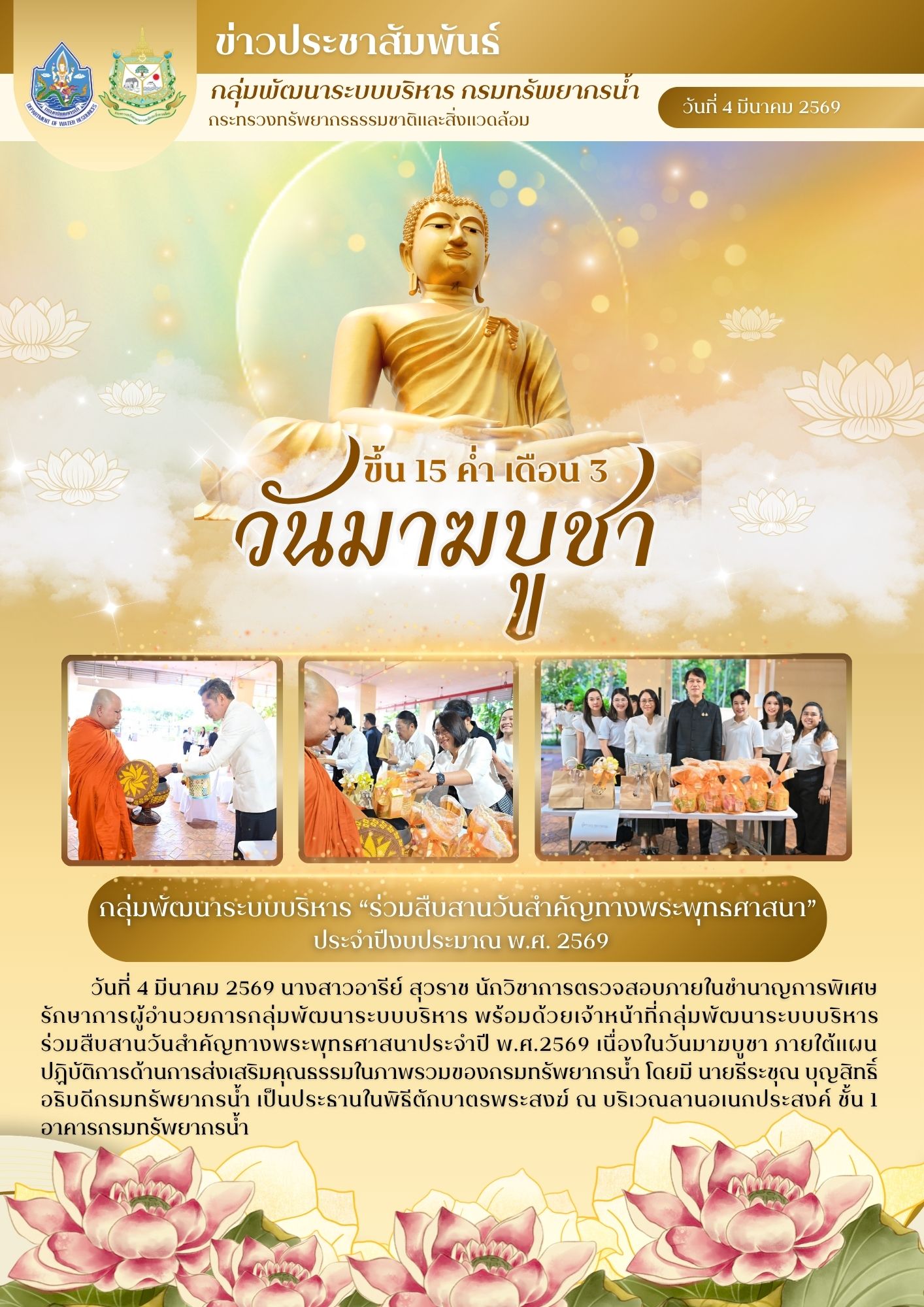 4 มีนาคม 2569 กลุ่มพัฒนาระบบบริหาร ร่วมสืบสานวันสำคัญทางพระพุทธศาสนาประจำปี พ.ศ.2569 เนื่องในวันมาฆบูชา