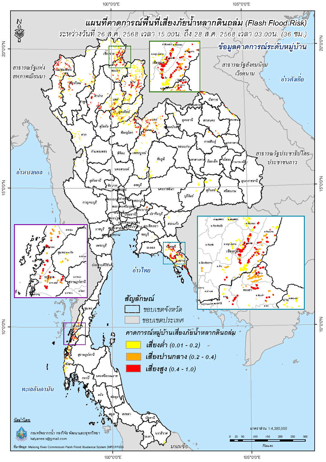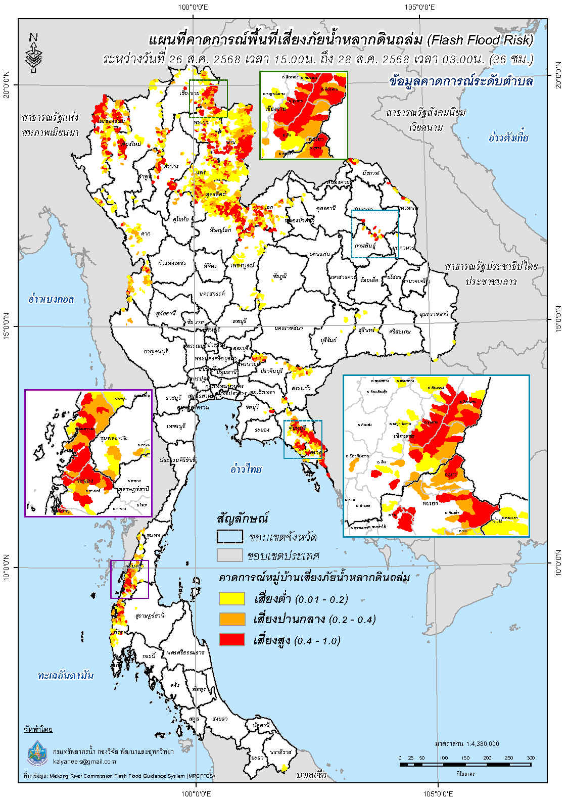 การคาดการณ์ตำบล/หมู่บ้านเสี่ยงภัยน้ำหลากดินถล่ม (Flash Flood Risk) 26 - 28 สิงหาคม 2568