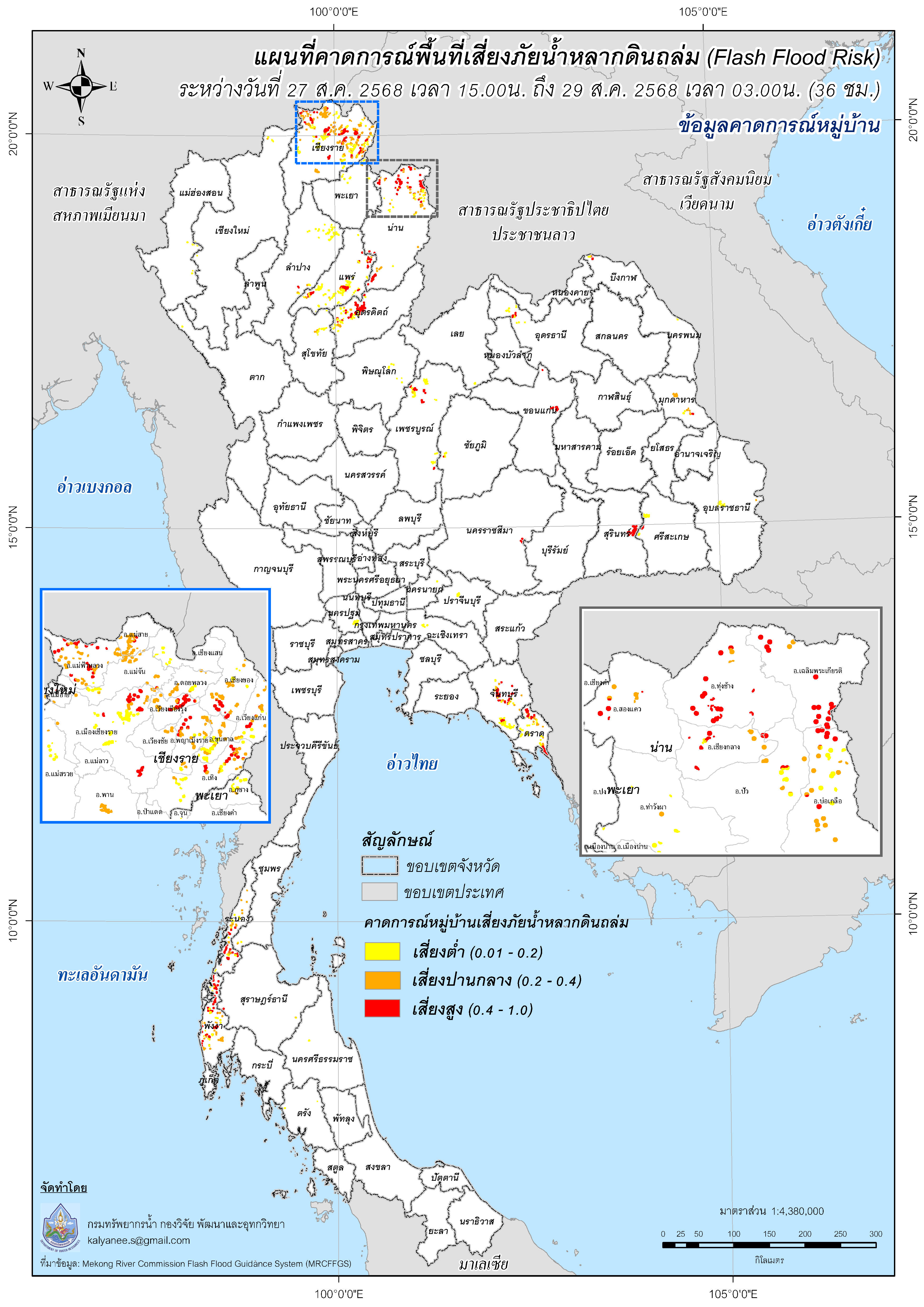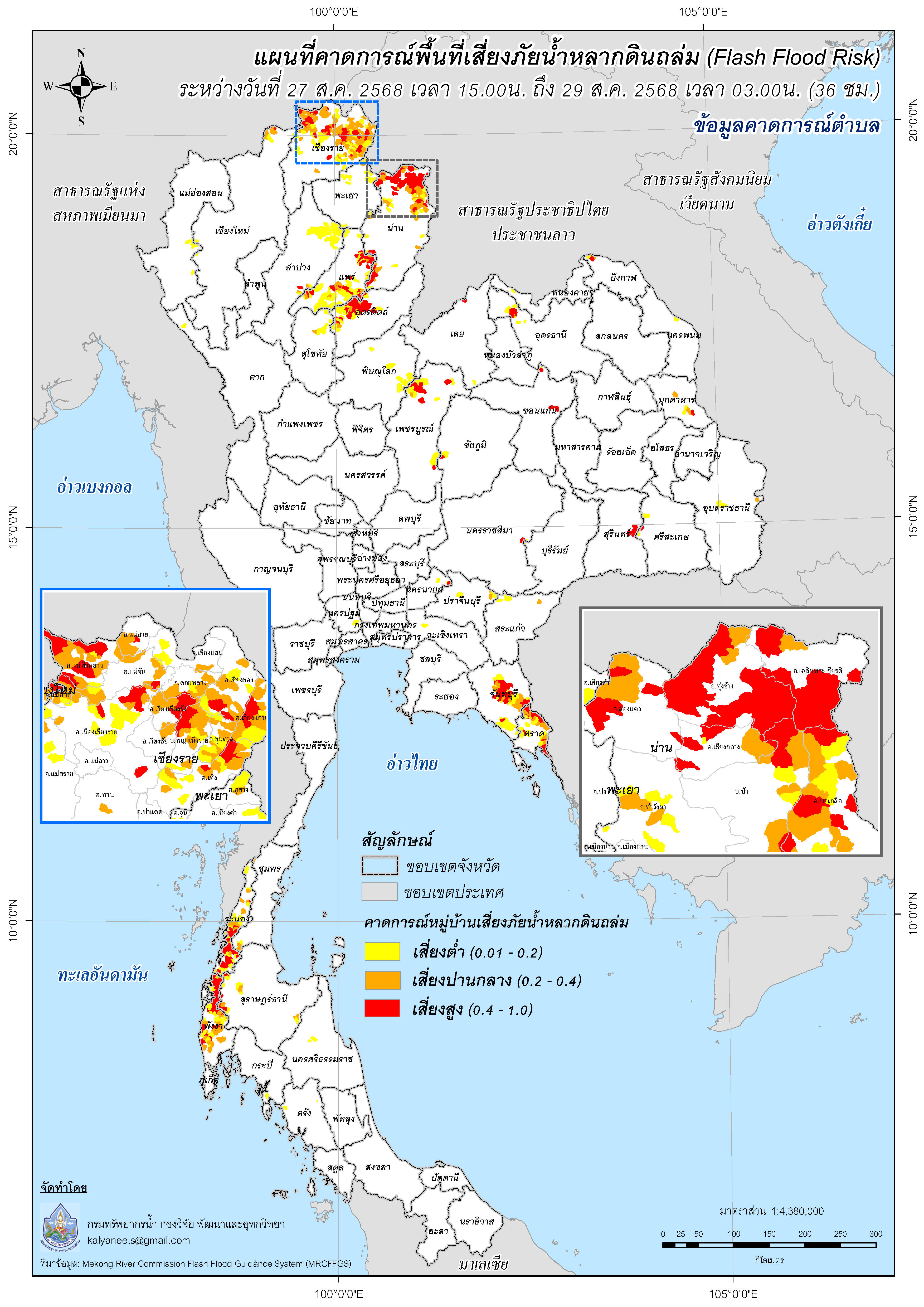 การคาดการณ์ตำบล/หมู่บ้านเสี่ยงภัยน้ำหลากดินถล่ม (Flash Flood Risk) 27 - 29 สิงหาคม 2568