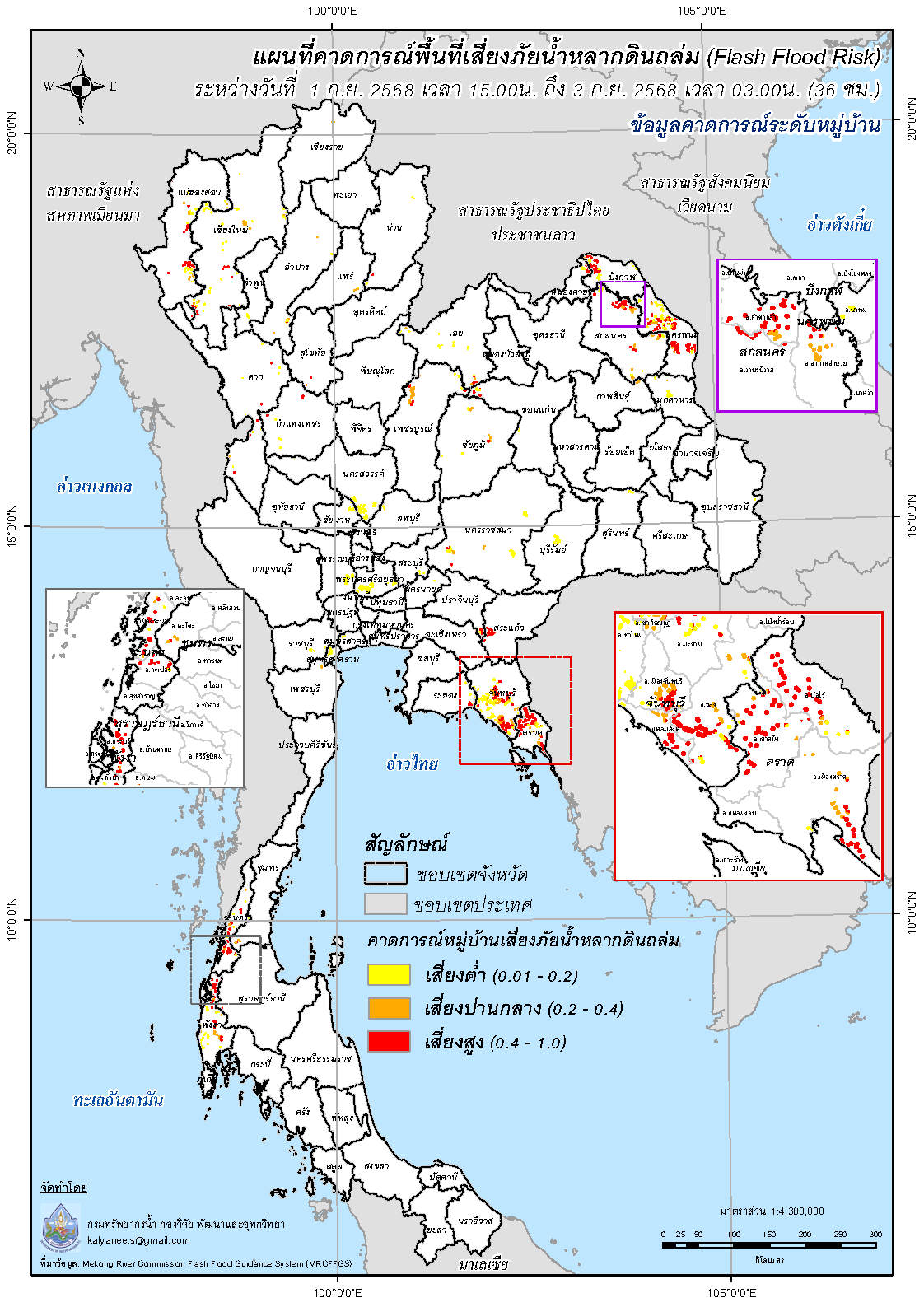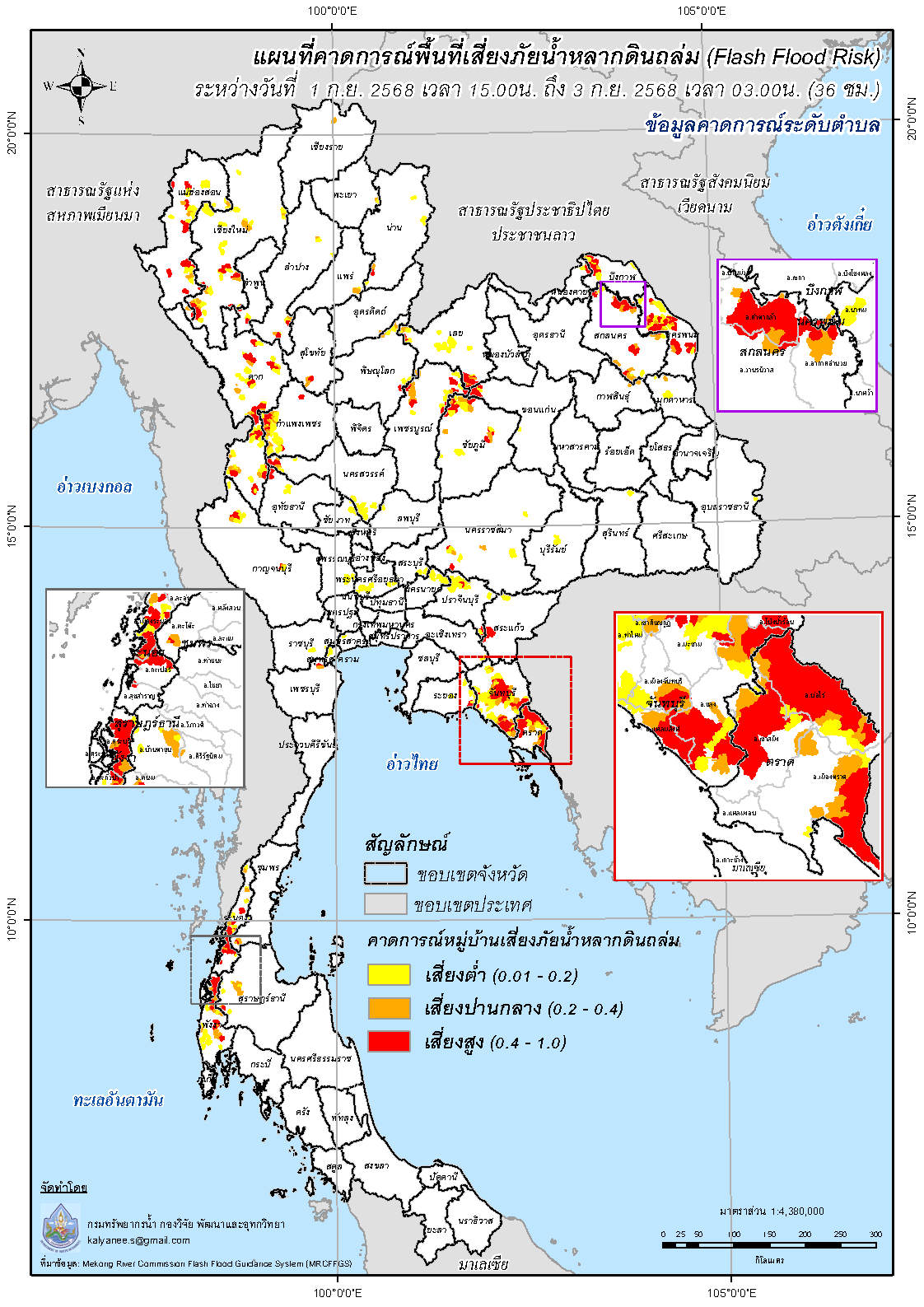 การคาดการณ์ตำบล/หมู่บ้านเสี่ยงภัยน้ำหลากดินถล่ม (Flash Flood Risk) 1 กันยายน - 3 กันยายน 2568