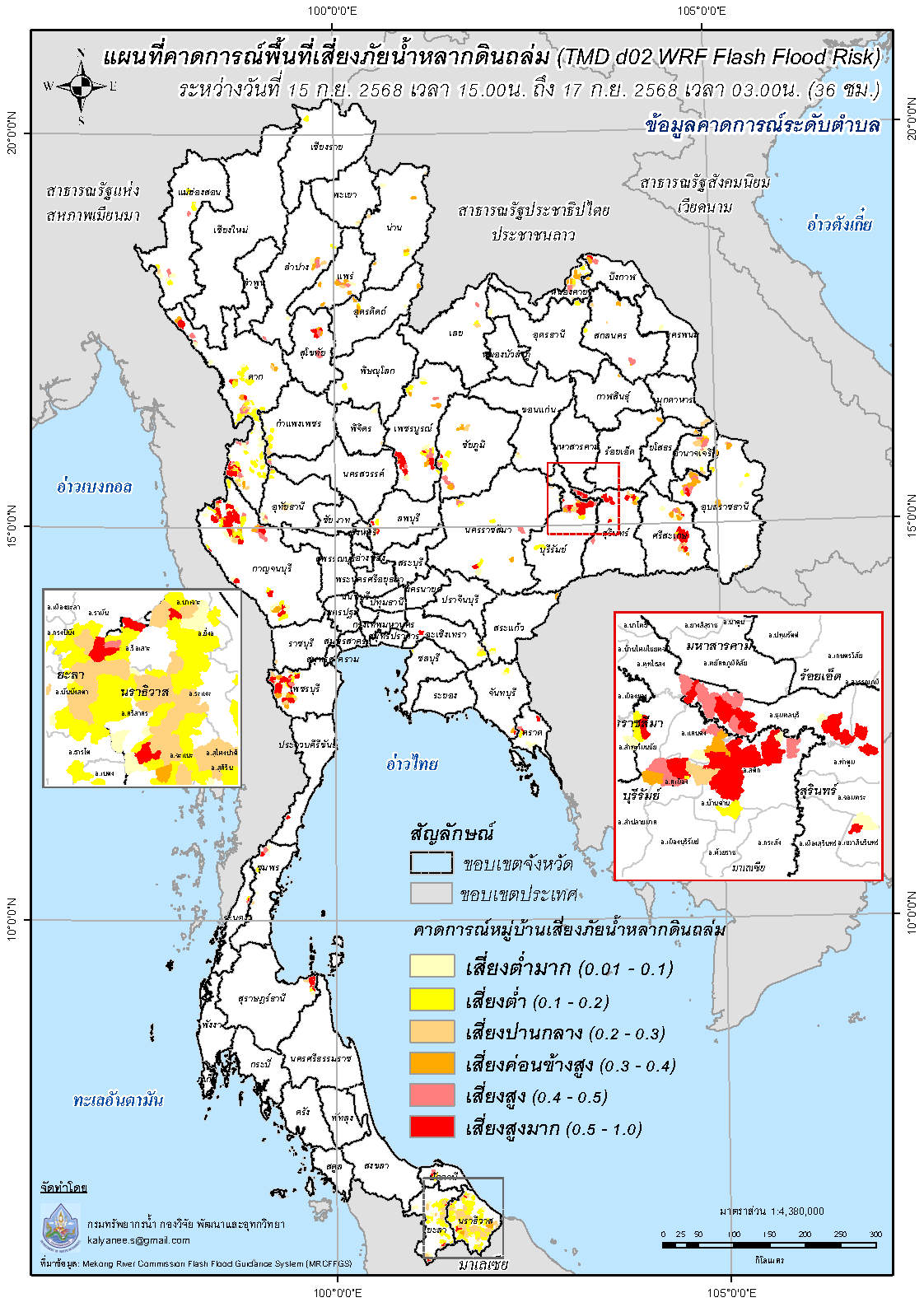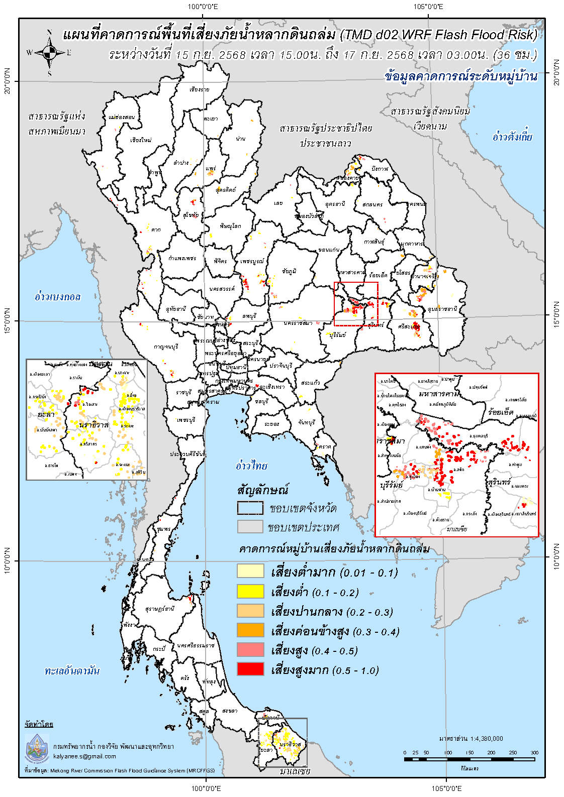 การคาดการณ์ตำบล/หมู่บ้านเสี่ยงภัยน้ำหลากดินถล่ม (Flash Flood Risk) 15 - 17 กันยายน 2568