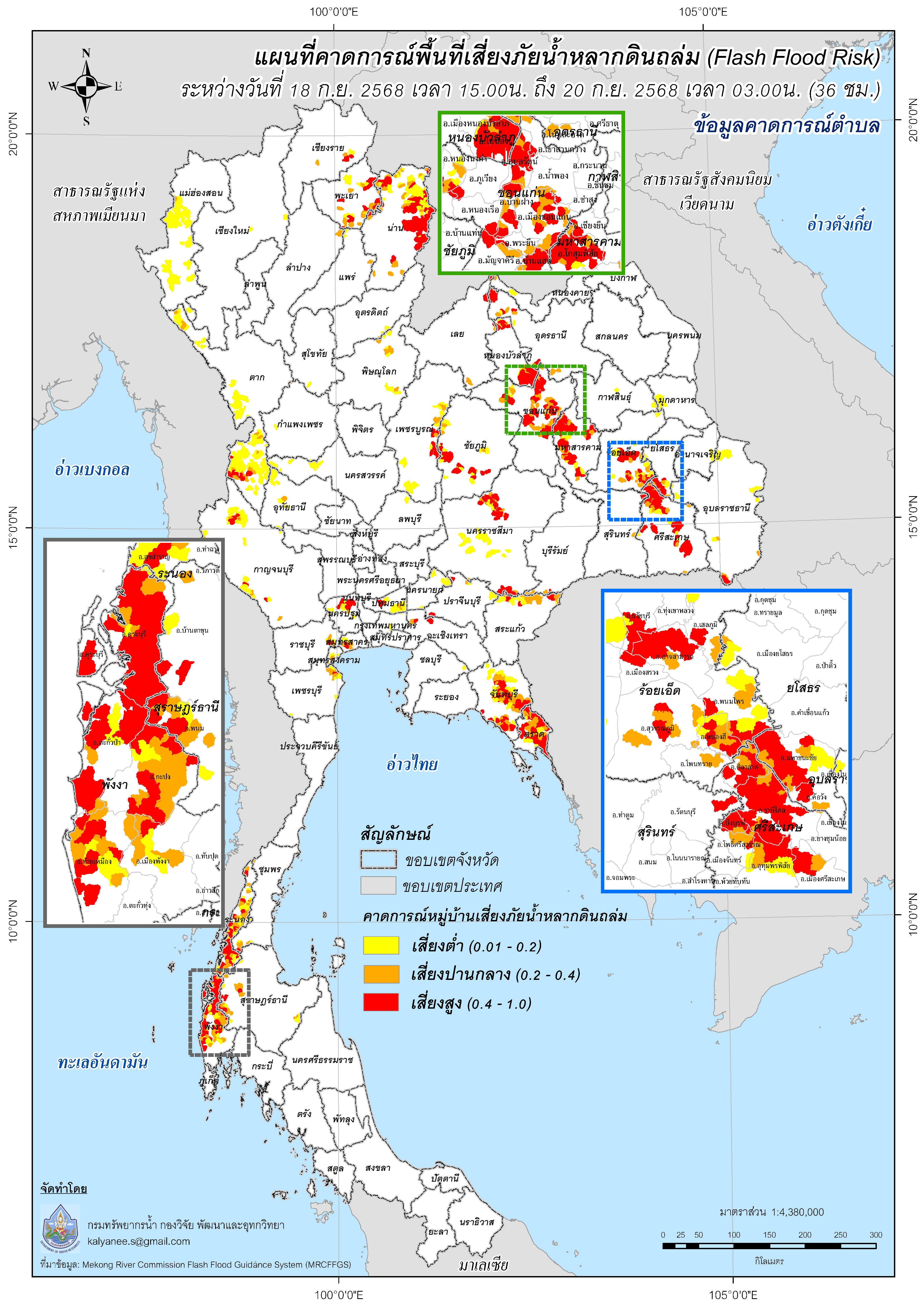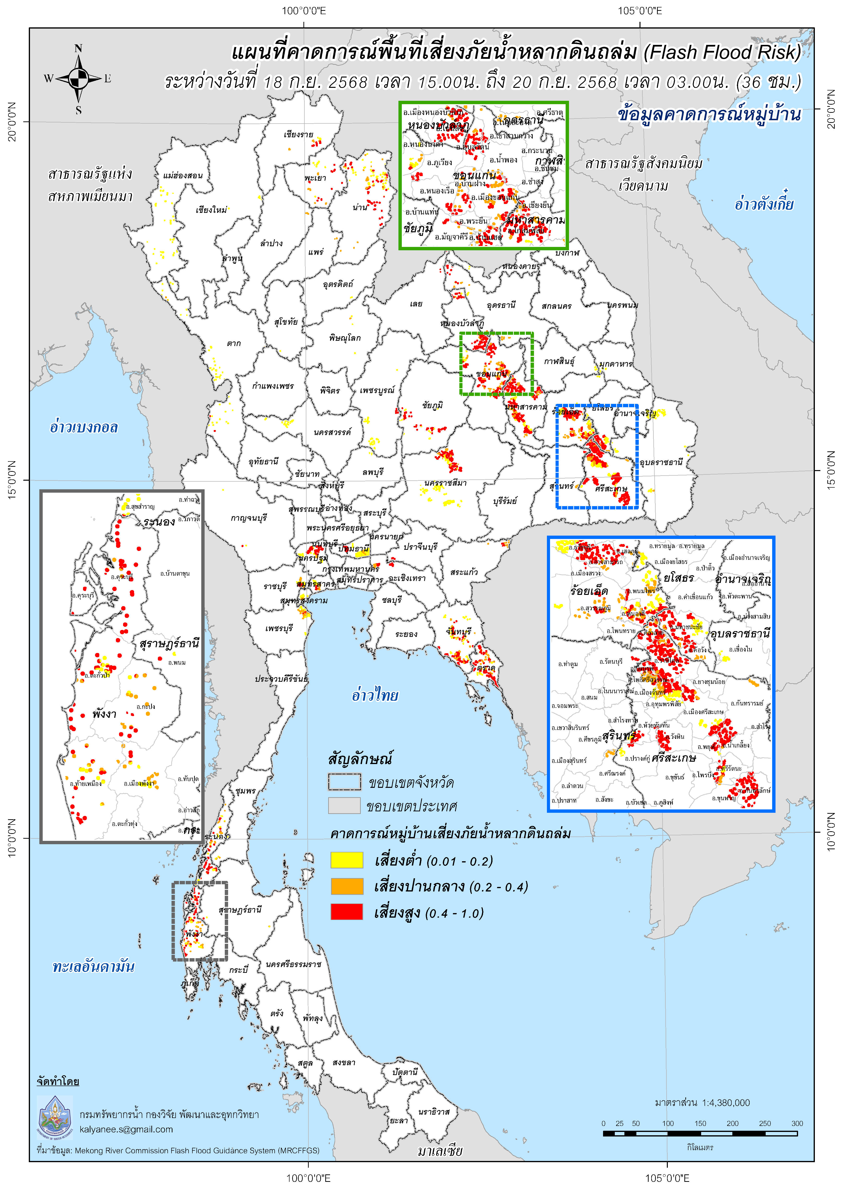 คาดการณ์พื้นที่เสี่ยงภัยน้ำหลากดินถล่ม (Flash Flood Risk) ระดับตำบล และระดับหมู่บ้าน วันที่ 18 - 20 กันยายน 2568 |