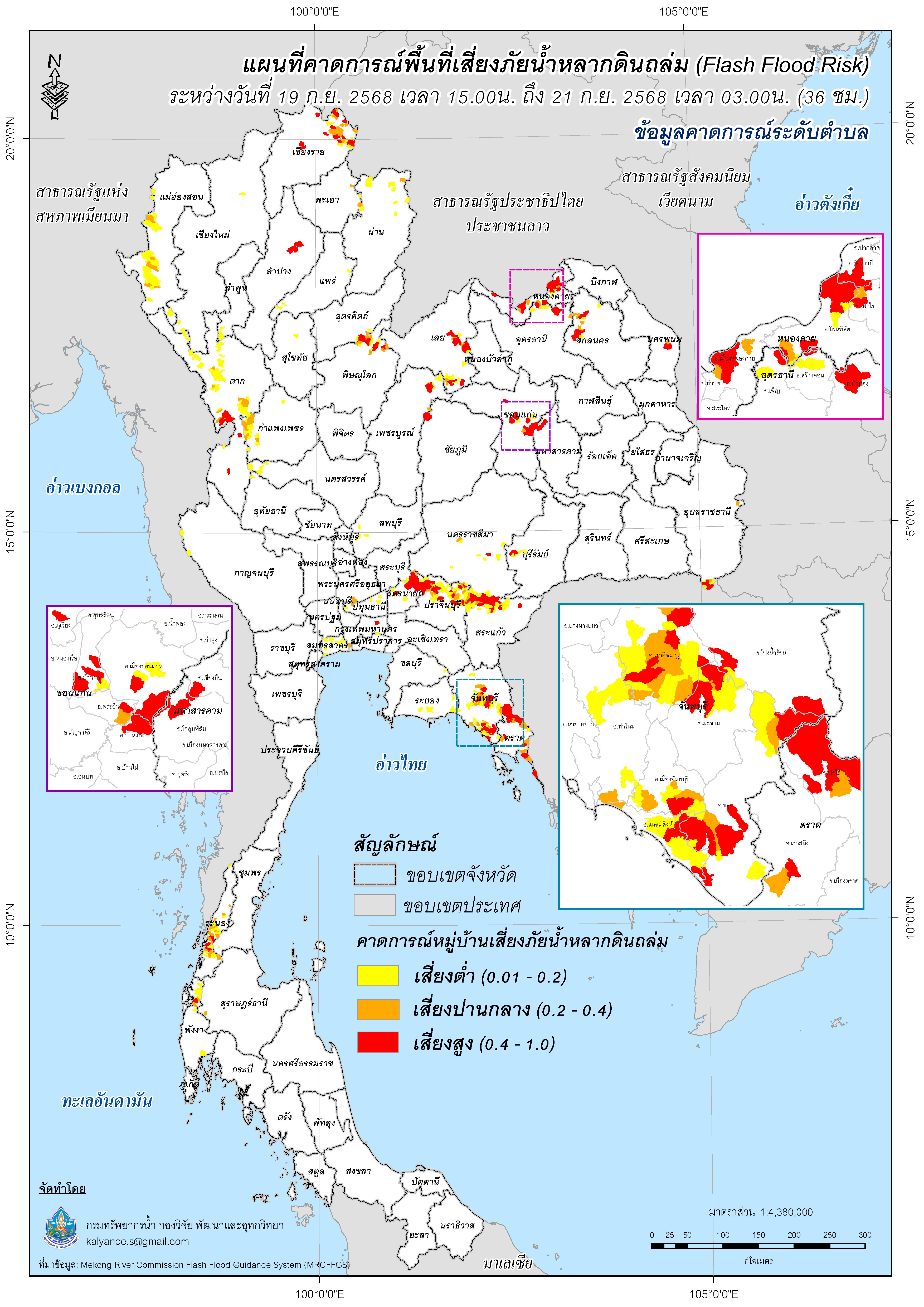 คาดการณ์พื้นที่เสี่ยงภัยน้ำหลากดินถล่ม (Flash Flood Risk) ระดับตำบล และระดับหมู่บ้าน วันที่ 19 - 21 กันยายน 2568 |
