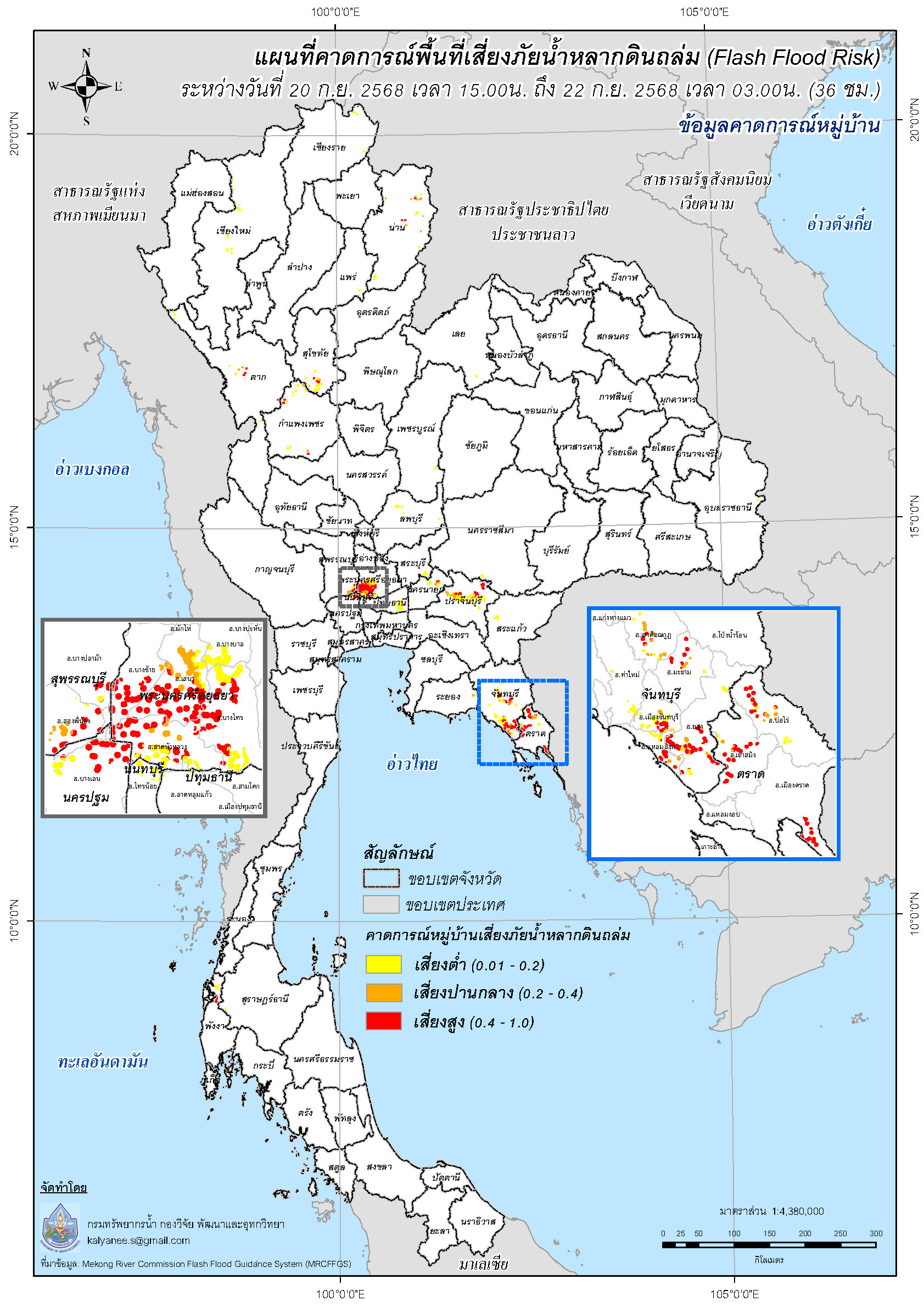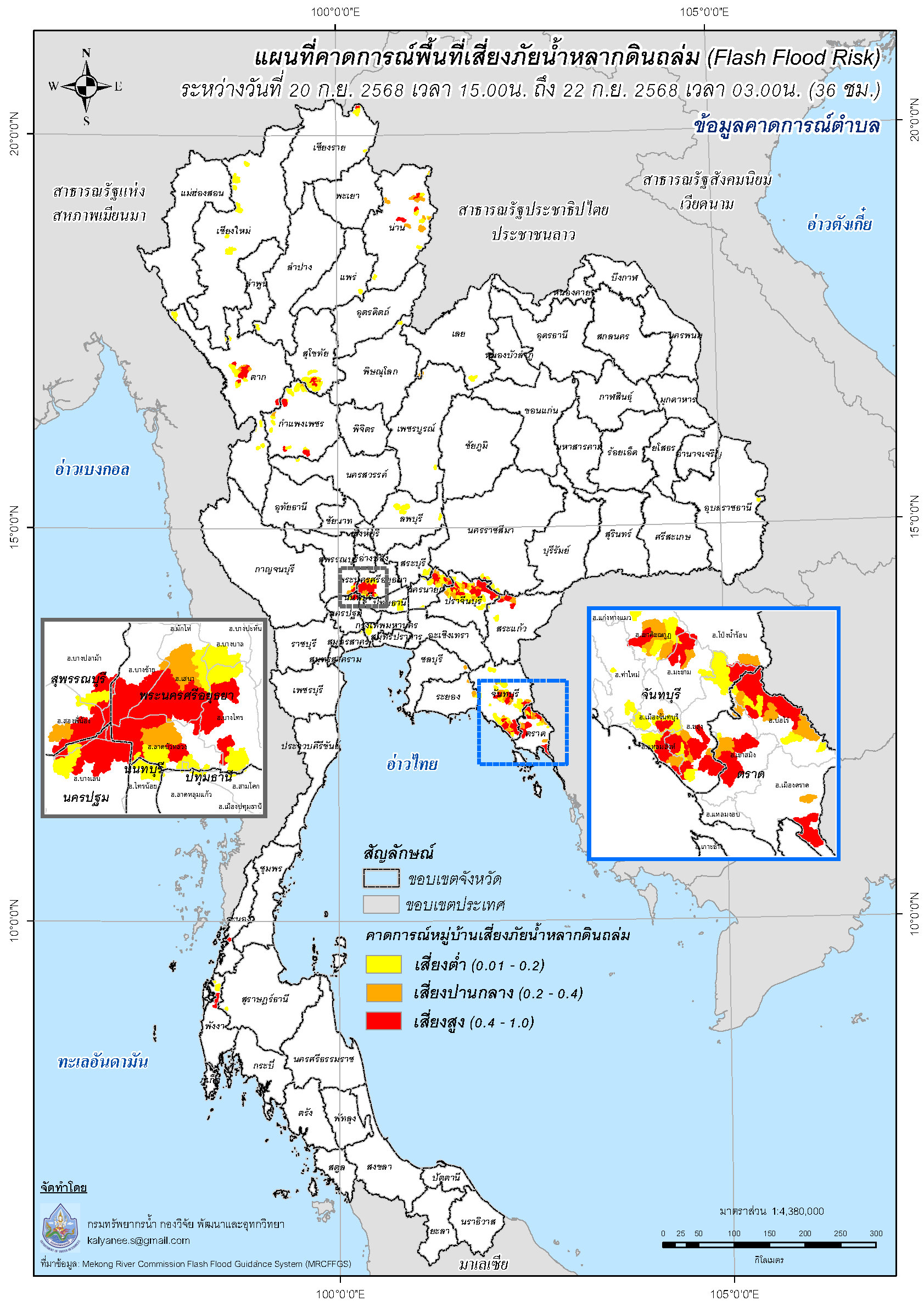 การคาดการณ์ตำบล/หมู่บ้านเสี่ยงภัยน้ำหลากดินถล่ม (Flash Flood Risk) 20 - 22 กันยายน 2568