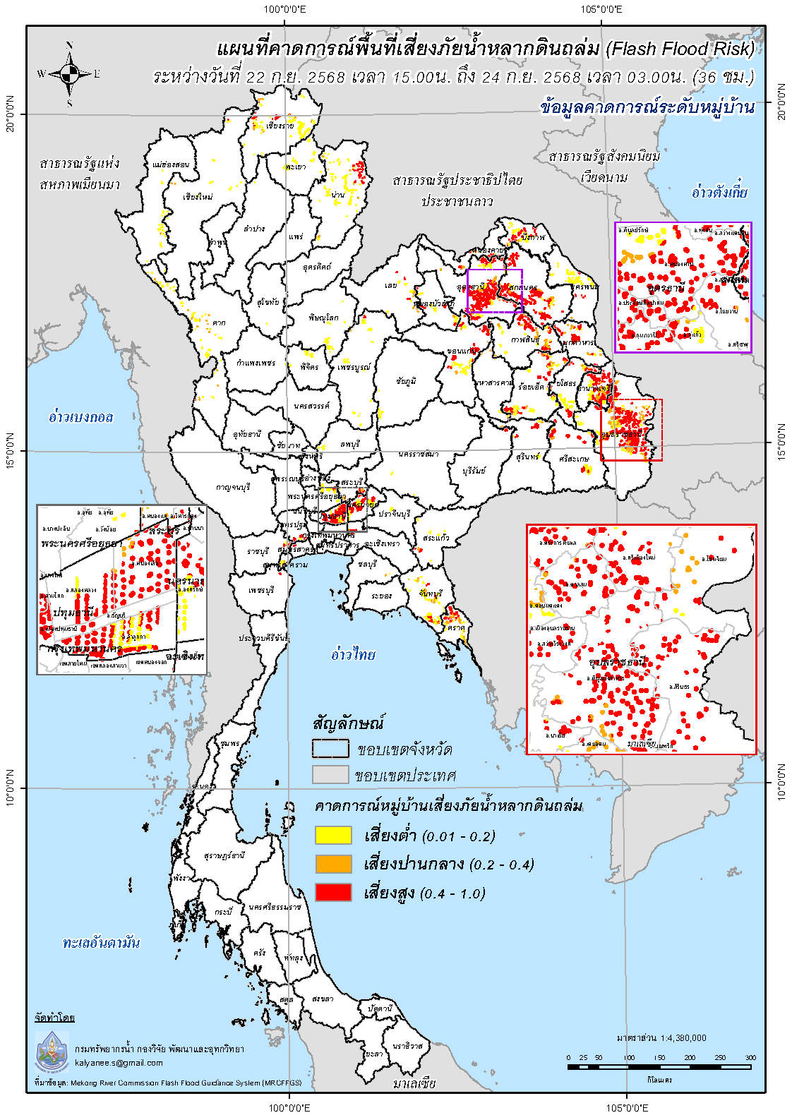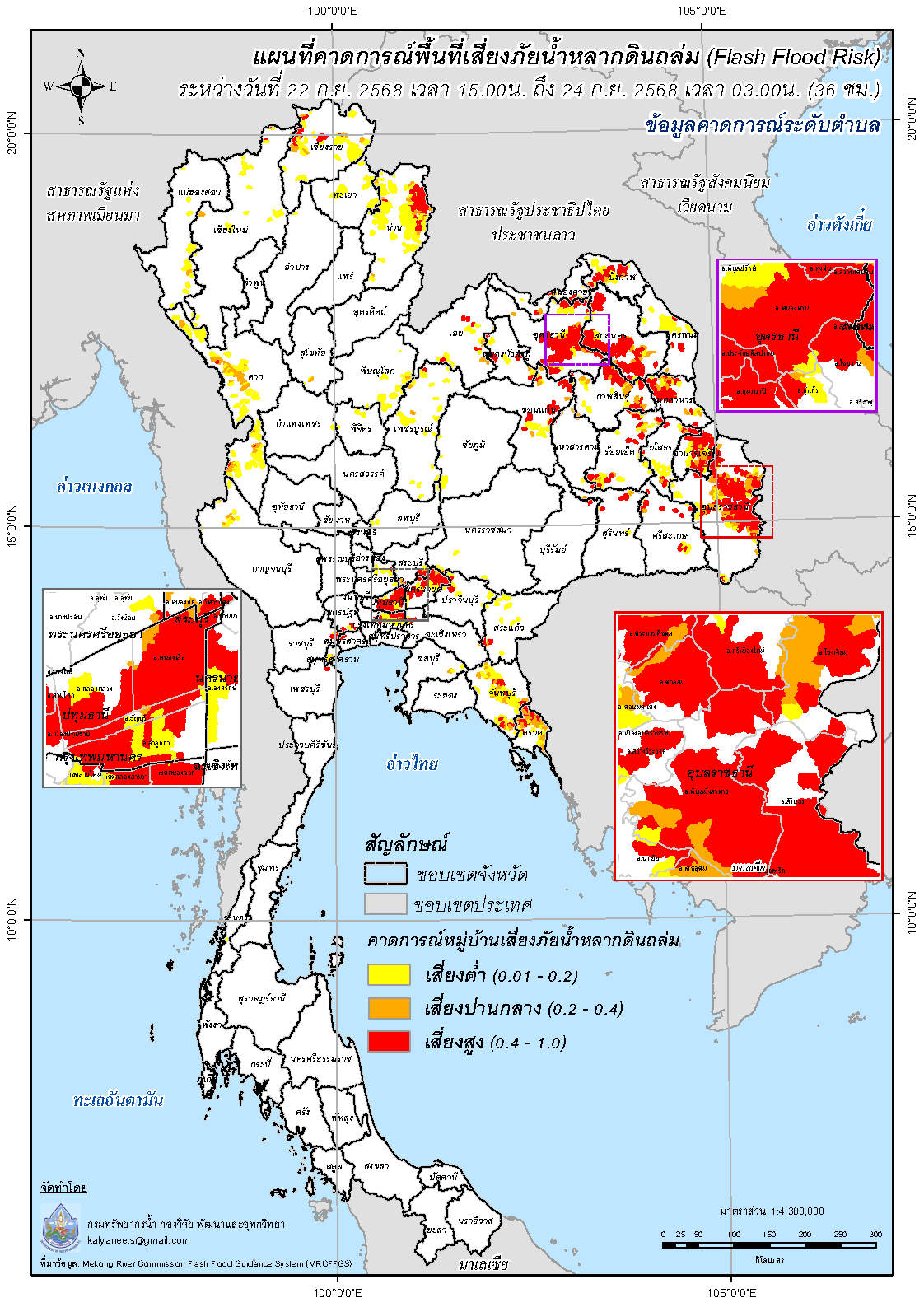 การคาดการณ์ตำบล/หมู่บ้านเสี่ยงภัยน้ำหลากดินถล่ม (Flash Flood Risk) 22 - 24 กันยายน 2568