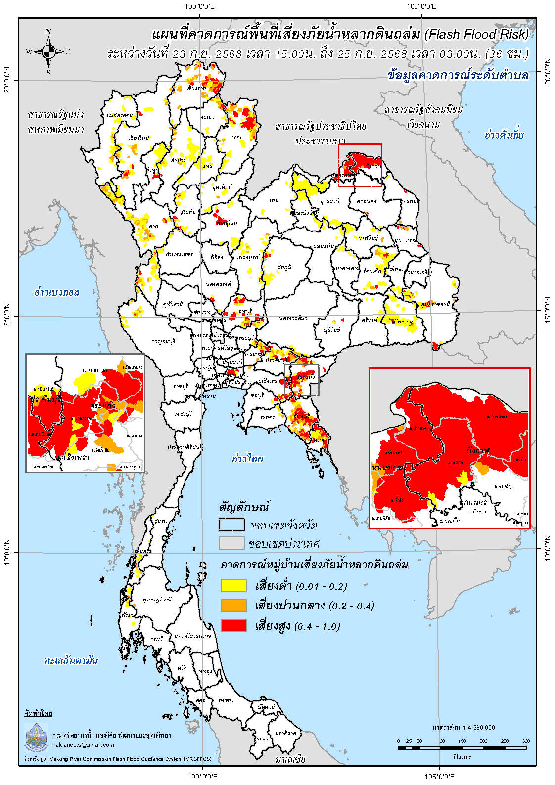 คาดการณ์พื้นที่เสี่ยงภัยน้ำหลากดินถล่ม (Flash Flood Risk) ระดับตำบล และระดับหมู่บ้าน วันที่ 23 - 25 กันยายน 2568 |