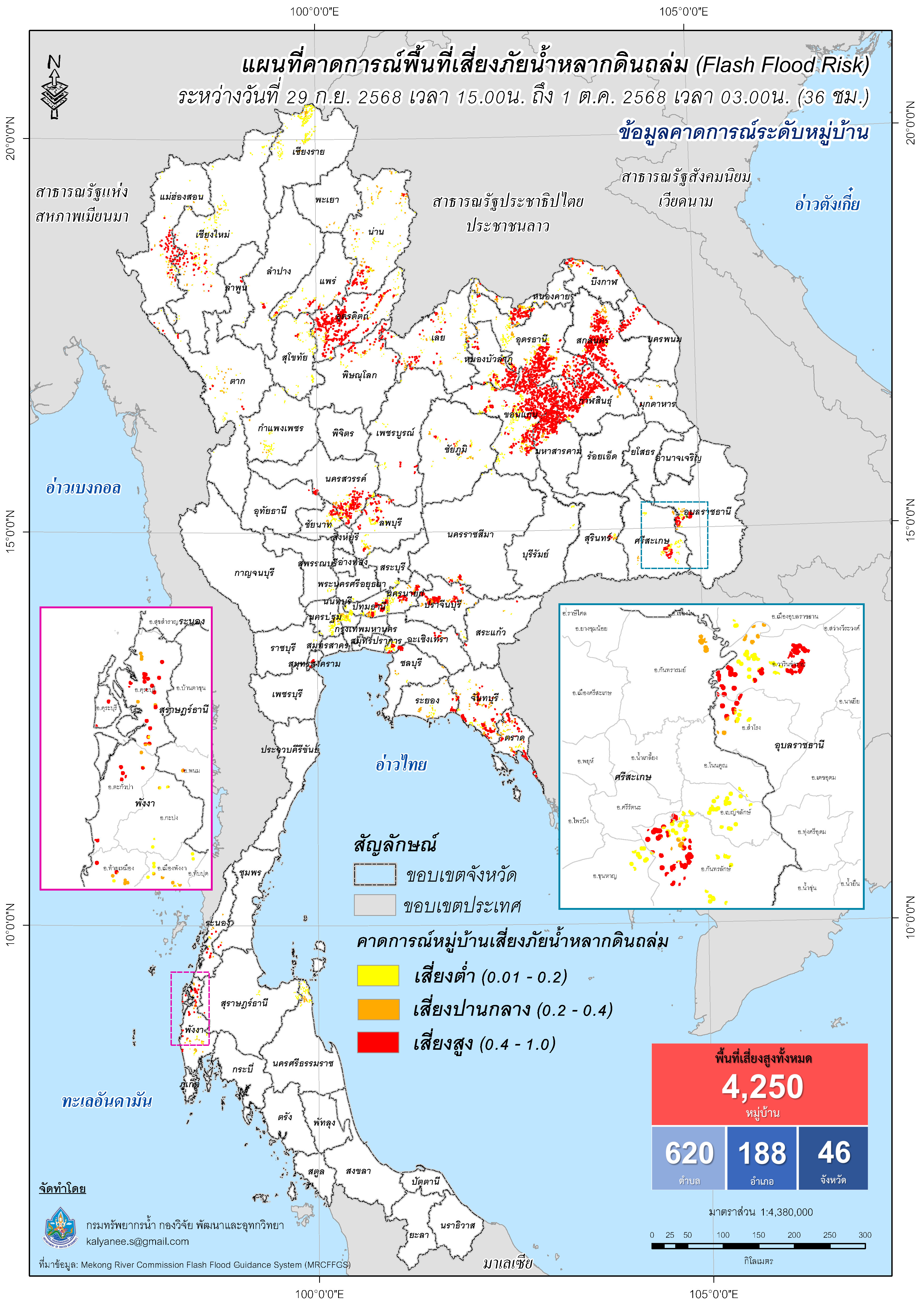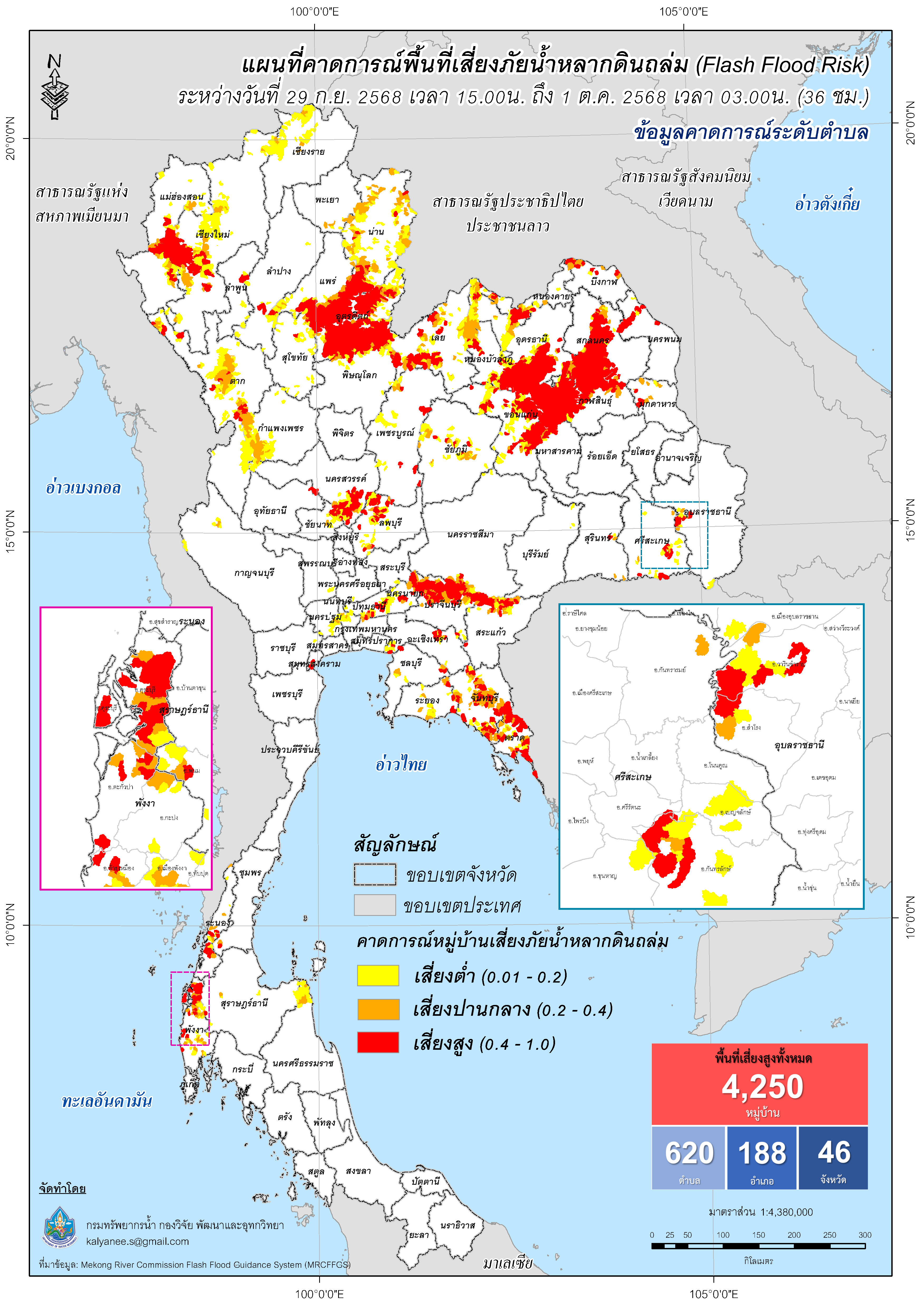 คาดการณ์พื้นที่เสี่ยงภัยน้ำหลากดินถล่ม (Flash Flood Risk) ระดับตำบล และระดับหมู่บ้าน วันที่ 29 กันยายน - 1 ตุลาคม 2568
