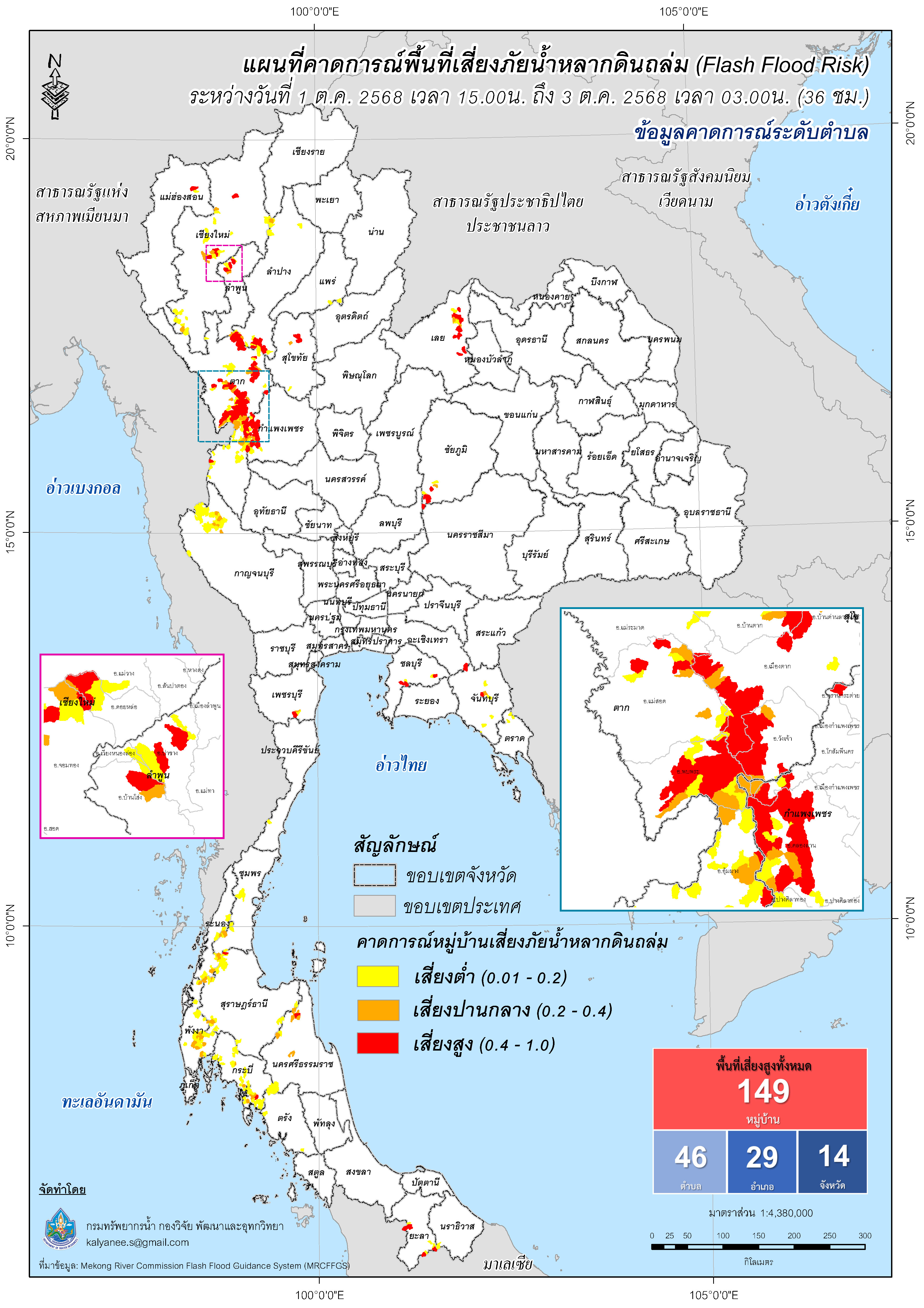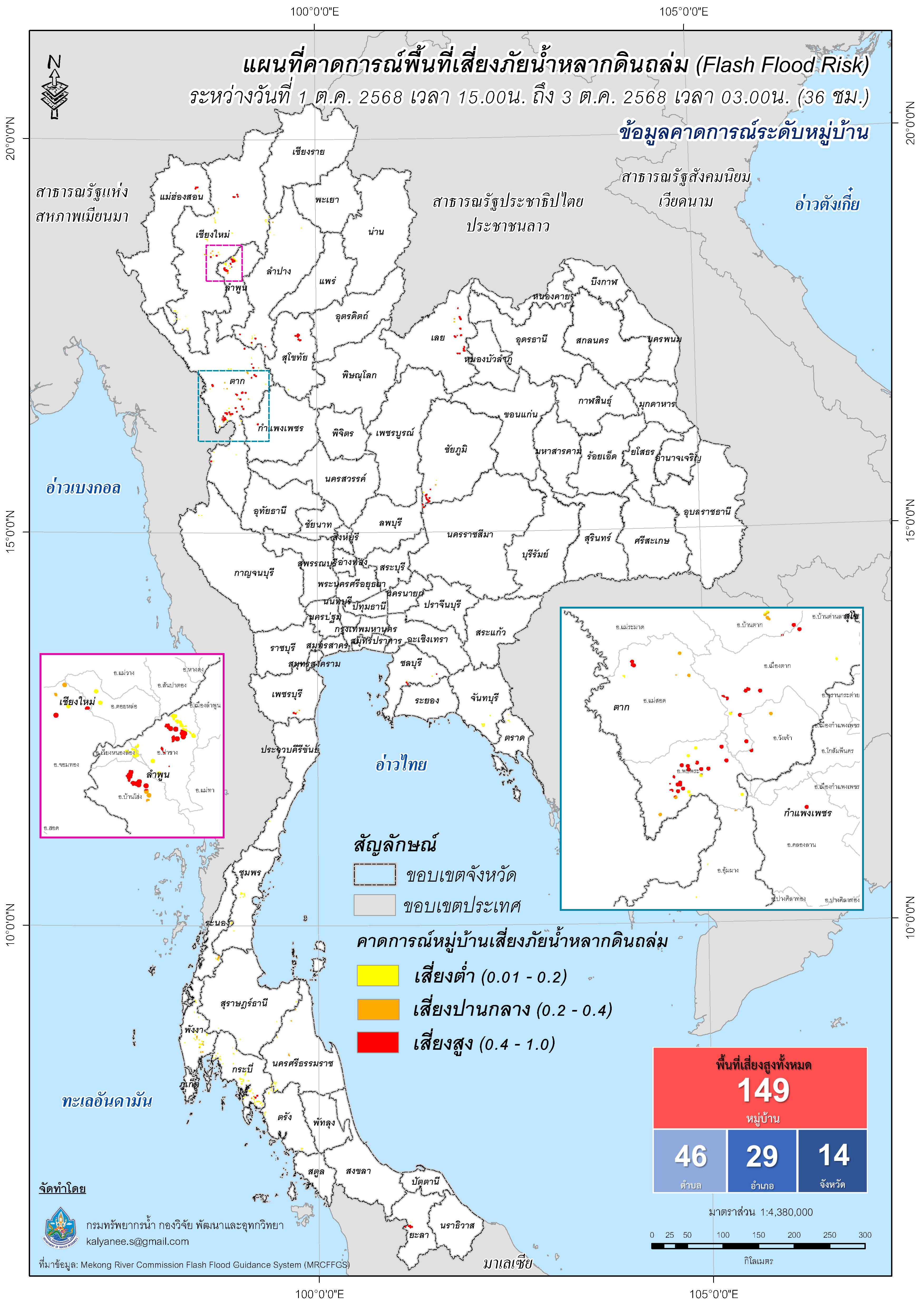 คาดการณ์พื้นที่เสี่ยงภัยน้ำหลากดินถล่ม (Flash Flood Risk) ระดับตำบล และระดับหมู่บ้าน วันที่ 1 - 3 ตุลาคม 2568