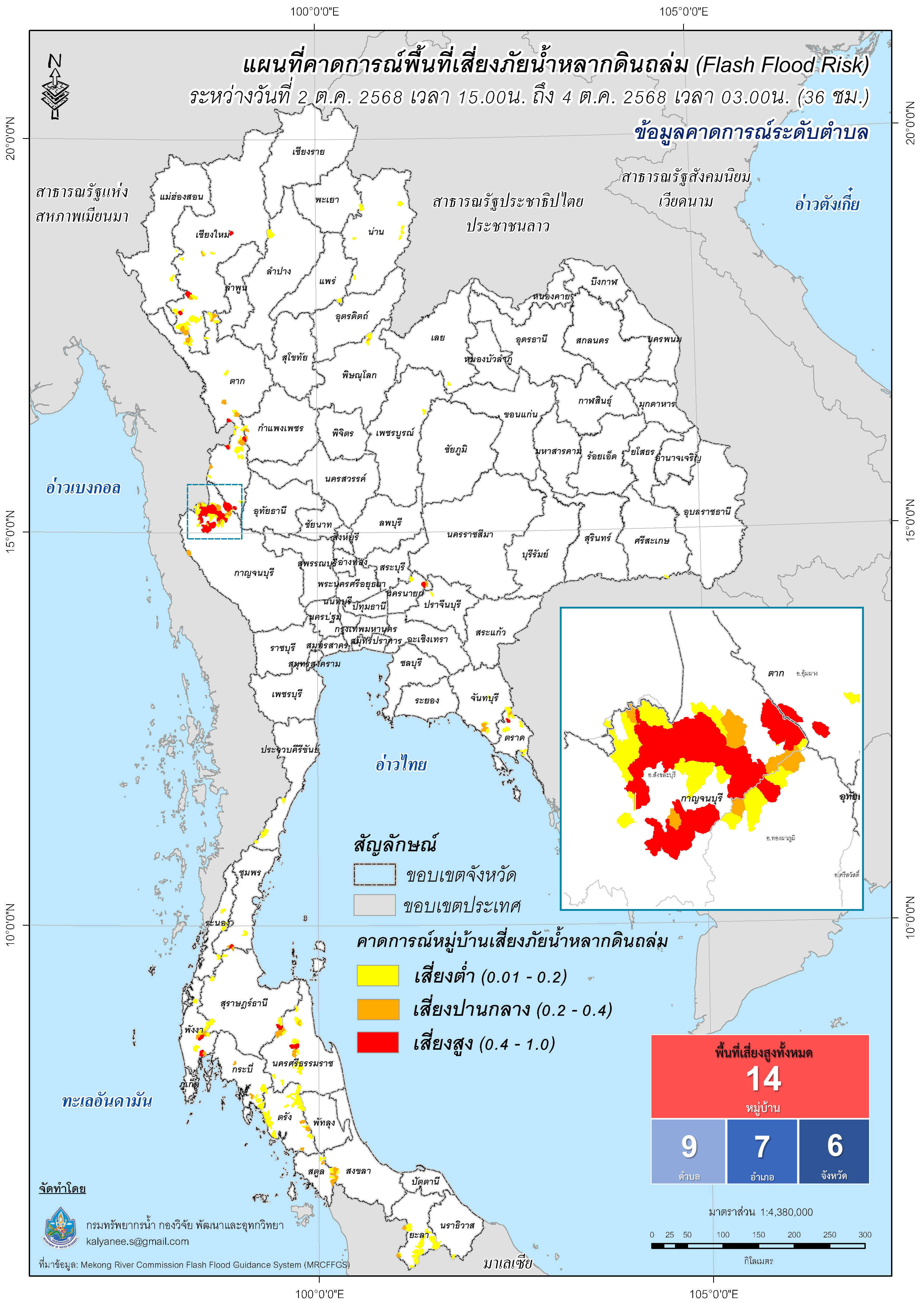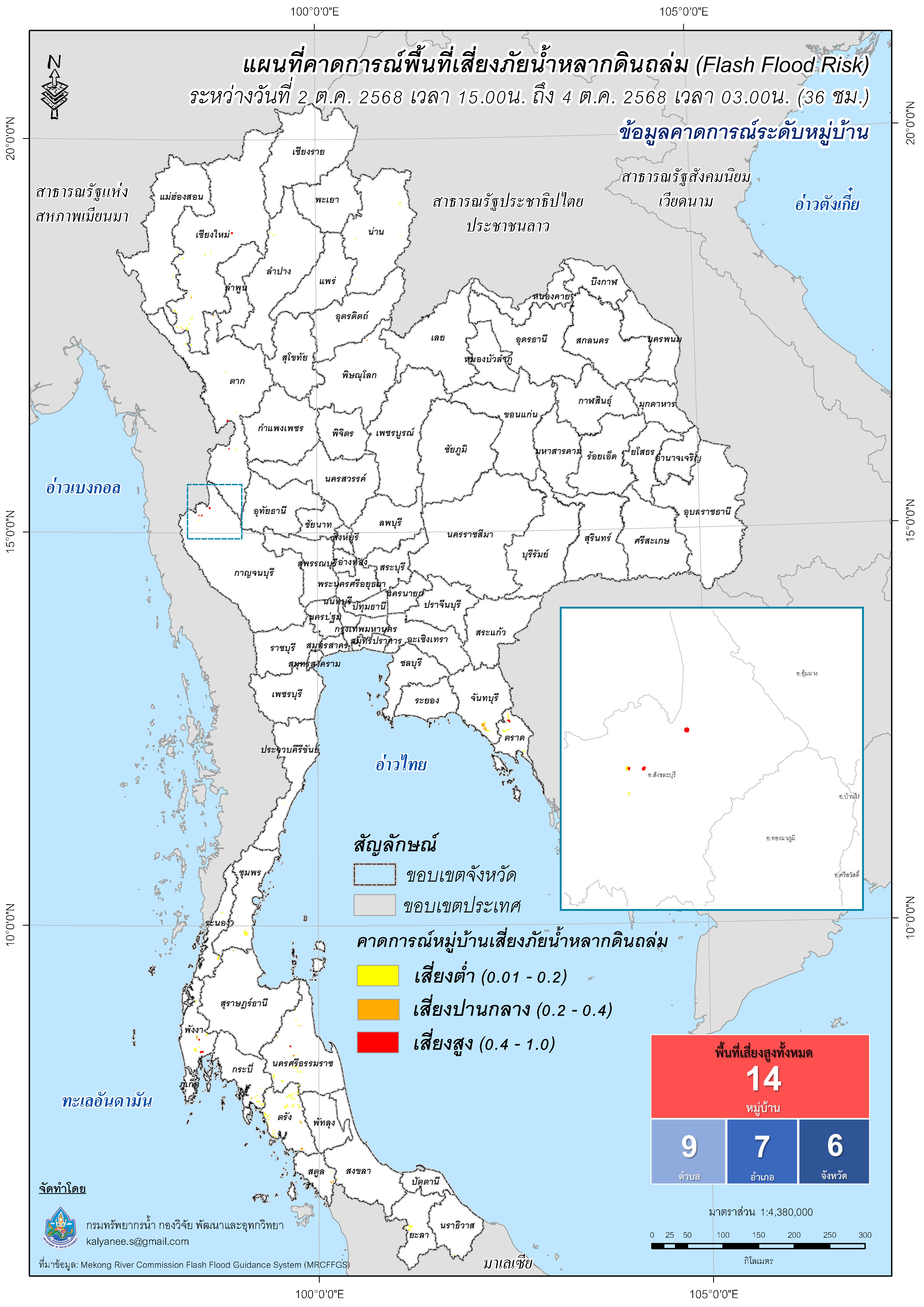 คาดการณ์พื้นที่เสี่ยงภัยน้ำหลากดินถล่ม (Flash Flood Risk) ระดับตำบล และระดับหมู่บ้าน วันที่ 2 - 4 ตุลาคม 2568