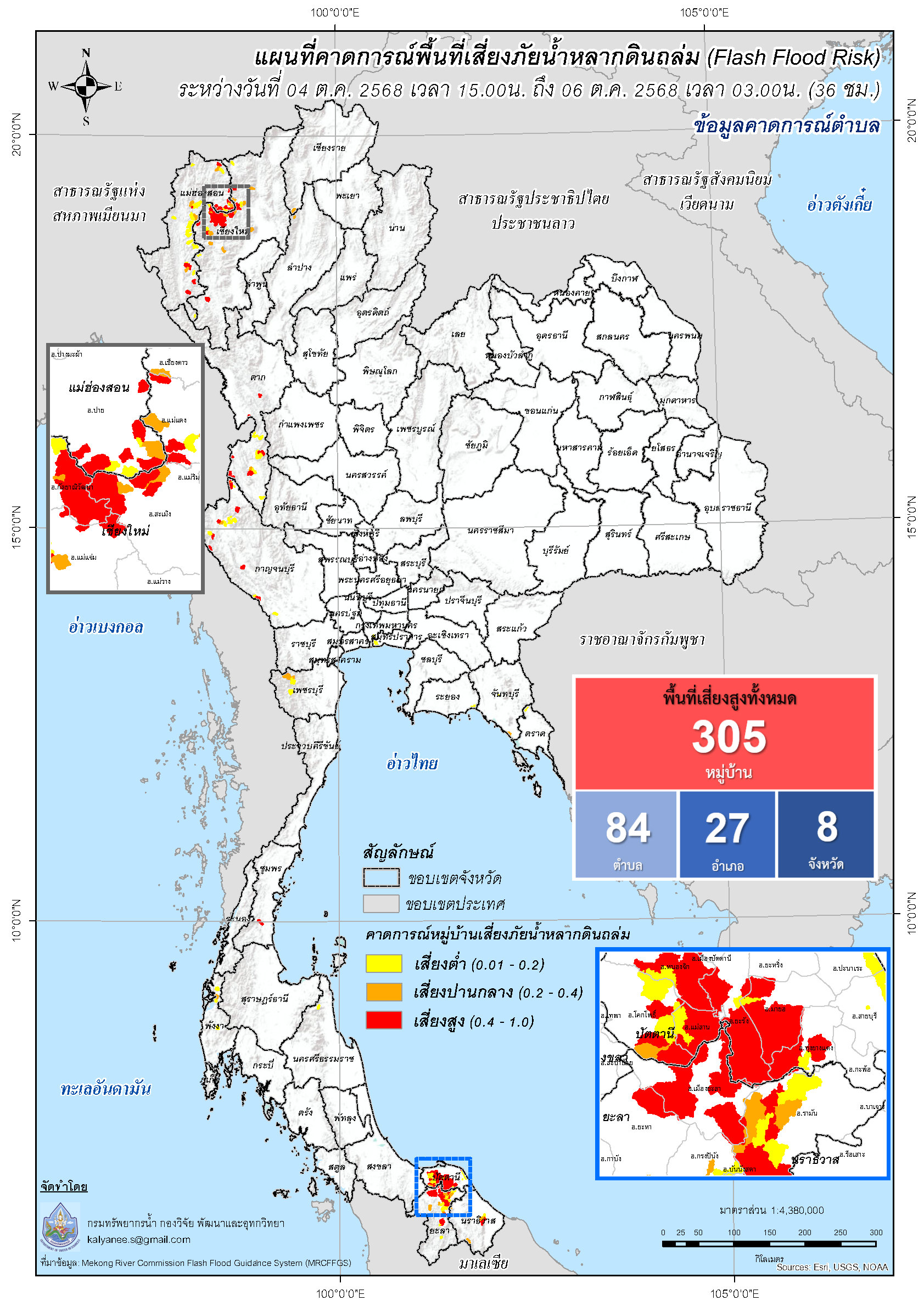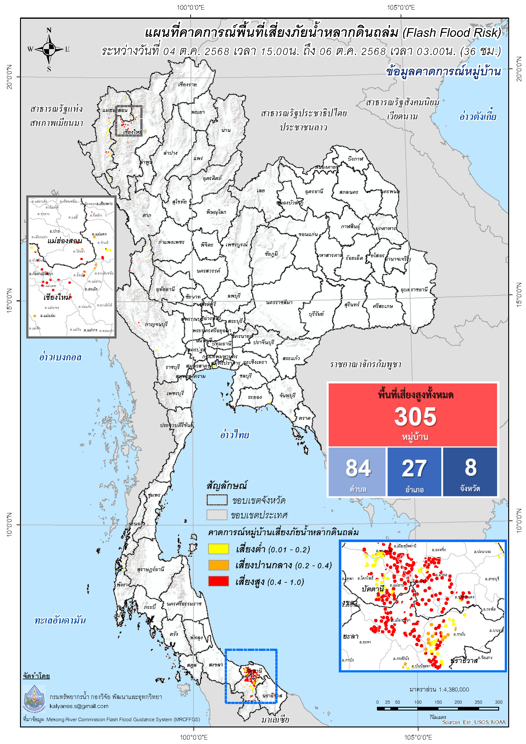 คาดการณ์พื้นที่เสี่ยงภัยน้ำหลากดินถล่ม (Flash Flood Risk) ระดับตำบล และระดับหมู่บ้าน วันที่ 4-6 ตุลาคม 2568 (36 ชม./ 03.00น.) |