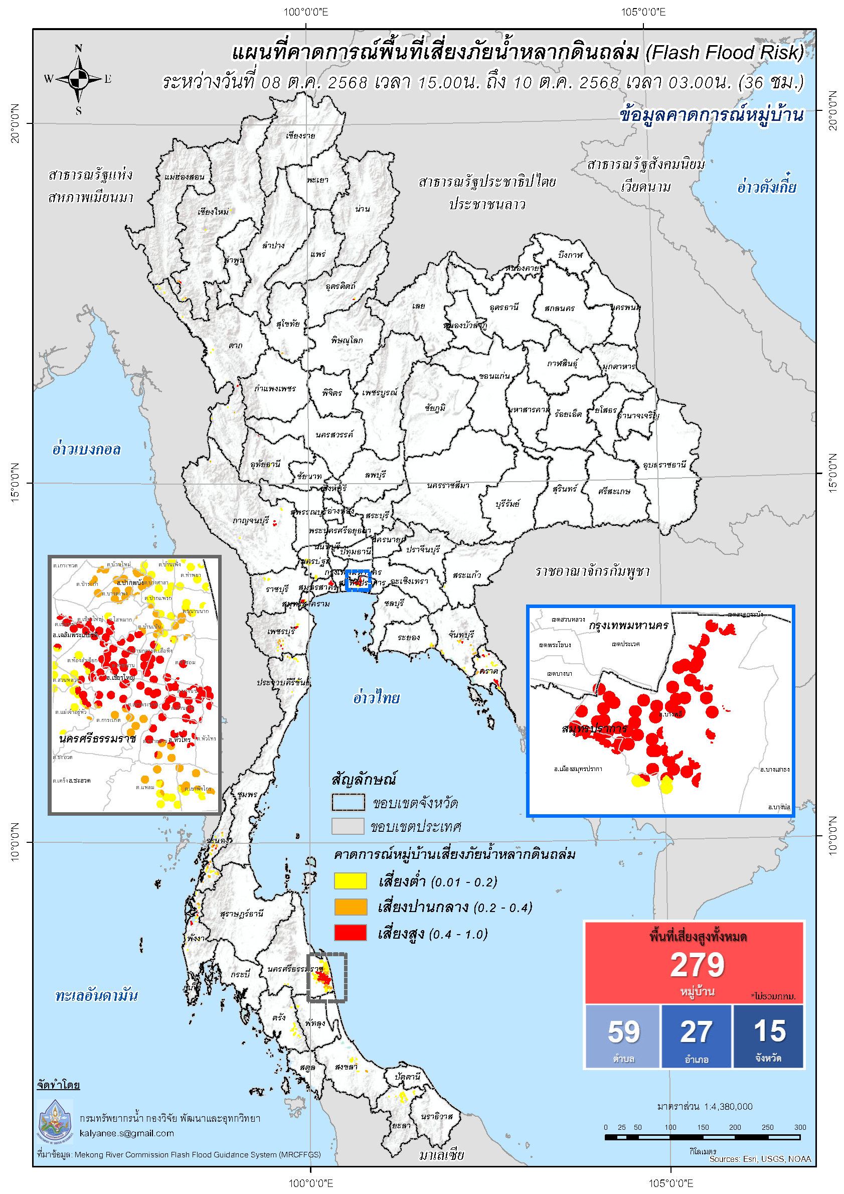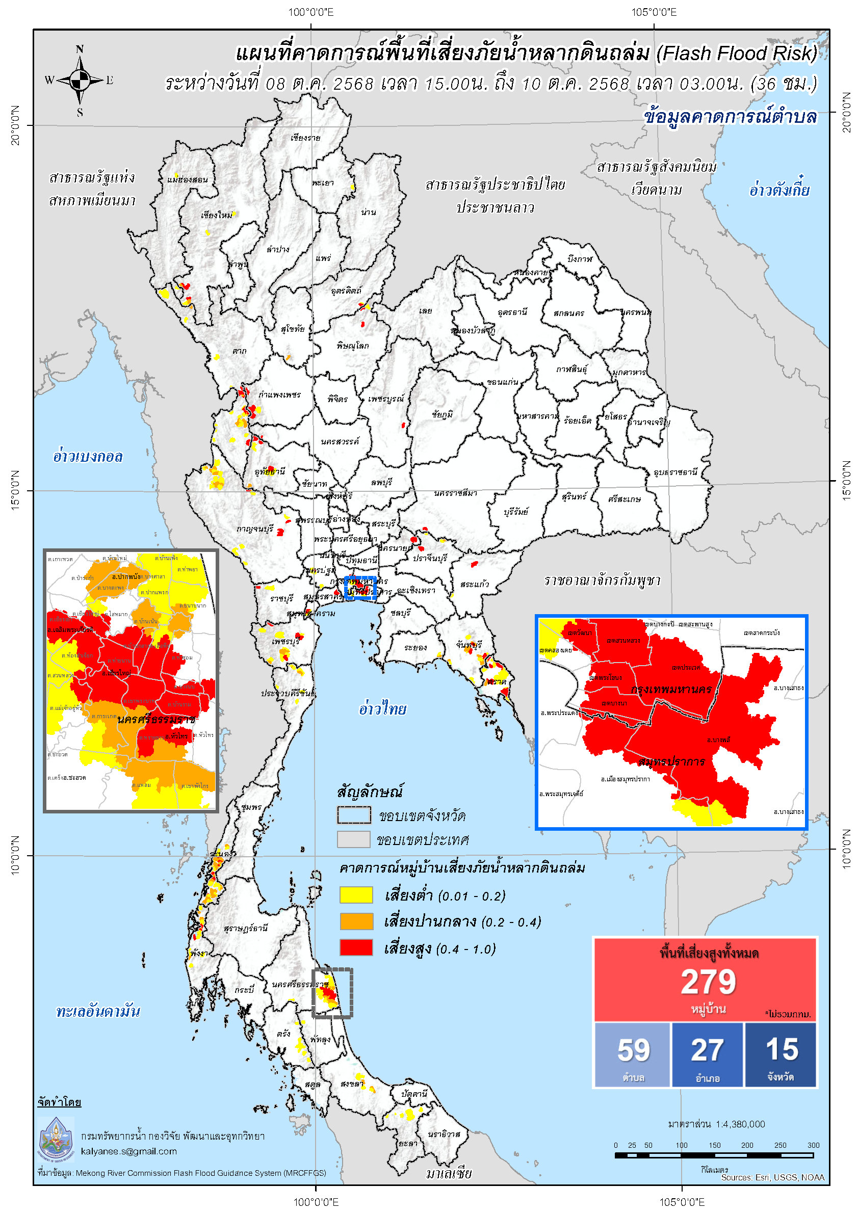 การคาดการณ์ตำบล/หมู่บ้านเสี่ยงภัยน้ำหลากดินถล่ม (Flash Flood Risk) 8 - 10 ตุลาคม 2568
