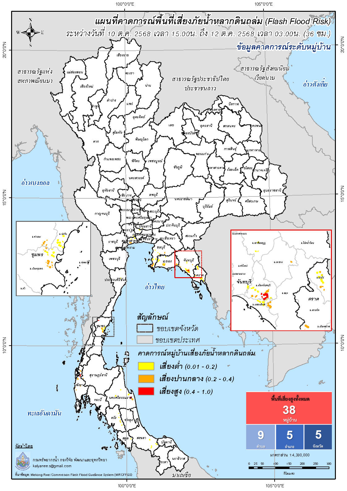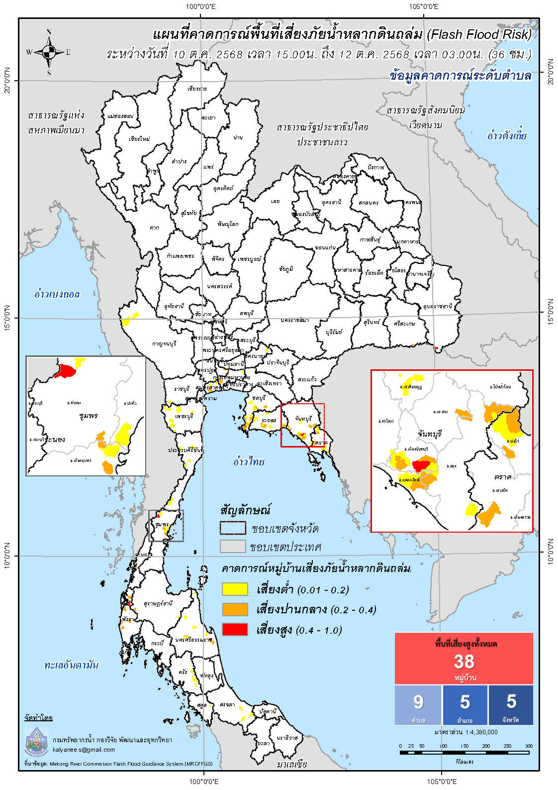 คาดการณ์พื้นที่เสี่ยงภัยน้ำหลากดินถล่ม (Flash Flood Risk) ระดับตำบล และระดับหมู่บ้าน วันที่ 10 - 12 ตุลาคม 2568 (36 ชม./ 03.00น.) |