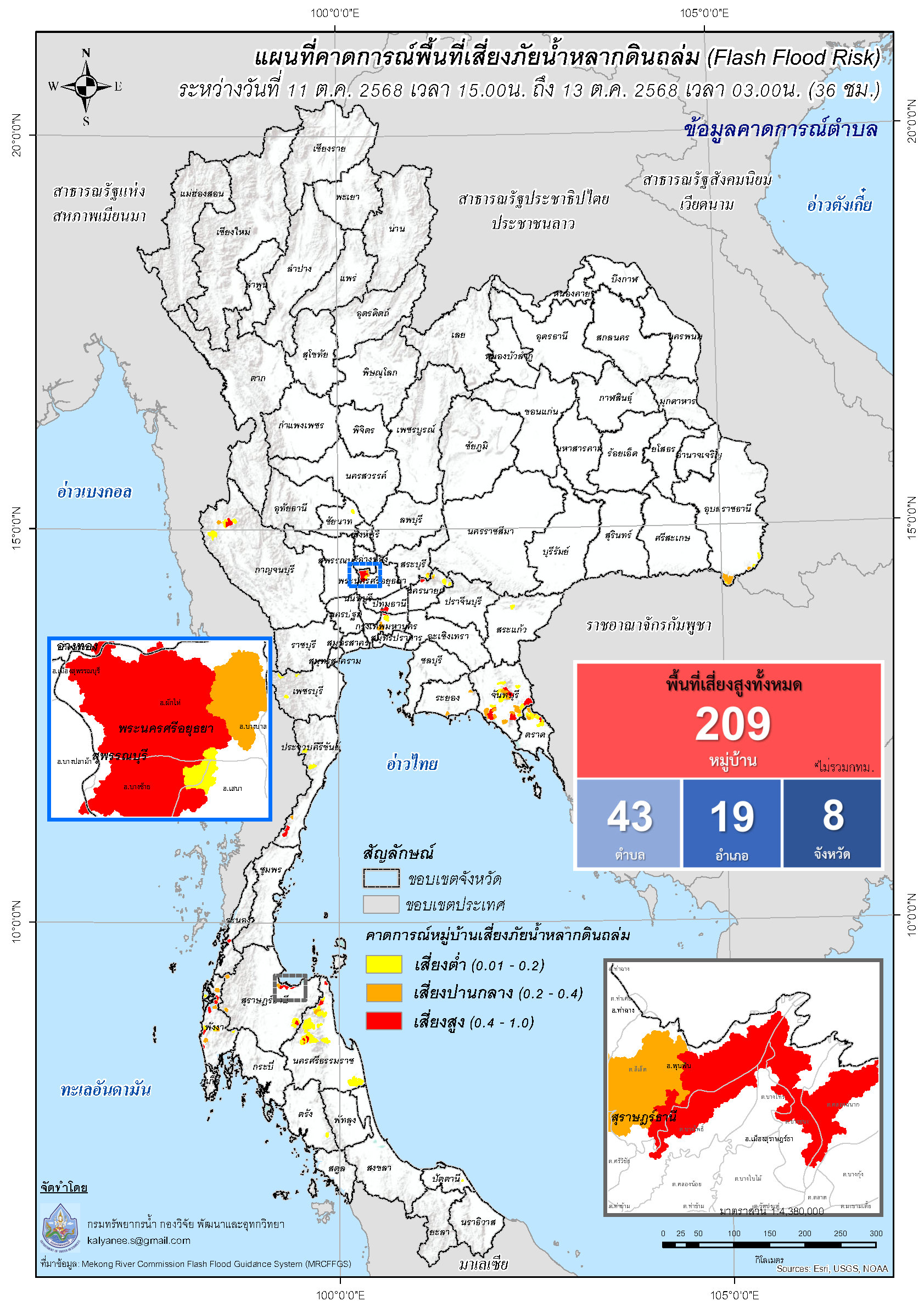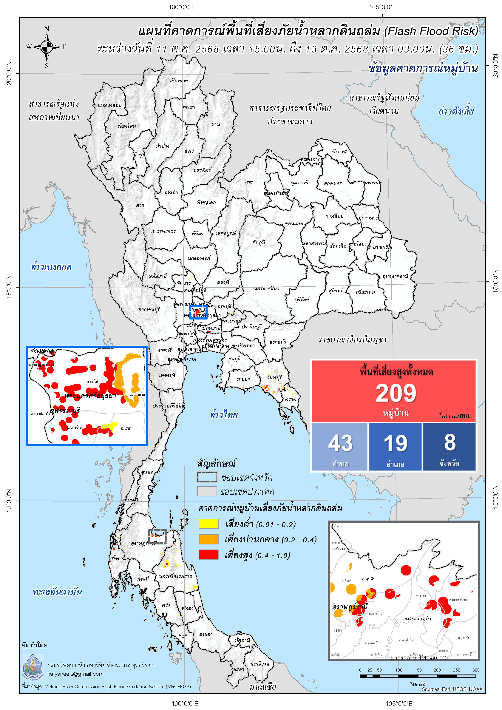 การคาดการณ์ตำบล/หมู่บ้านเสี่ยงภัยน้ำหลากดินถล่ม (Flash Flood Risk) 11 - 13 ตุลาคม 2568