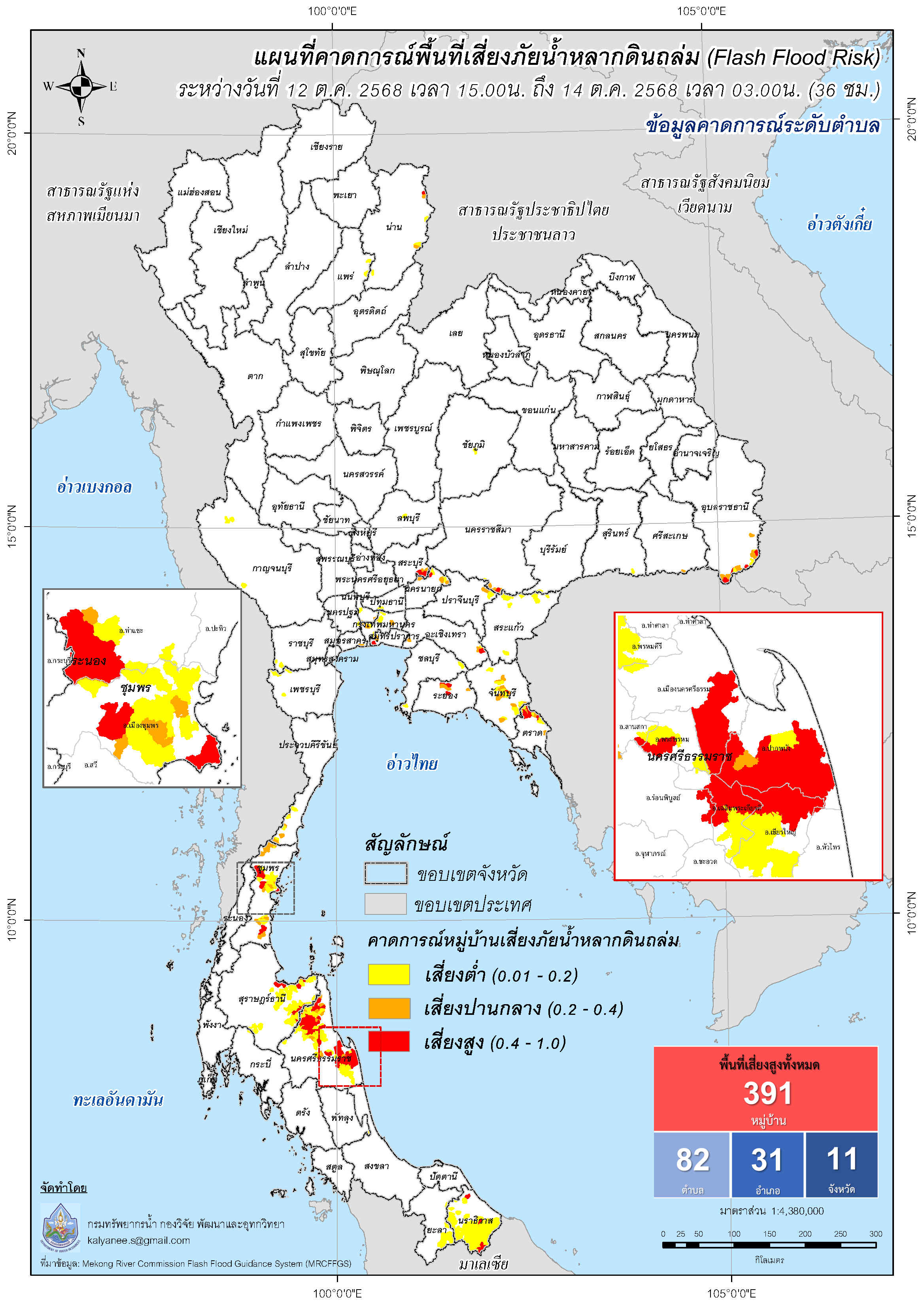 การคาดการณ์ตำบล/หมู่บ้านเสี่ยงภัยน้ำหลากดินถล่ม (Flash Flood Risk) 12 - 14 ตุลาคม 2568