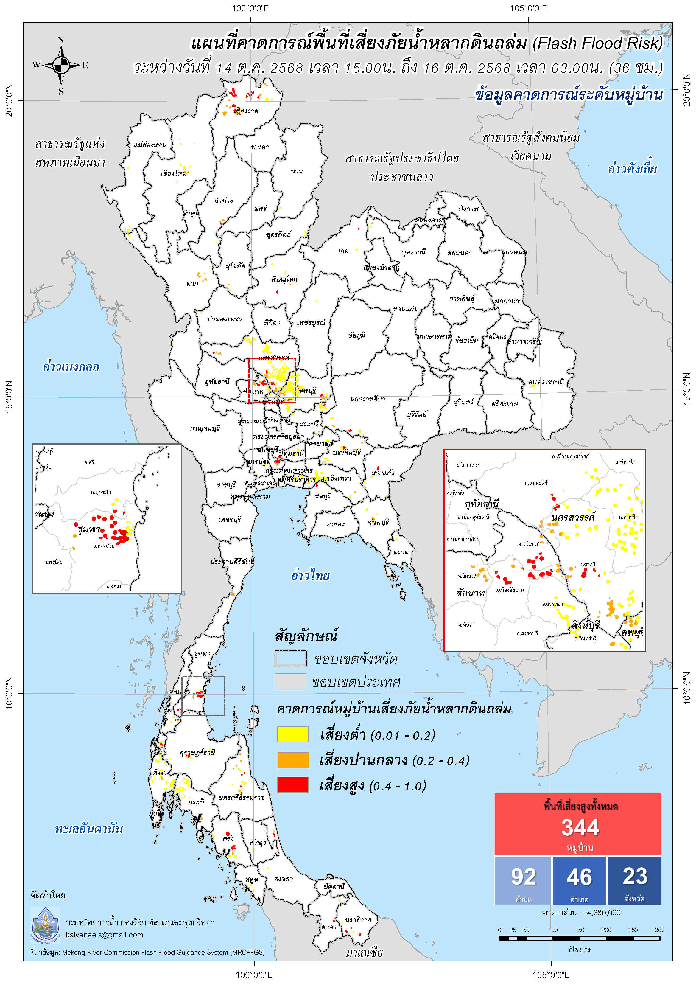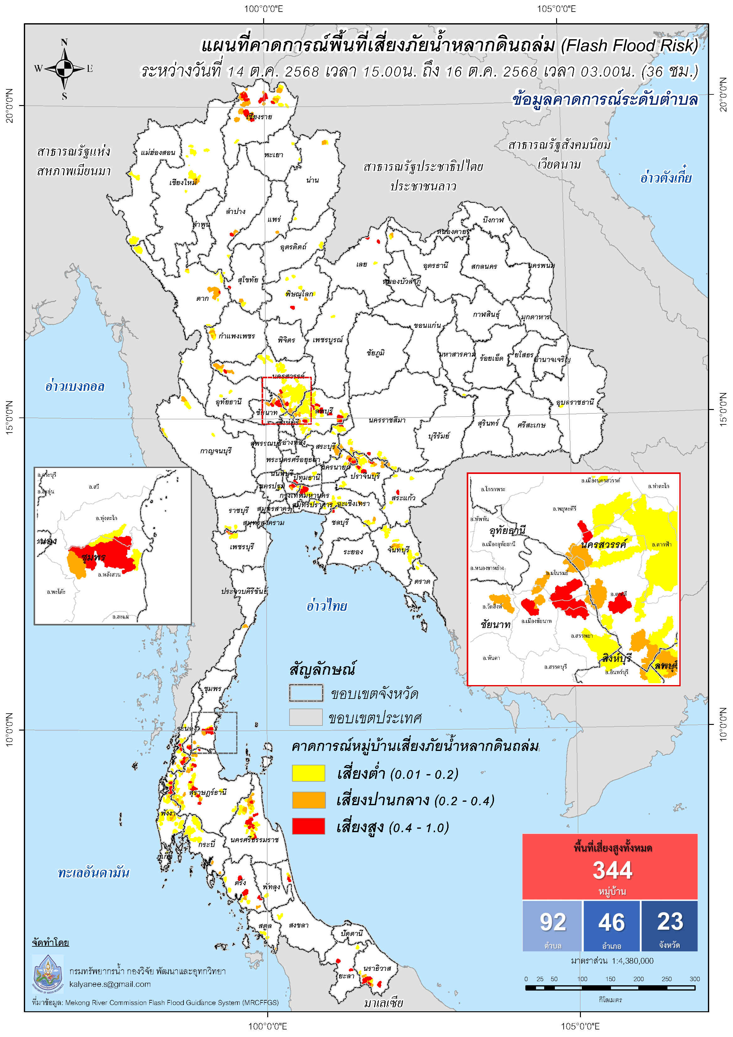 คาดการณ์พื้นที่เสี่ยงภัยน้ำหลากดินถล่ม (Flash Flood Risk) ระดับตำบล และระดับหมู่บ้าน วันที่ 14 - 16 ตุลาคม 2568 (36 ชม./ 03.00น.) |
