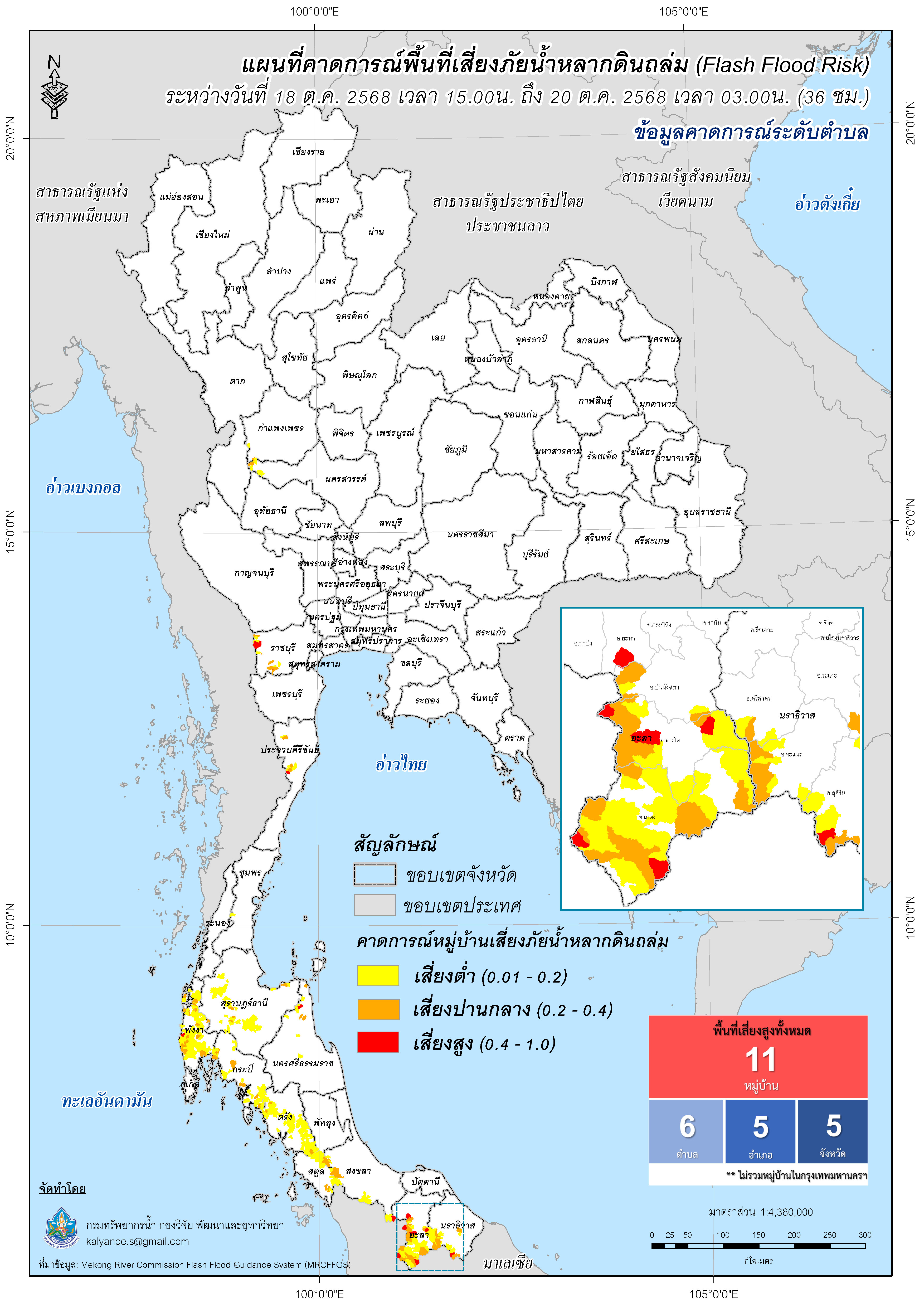 คาดการณ์พื้นที่เสี่ยงภัยน้ำหลากดินถล่ม (Flash Flood Risk) ระดับตำบล และระดับหมู่บ้าน วันที่ 18 - 20 ตุลาคม 2568 (36 ชม./ 03.00น.) |