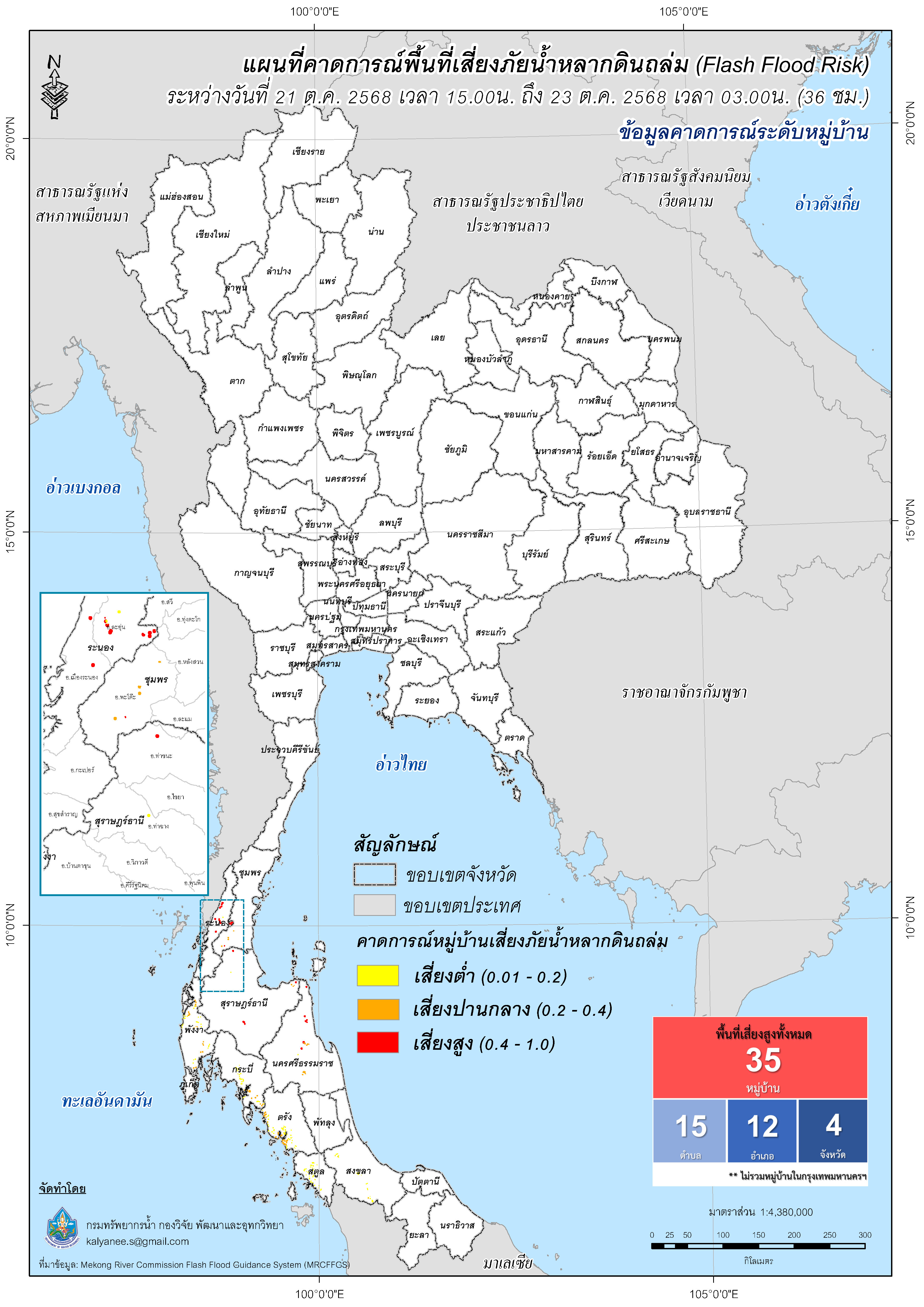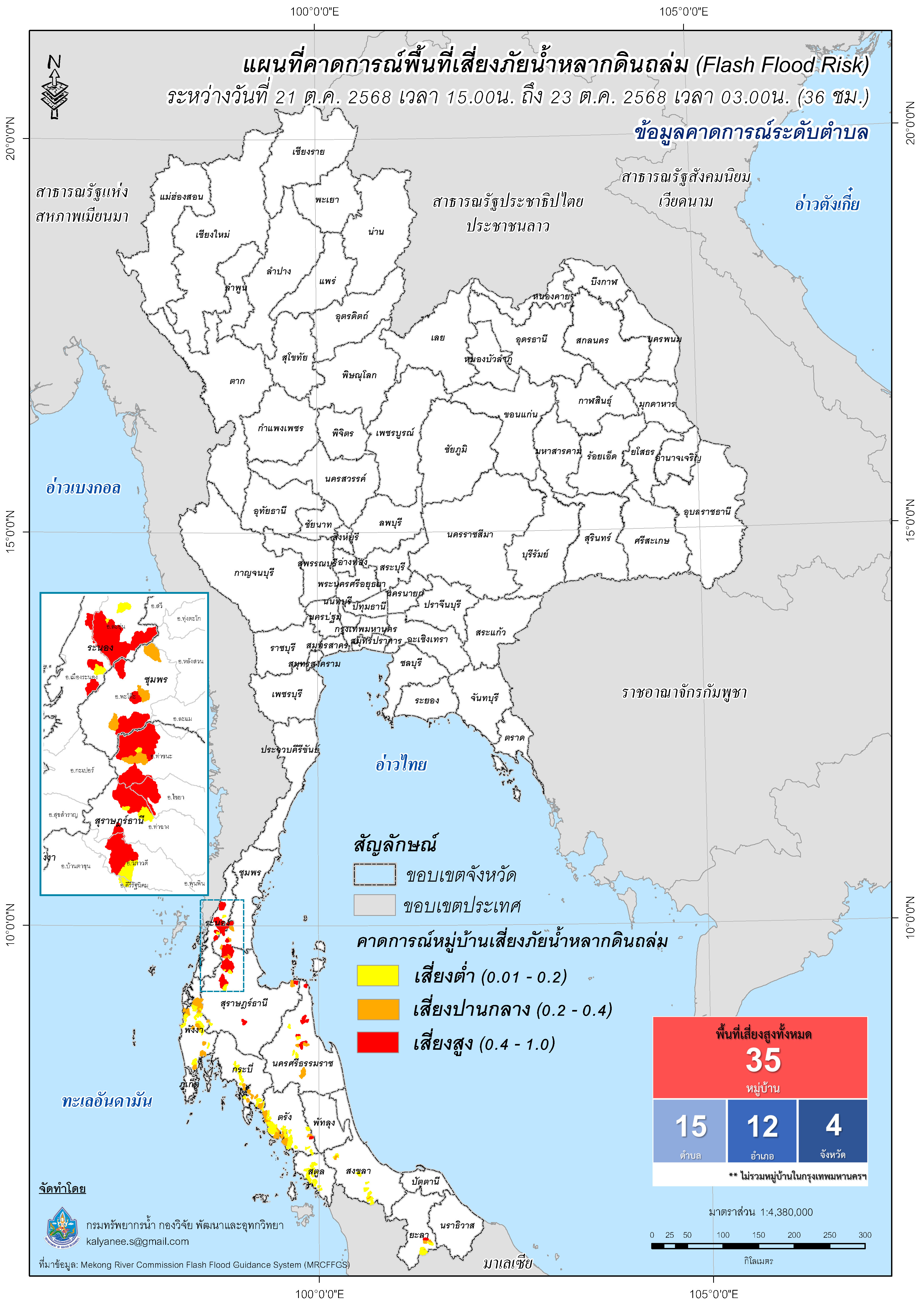 คาดการณ์พื้นที่เสี่ยงภัยน้ำหลากดินถล่ม (Flash Flood Risk) ระดับตำบล และระดับหมู่บ้าน วันที่ 21 - 23 ตุลาคม 2568 (36 ชม./ 03.00น.) |