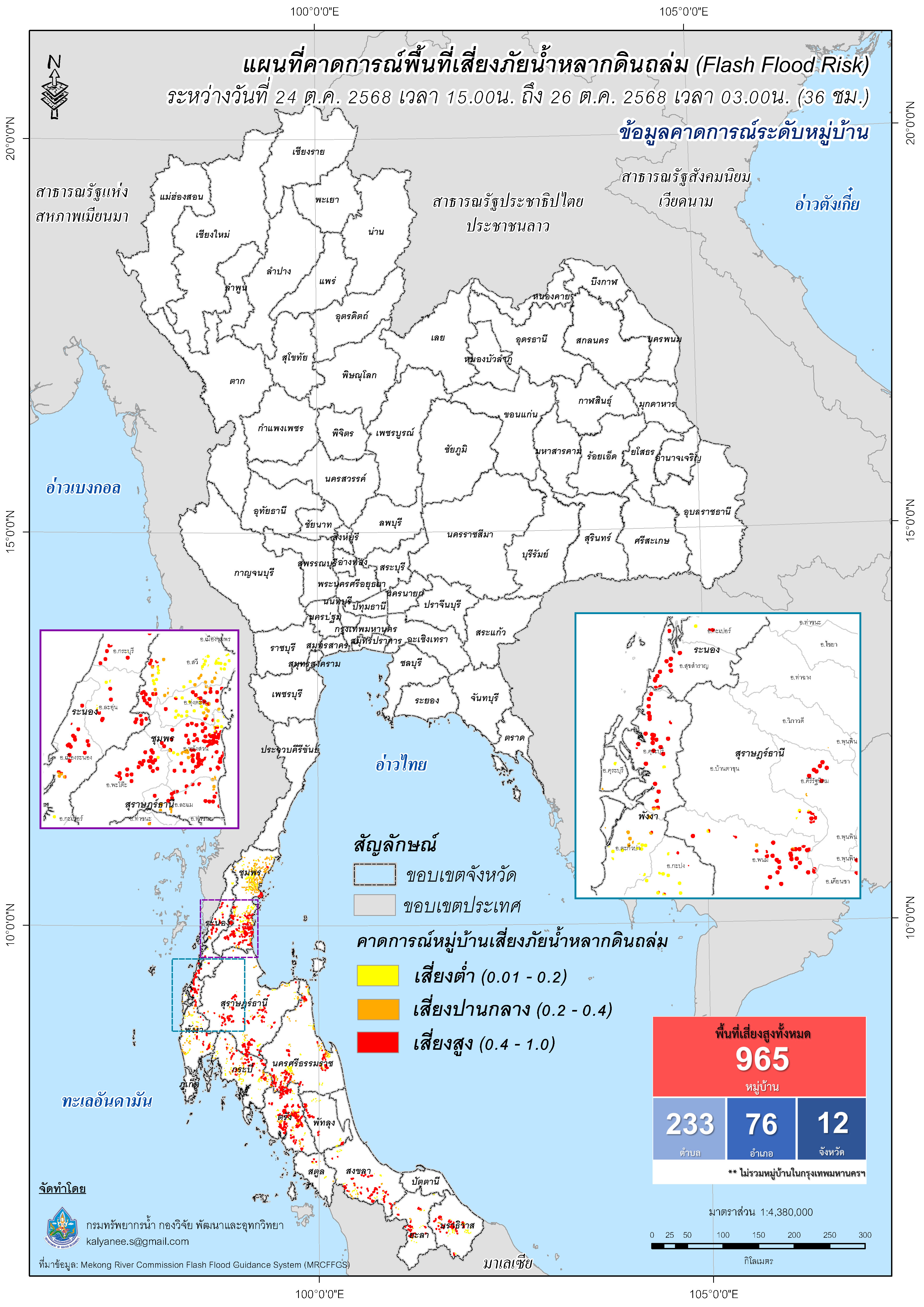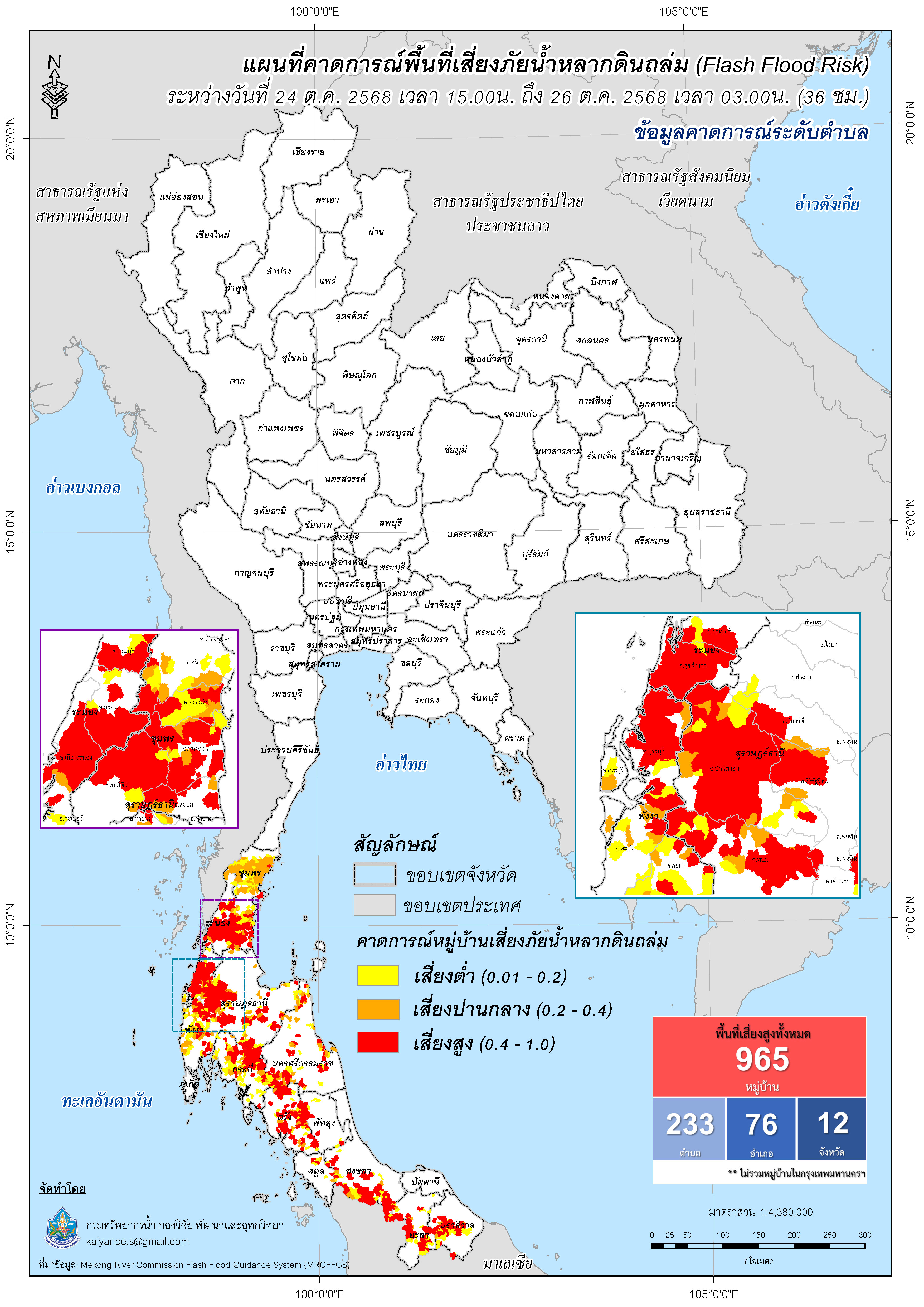 คาดการณ์พื้นที่เสี่ยงภัยน้ำหลากดินถล่ม (Flash Flood Risk) ระดับตำบล และระดับหมู่บ้าน วันที่ 24 - 26 ตุลาคม 2568 (36 ชม./ 03.00น.) |