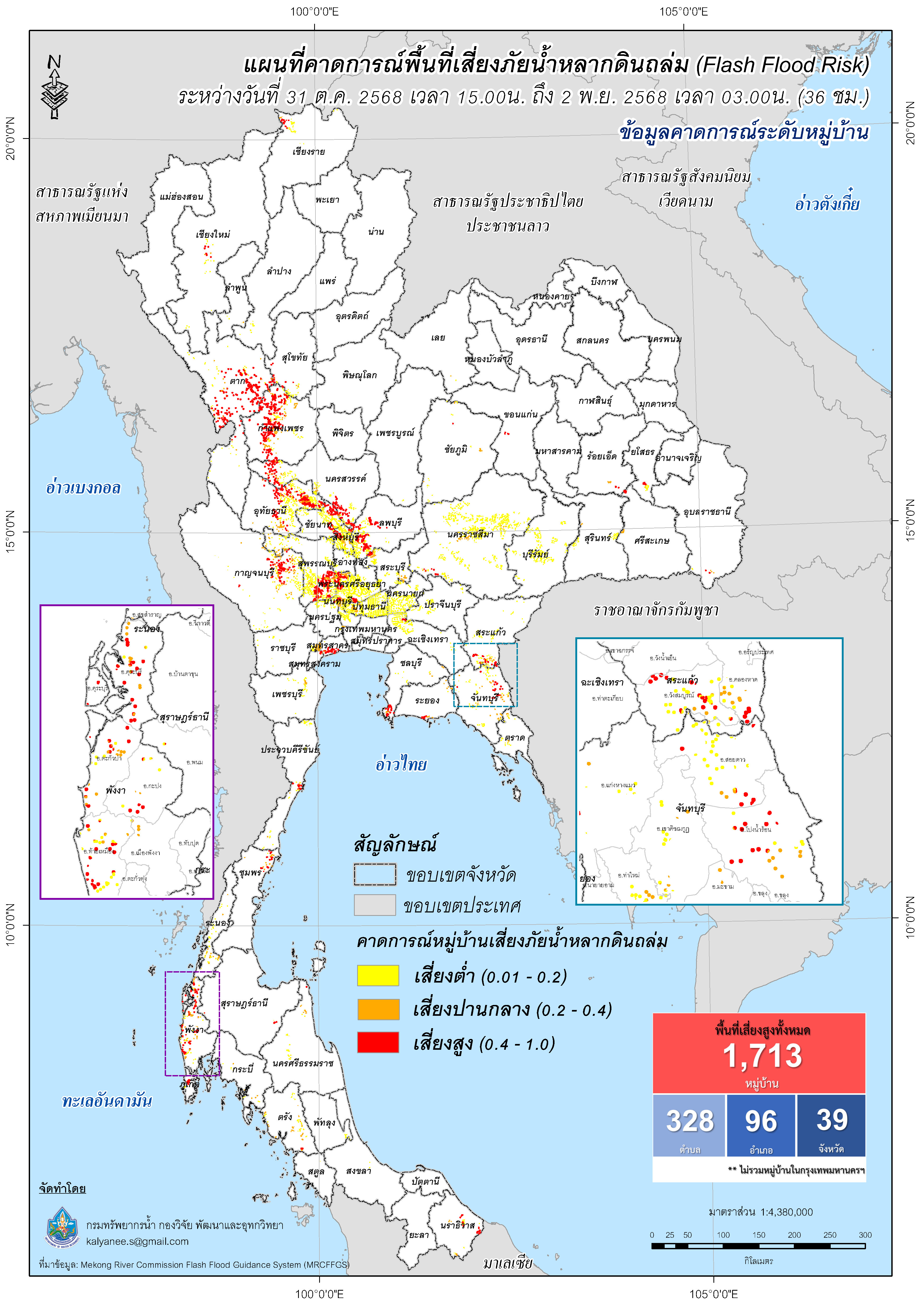 การคาดการณ์ตำบล/หมู่บ้านเสี่ยงภัยน้ำหลากดินถล่ม (Flash Flood Risk) 31 ตุลาคม - 2 พฤศจิกายน 2568
