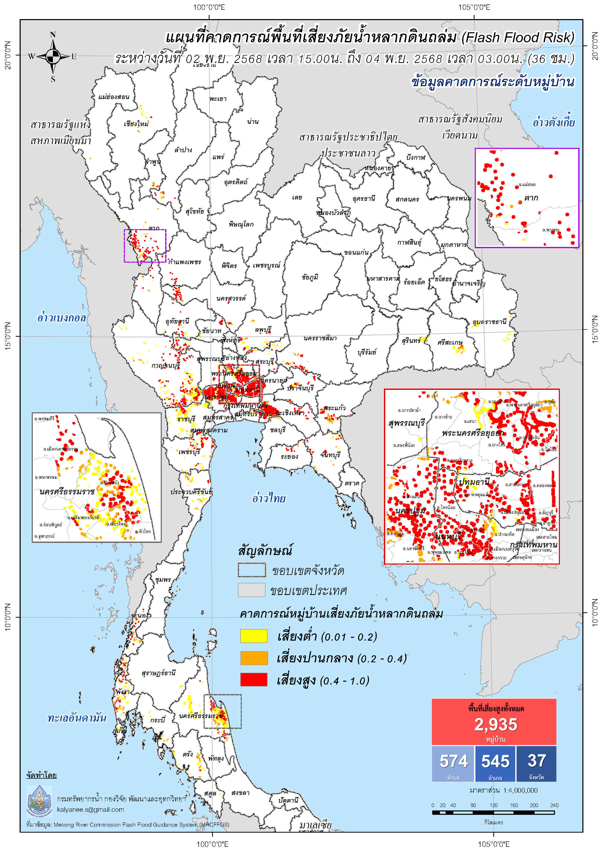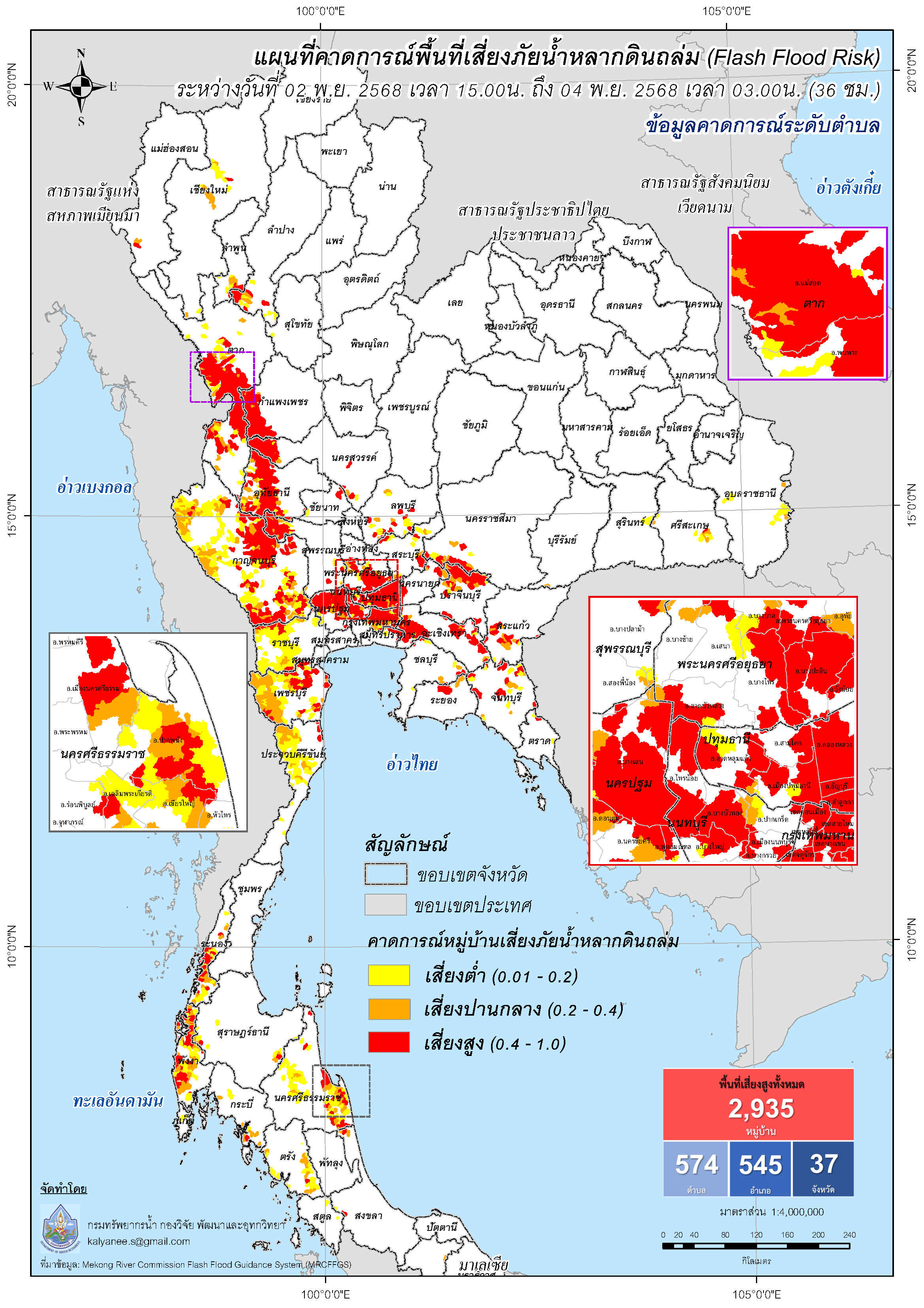 การคาดการณ์ตำบล/หมู่บ้านเสี่ยงภัยน้ำหลากดินถล่ม (Flash Flood Risk) 2 พฤศจิกายน - 4 พฤศจิกายน 2568