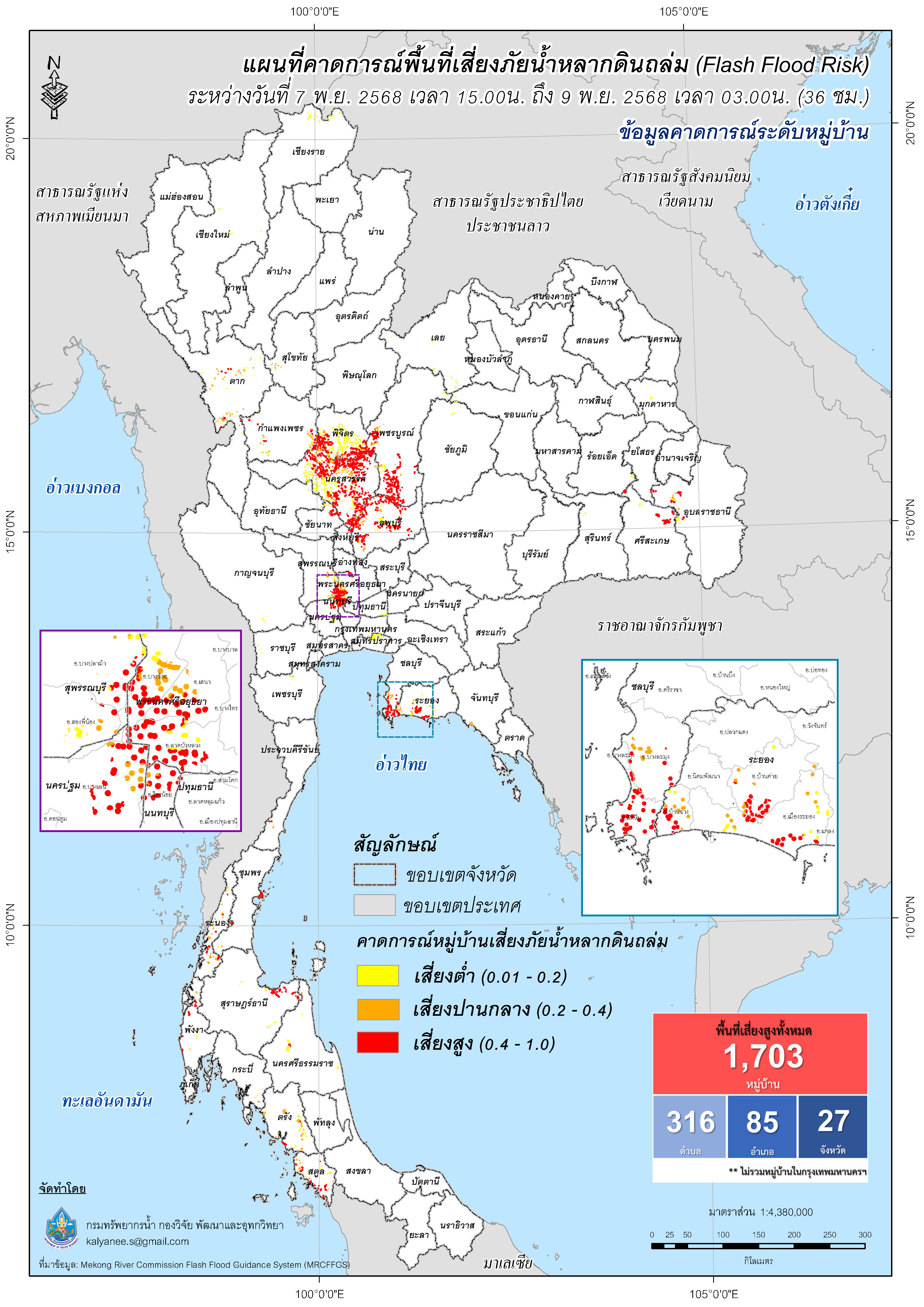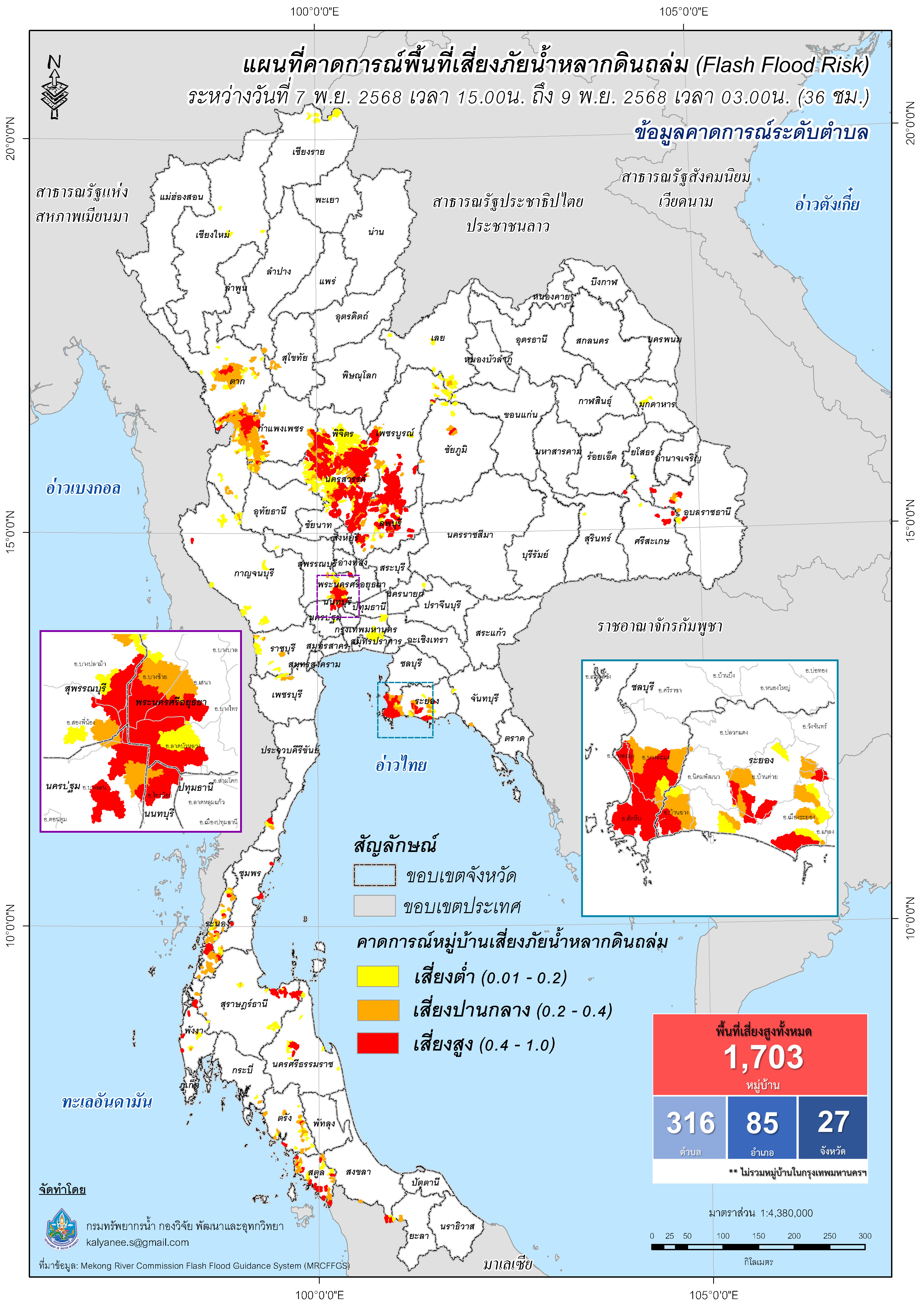 การคาดการณ์ตำบล/หมู่บ้านเสี่ยงภัยน้ำหลากดินถล่ม (Flash Flood Risk) 7 - 9 พฤศจิกายน 2568