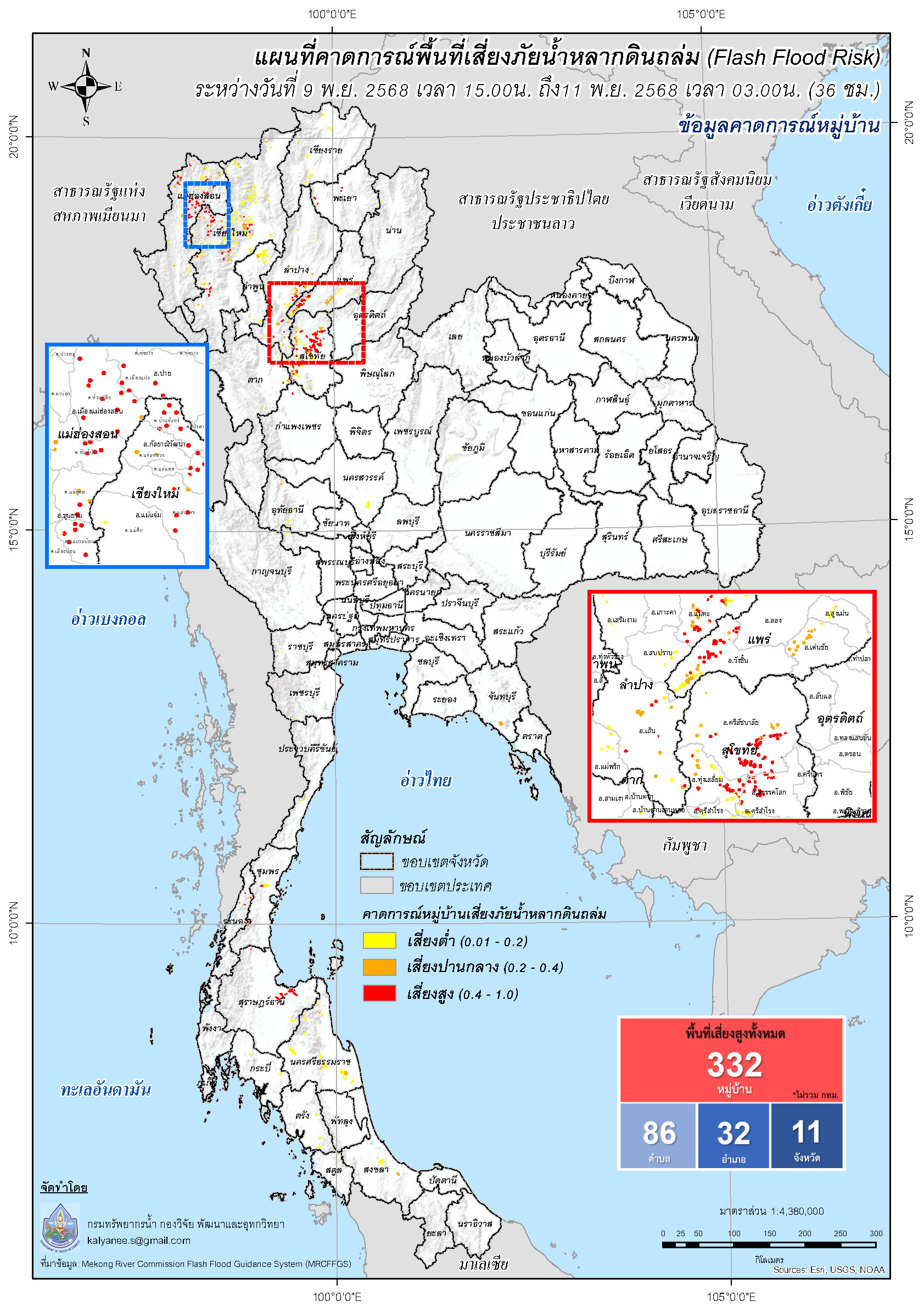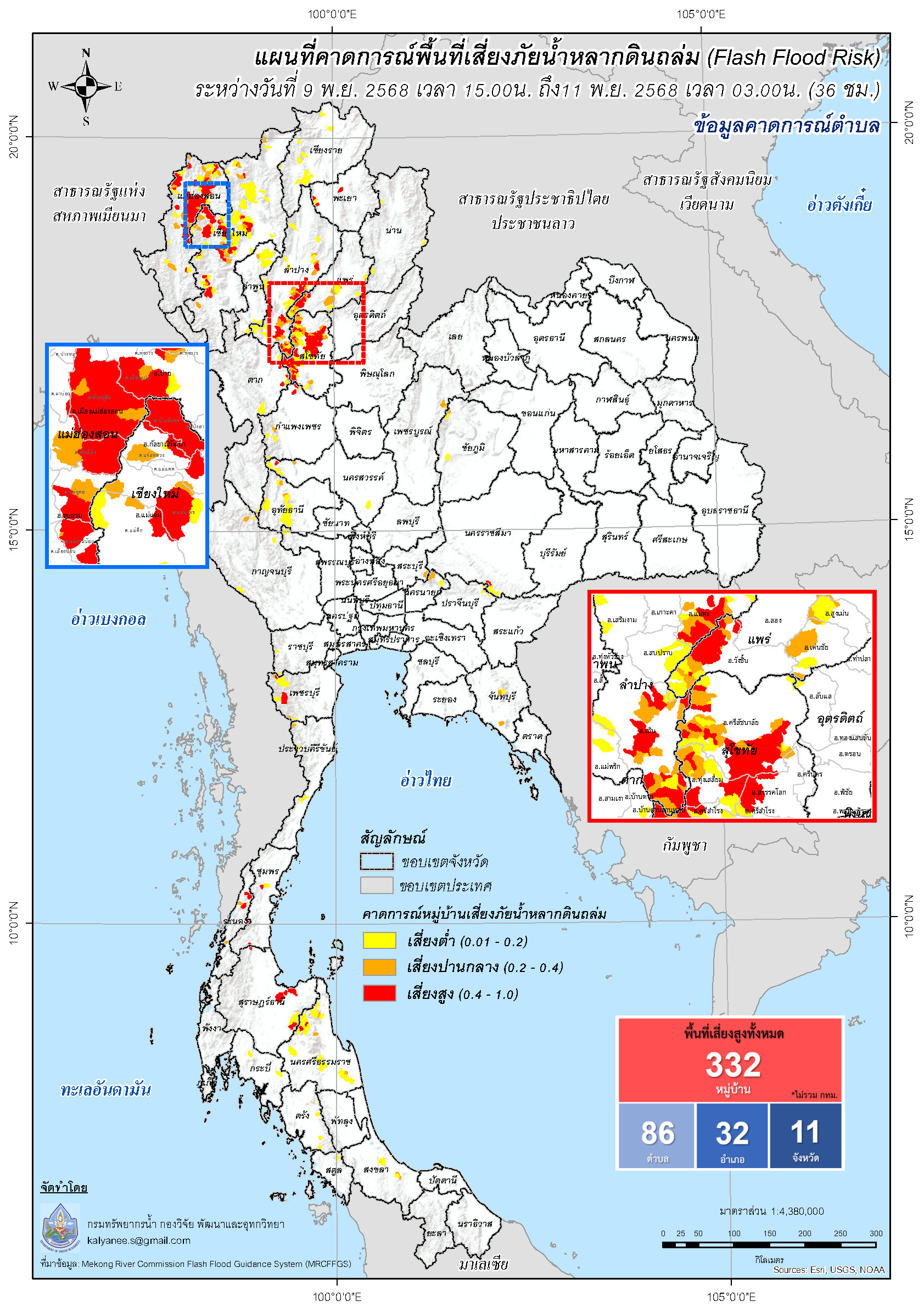 การคาดการณ์ตำบล/หมู่บ้านเสี่ยงภัยน้ำหลากดินถล่ม (Flash Flood Risk) 9 - 11 พฤศจิกายน 2568