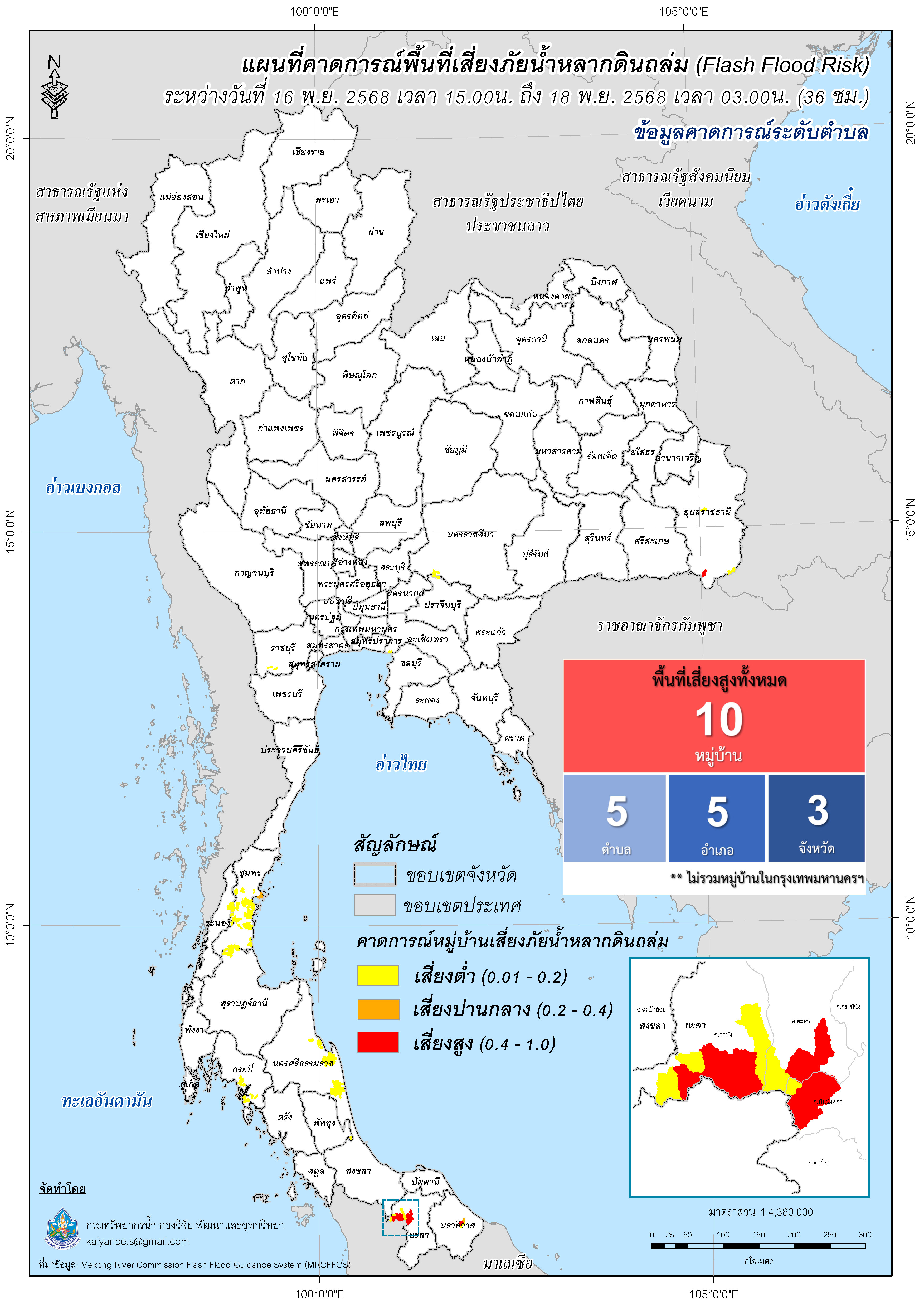 การคาดการณ์ตำบล/หมู่บ้านเสี่ยงภัยน้ำหลากดินถล่ม (Flash Flood Risk) 16 - 18 พฤศจิกายน 2568