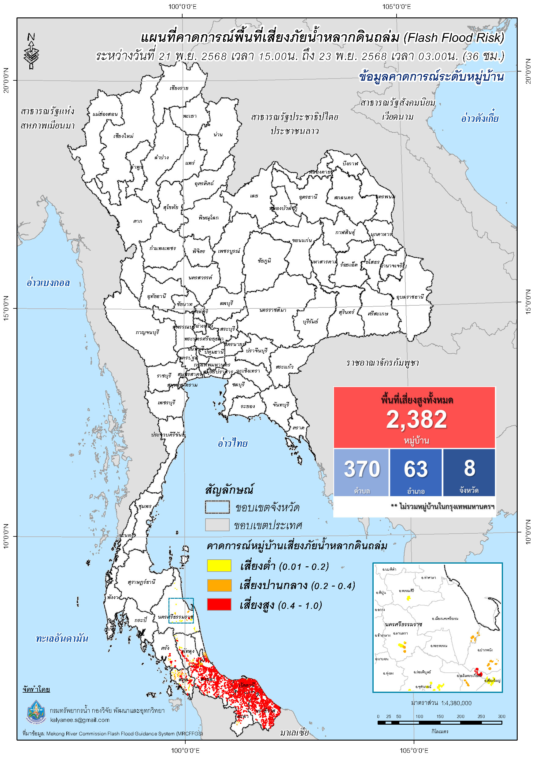 การคาดการณ์ตำบล/หมู่บ้านเสี่ยงภัยน้ำหลากดินถล่ม (Flash Flood Risk) 21 - 23 พฤศจิกายน 2568