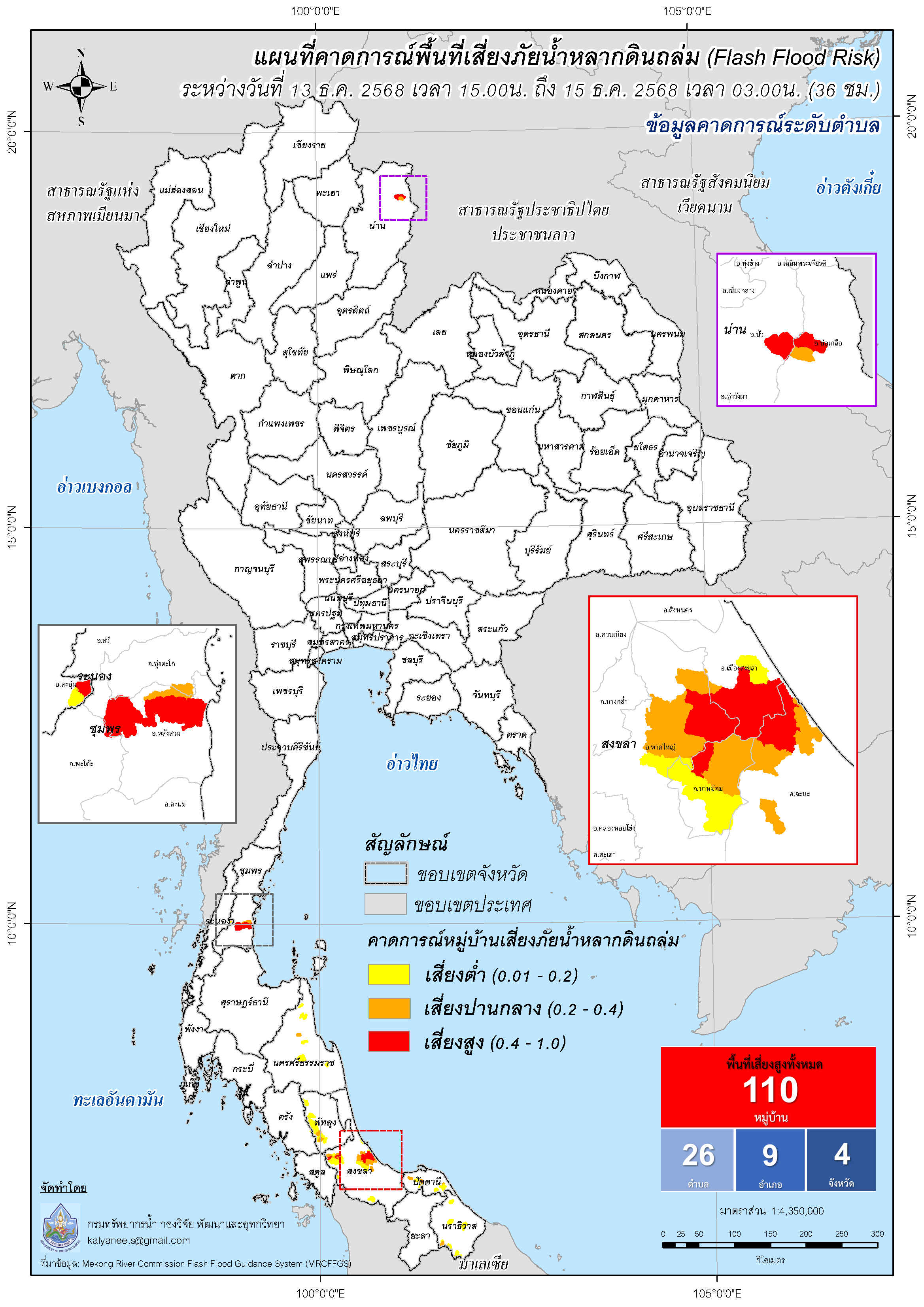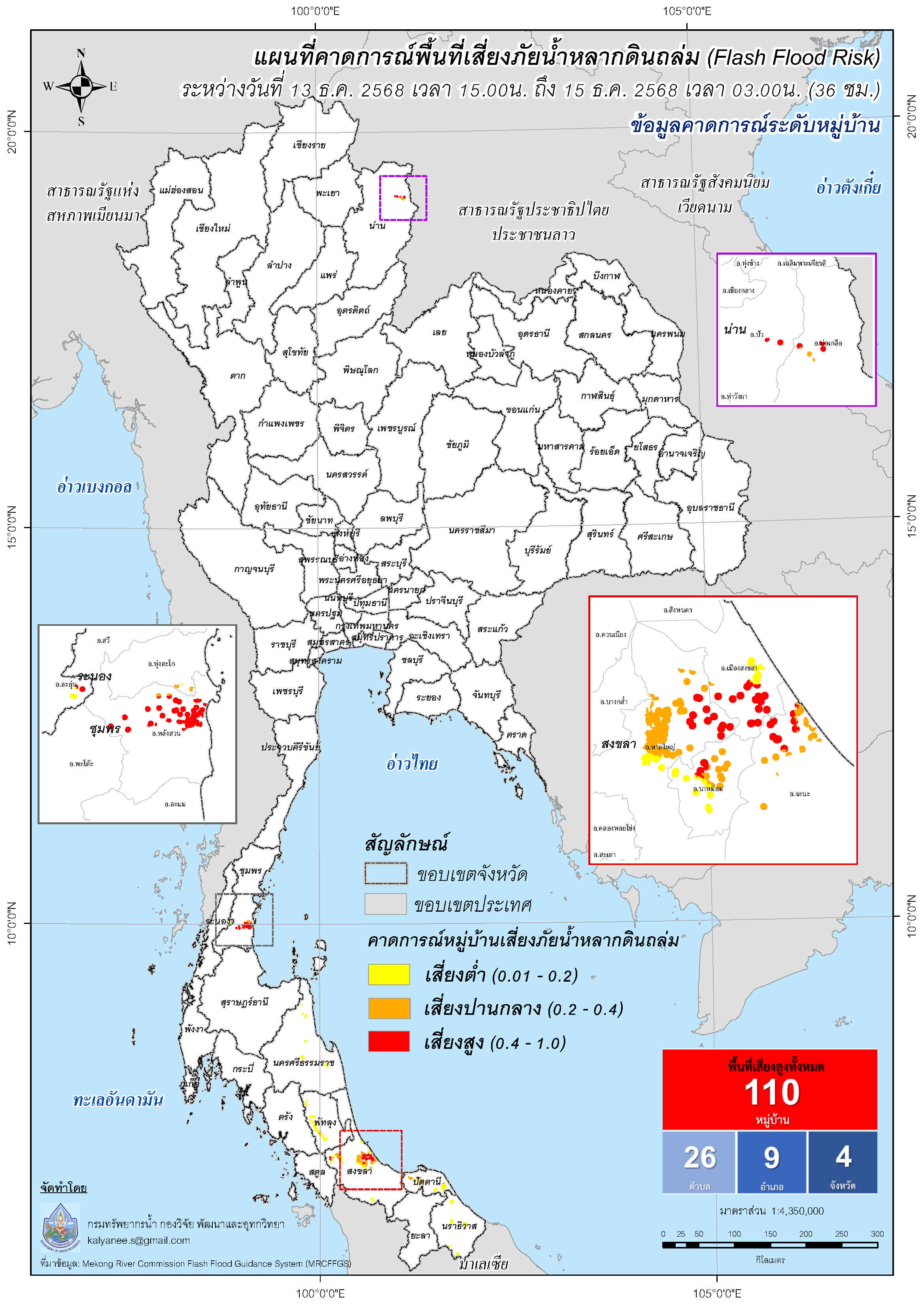 การคาดการณ์ตำบล/หมู่บ้านเสี่ยงภัยน้ำหลากดินถล่ม (Flash Flood Risk) 13 ธันวาคม - 15 ธันวาคม 2568