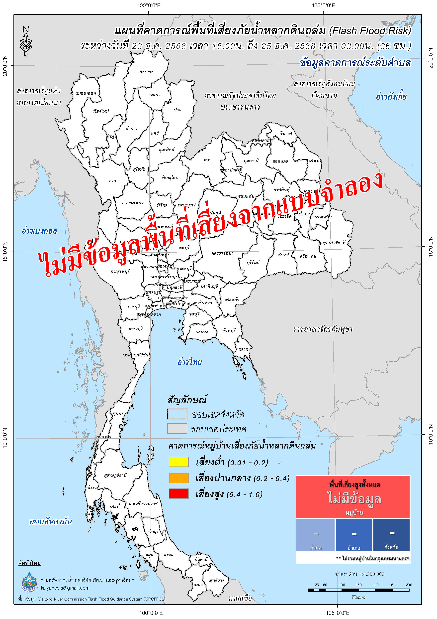 คาดการณ์พื้นที่เสี่ยงภัยน้ำหลากดินถล่ม (Flash Flood Risk) ระดับตำบล และระดับหมู่บ้าน วันที่ 23 ธันวาคม - 25 ธันวาคม 2568 (36 ชม./ 03.00น.) |
