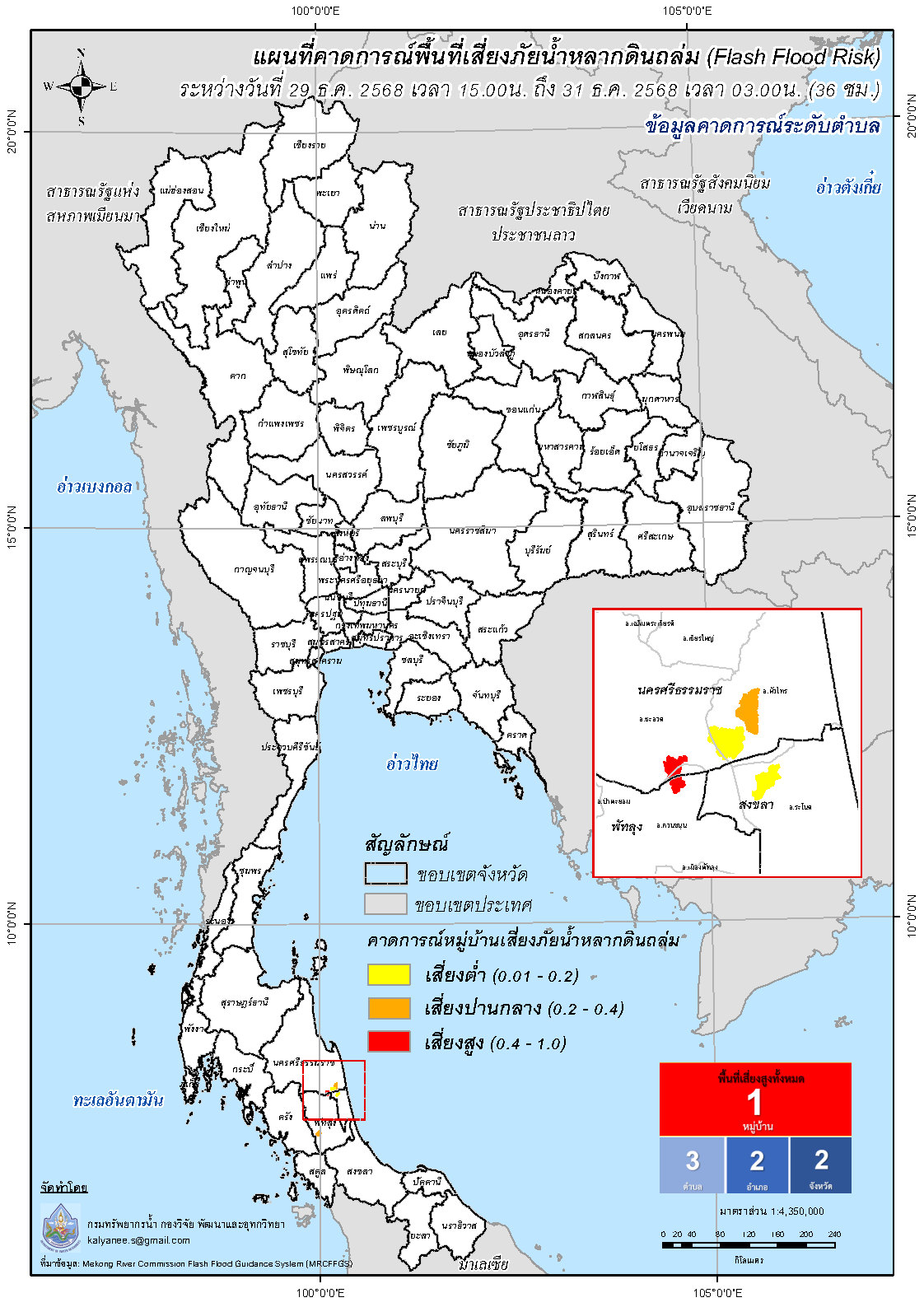 การคาดการณ์ตำบล/หมู่บ้านเสี่ยงภัยน้ำหลากดินถล่ม (Flash Flood Risk) 29 ธันวาคม - 31 ธันวาคม 2568