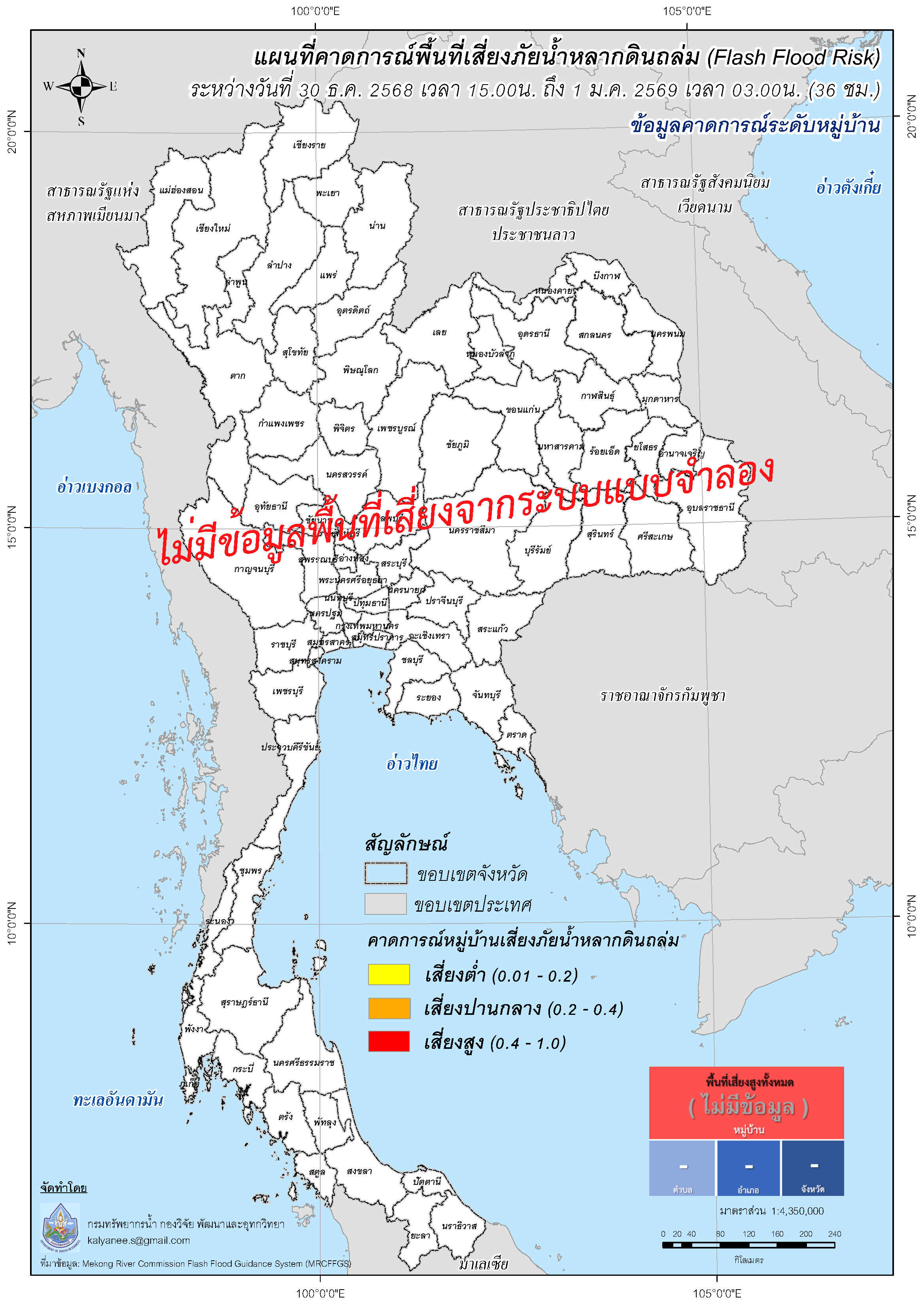 การคาดการณ์ตำบล/หมู่บ้านเสี่ยงภัยน้ำหลากดินถล่ม (Flash Flood Risk) 30 ธันวาคม 2568 - 1 มกราคม 2569