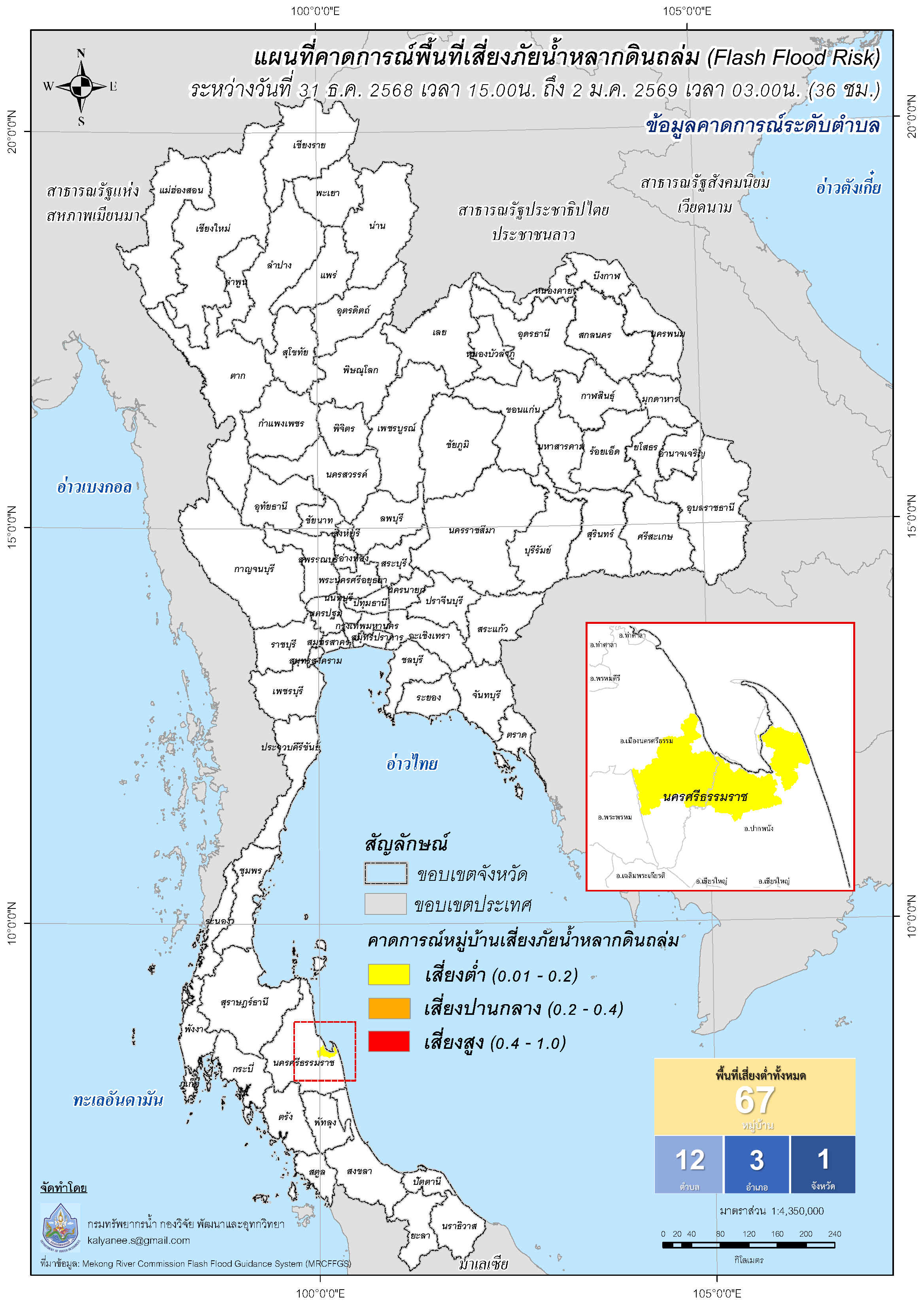 การคาดการณ์ตำบล/หมู่บ้านเสี่ยงภัยน้ำหลากดินถล่ม (Flash Flood Risk) 31 ธันวาคม 2568 - 2 มกราคม 2569