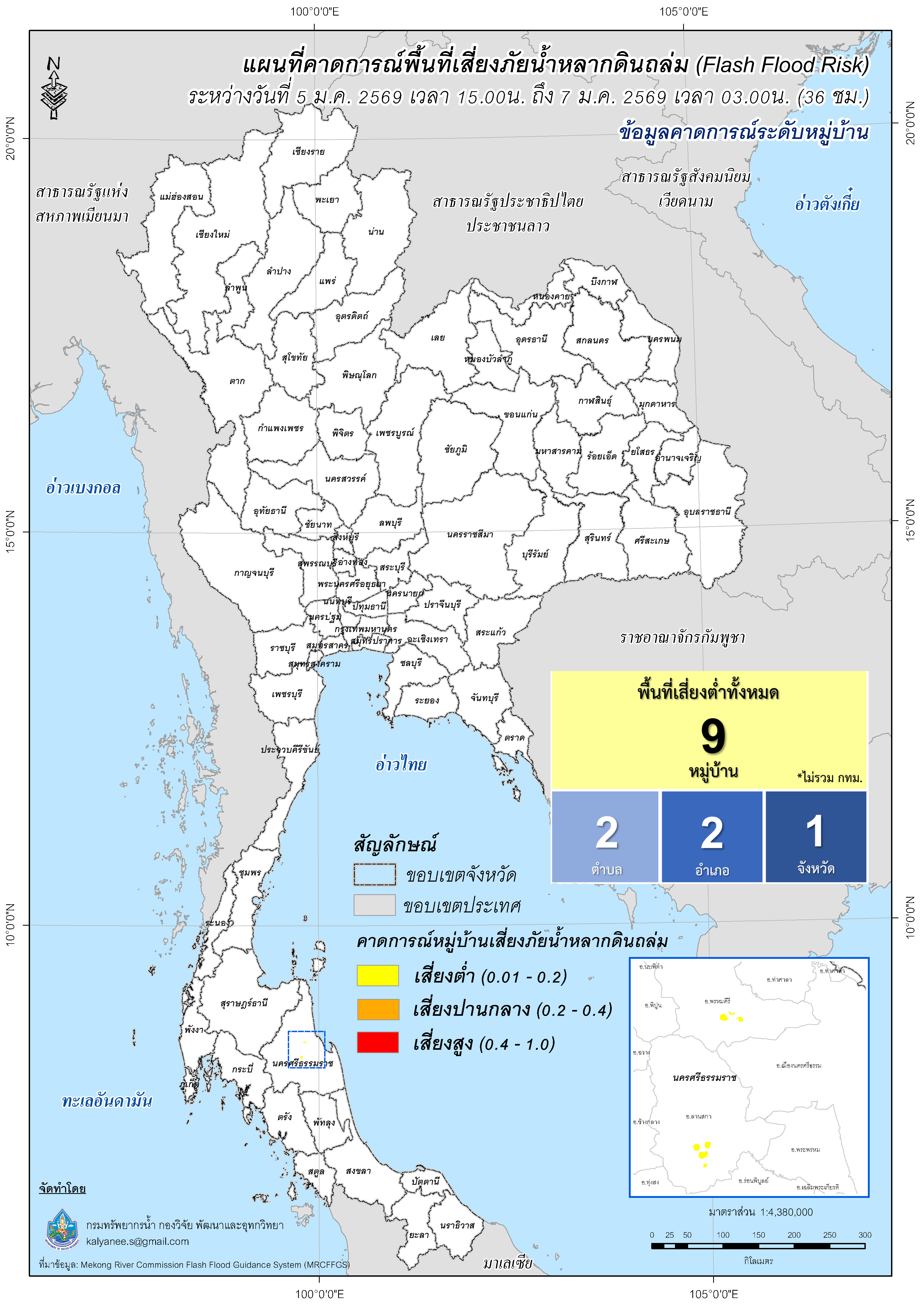 การคาดการณ์ตำบล/หมู่บ้านเสี่ยงภัยน้ำหลากดินถล่ม (Flash Flood Risk) 5 มกราคม 2569 - 7 มกราคม 2569