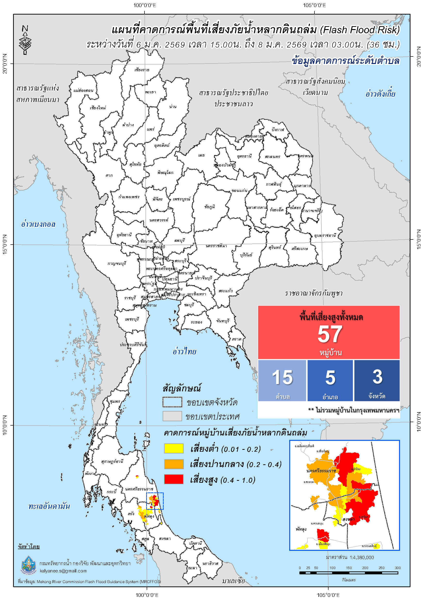 การคาดการณ์ตำบล/หมู่บ้านเสี่ยงภัยน้ำหลากดินถล่ม (Flash Flood Risk) 6 มกราคม 2569 - 8 มกราคม 2569