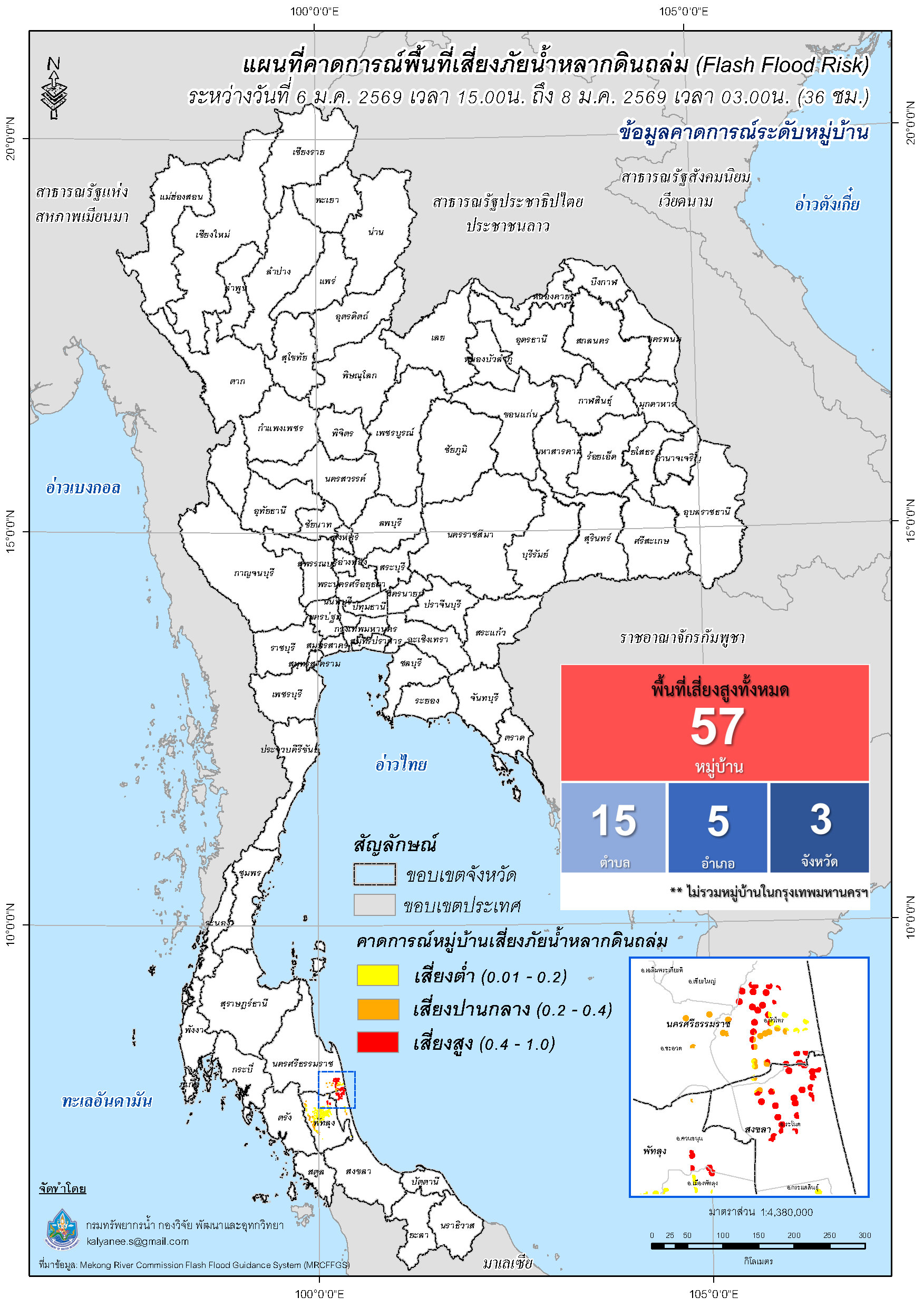 คาดการณ์พื้นที่เสี่ยงภัยน้ำหลากดินถล่ม (Flash Flood Risk) ระดับตำบล และระดับหมู่บ้าน วันที่ 6 มกราคม 2569 - 8 มกราคม 2569 (36 ชม./ 03.00น.) |