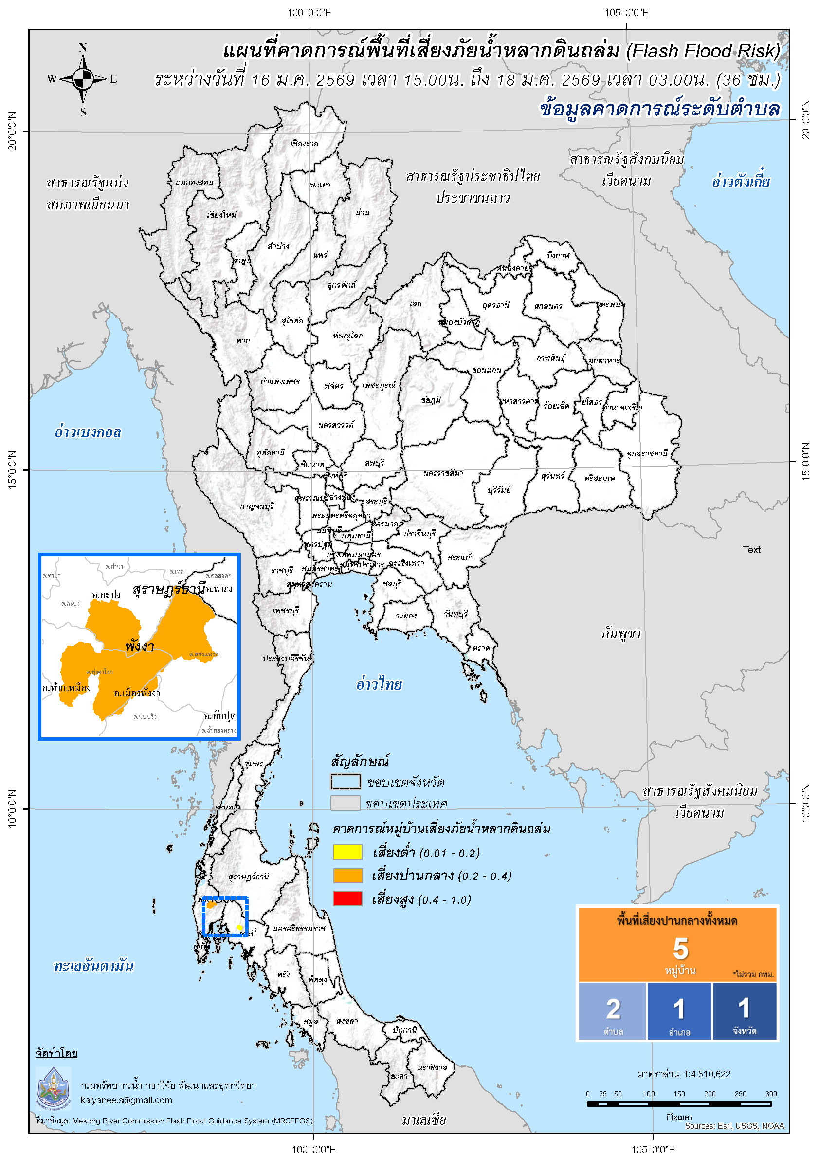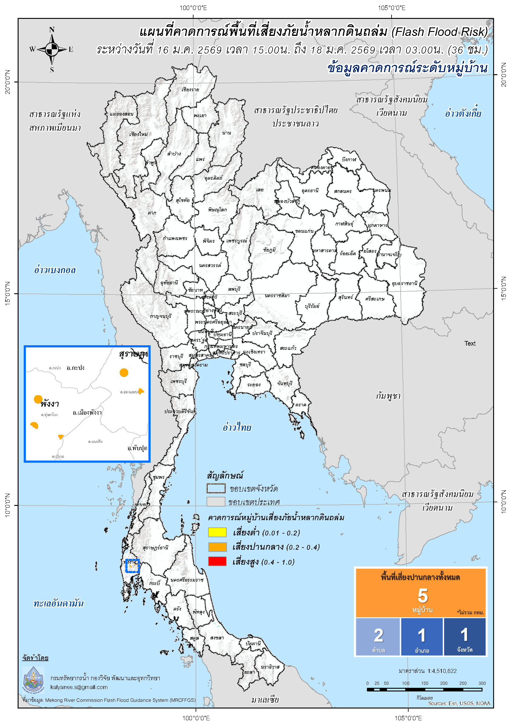 คาดการณ์พื้นที่เสี่ยงภัยน้ำหลากดินถล่ม (Flash Flood Risk) ระดับตำบล และระดับหมู่บ้าน วันที่ 16 มกราคม 2569 - 18 มกราคม 2569 (36 ชม./ 03.00น.) |