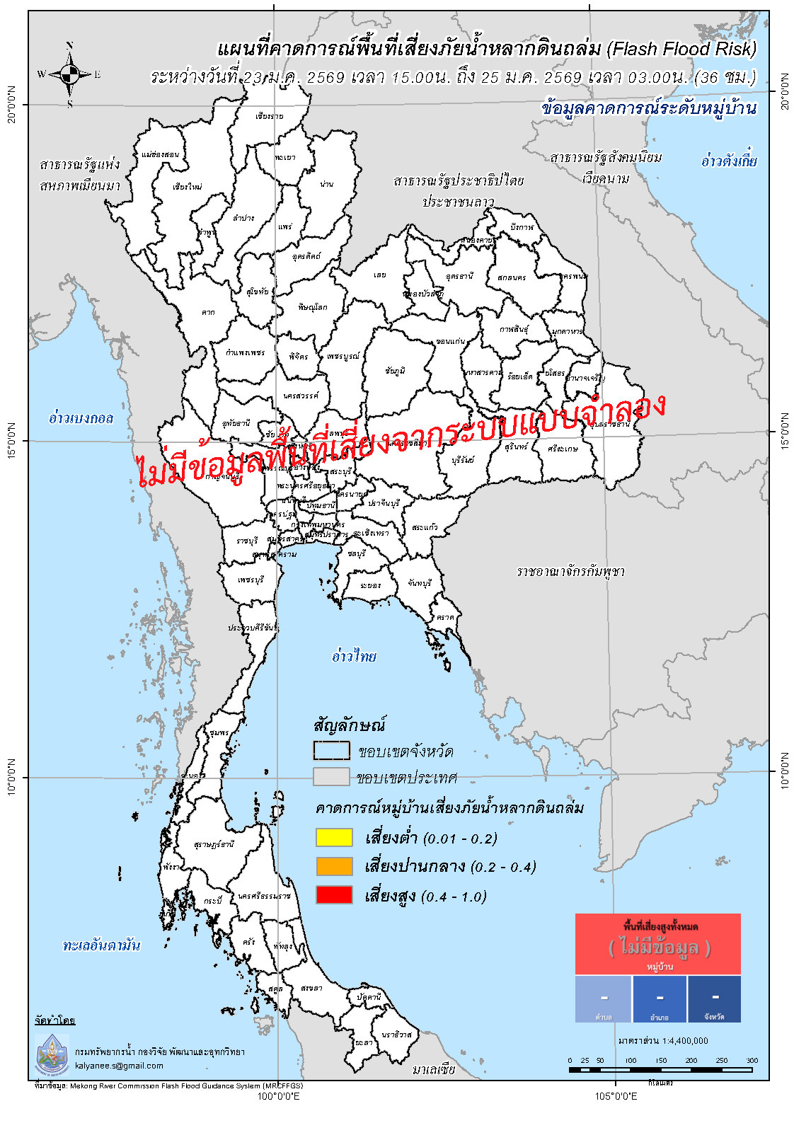 คาดการณ์พื้นที่เสี่ยงภัยน้ำหลากดินถล่ม (Flash Flood Risk) ระดับตำบล และระดับหมู่บ้าน วันที่ 23 มกราคม 2569 - 25 มกราคม 2569 (36 ชม./ 03.00น.) |