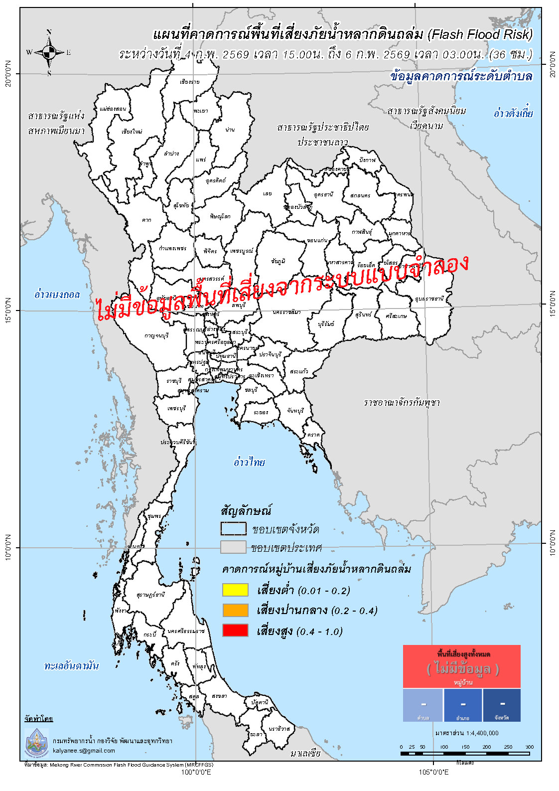 คาดการณ์พื้นที่เสี่ยงภัยน้ำหลากดินถล่ม (Flash Flood Risk) ระดับตำบล และระดับหมู่บ้าน วันที่ 4 กุมภาพันธ์ - 6 กุมภาพันธ์ 2569 (36 ชม./ 03.00น.) |