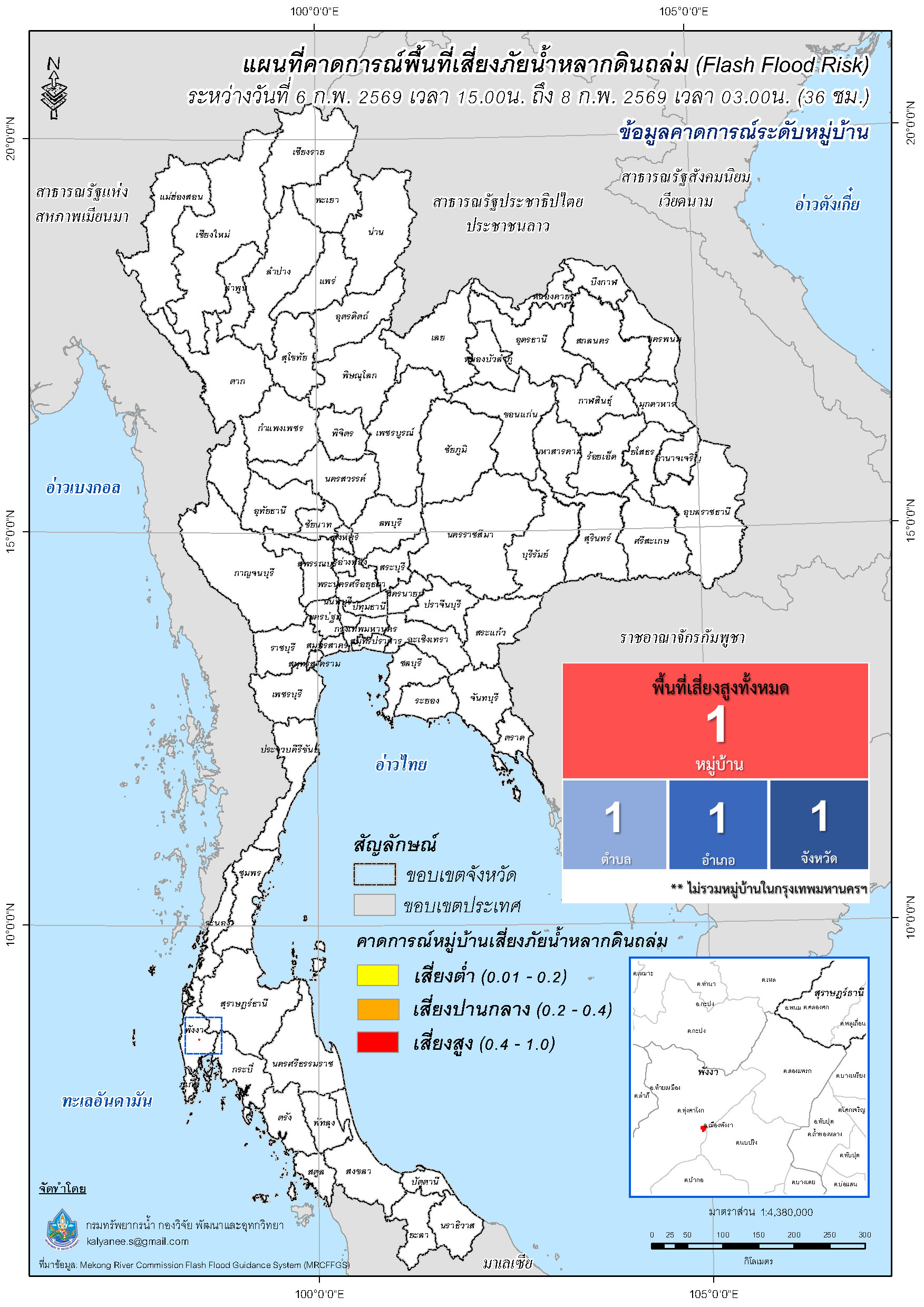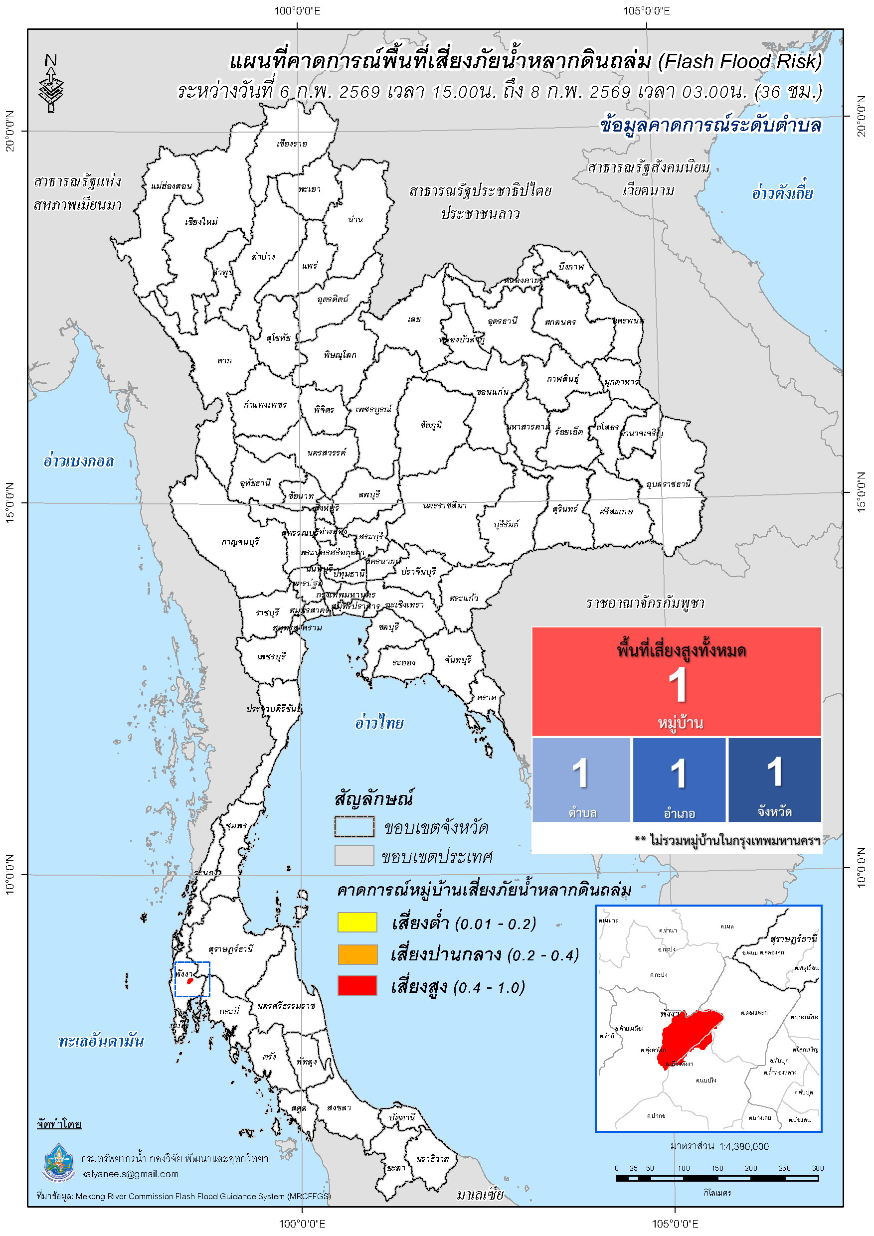 การคาดการณ์ตำบล/หมู่บ้านเสี่ยงภัยน้ำหลากดินถล่ม (Flash Flood Risk) 6 กุมภาพันธ์ 2569 - 8 กุมภาพันธ์ 2569