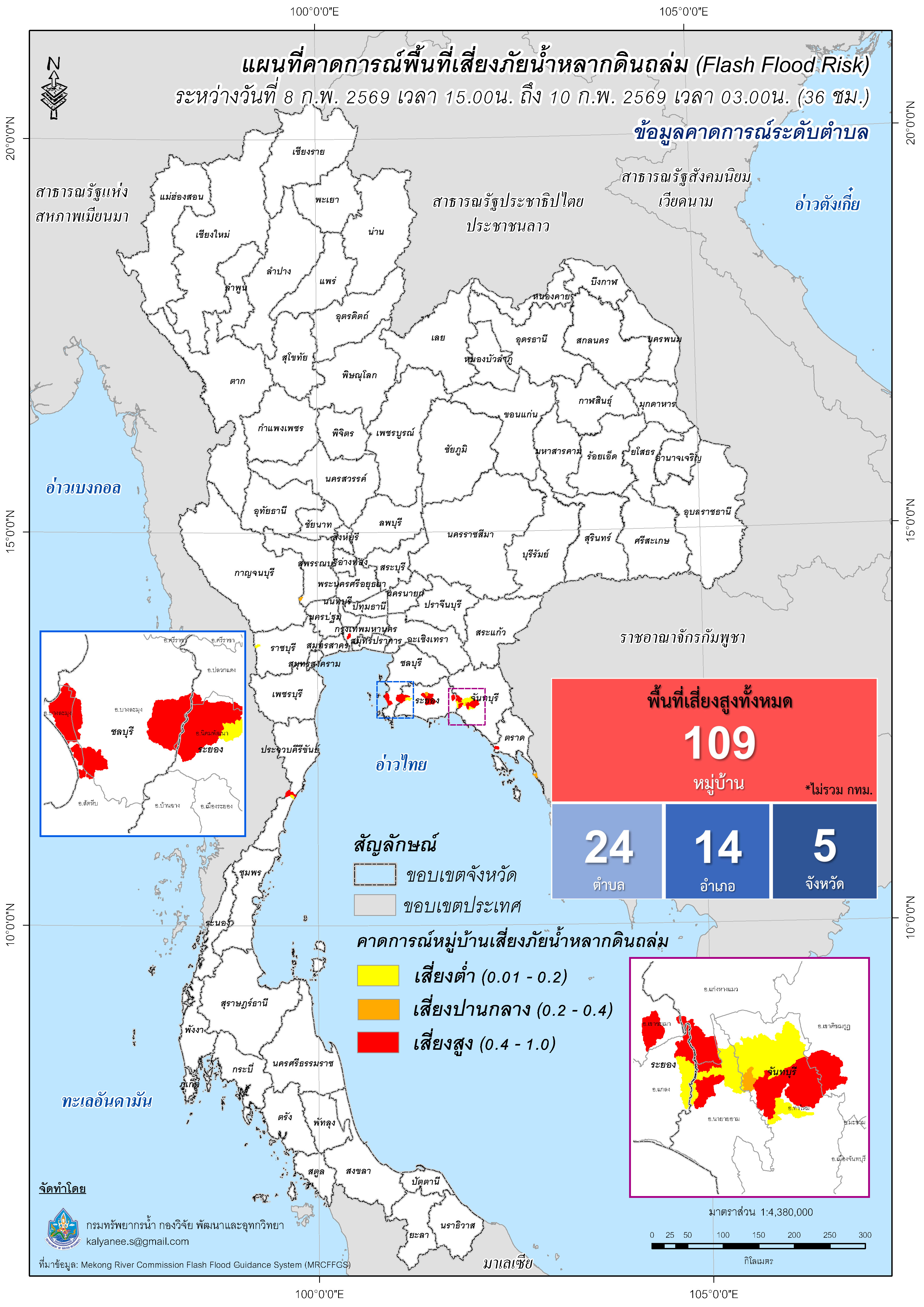 การคาดการณ์ตำบล/หมู่บ้านเสี่ยงภัยน้ำหลากดินถล่ม (Flash Flood Risk) 8 กุมภาพันธ์ 2569 - 10 กุมภาพันธ์ 2569