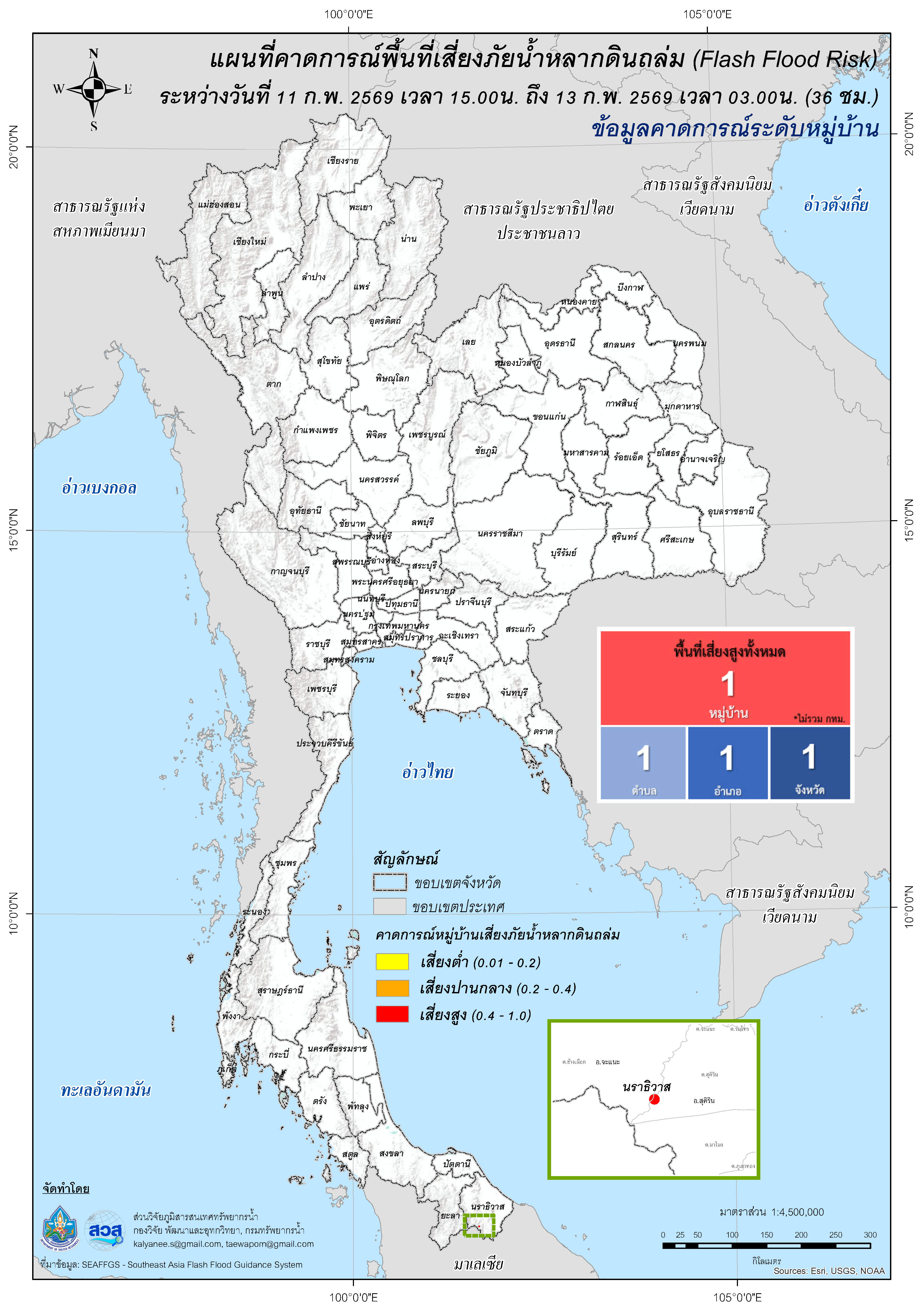 การคาดการณ์ตำบล/หมู่บ้านเสี่ยงภัยน้ำหลากดินถล่ม (Flash Flood Risk) 11 กุมภาพันธ์ 2569 - 13 กุมภาพันธ์ 2569