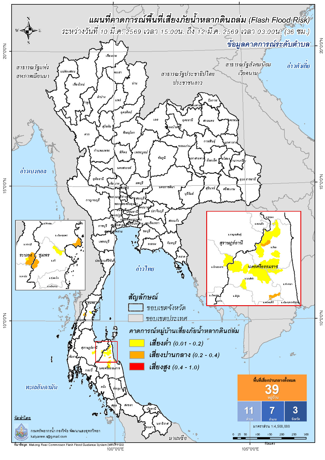 การคาดการณ์ตำบล/หมู่บ้านเสี่ยงภัยน้ำหลากดินถล่ม (Flash Flood Risk) 10 มีนาคม 2569 - 12 มีนาคม 2569