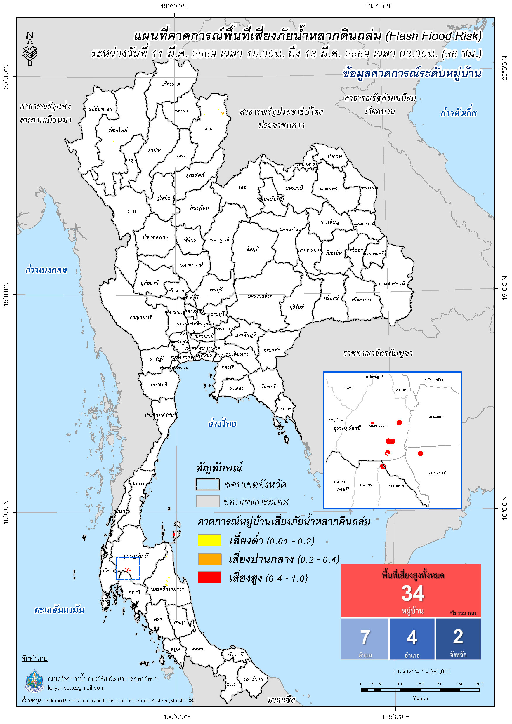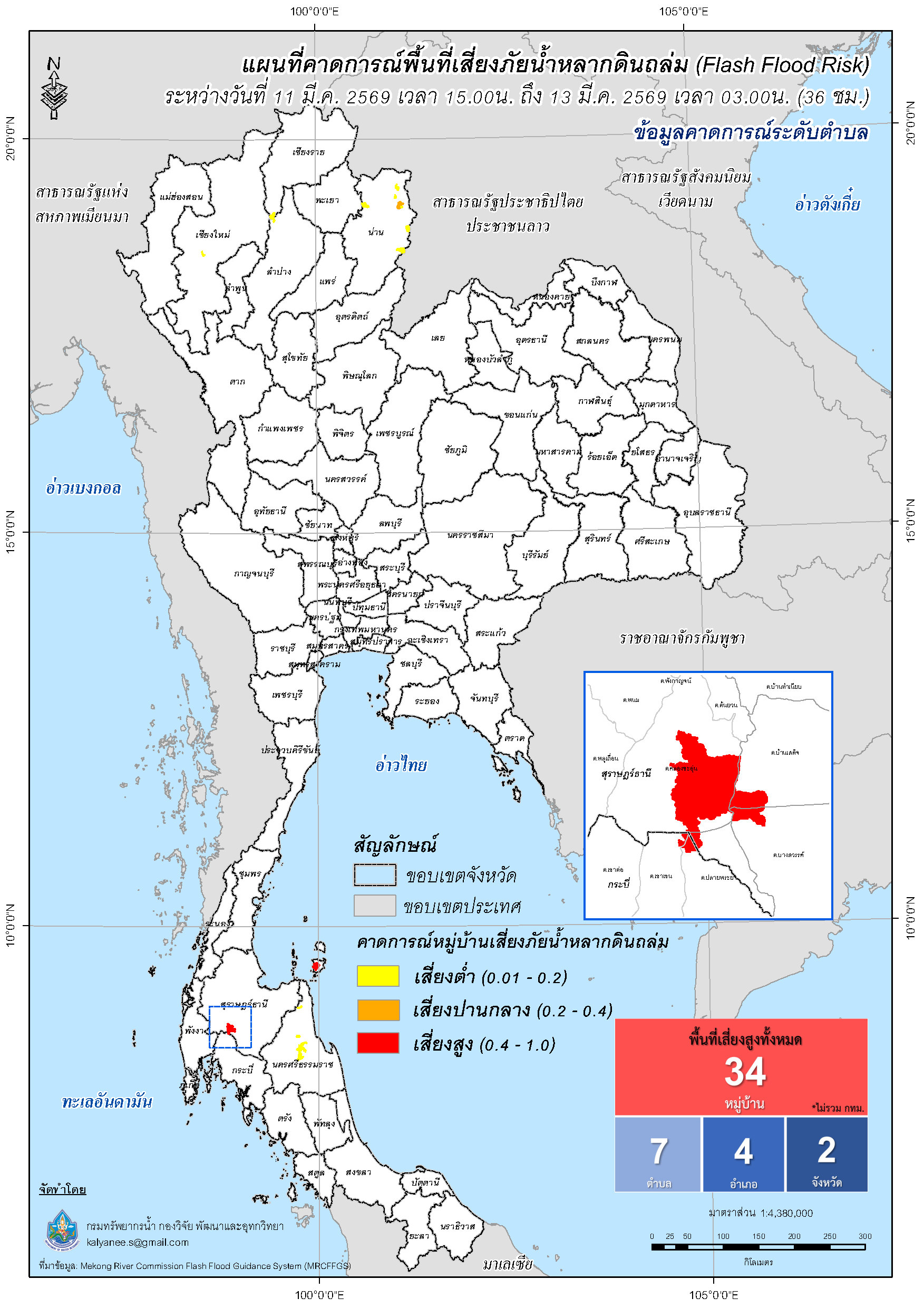 การคาดการณ์ตำบล/หมู่บ้านเสี่ยงภัยน้ำหลากดินถล่ม (Flash Flood Risk) 11 มีนาคม 2569 - 13 มีนาคม 2569