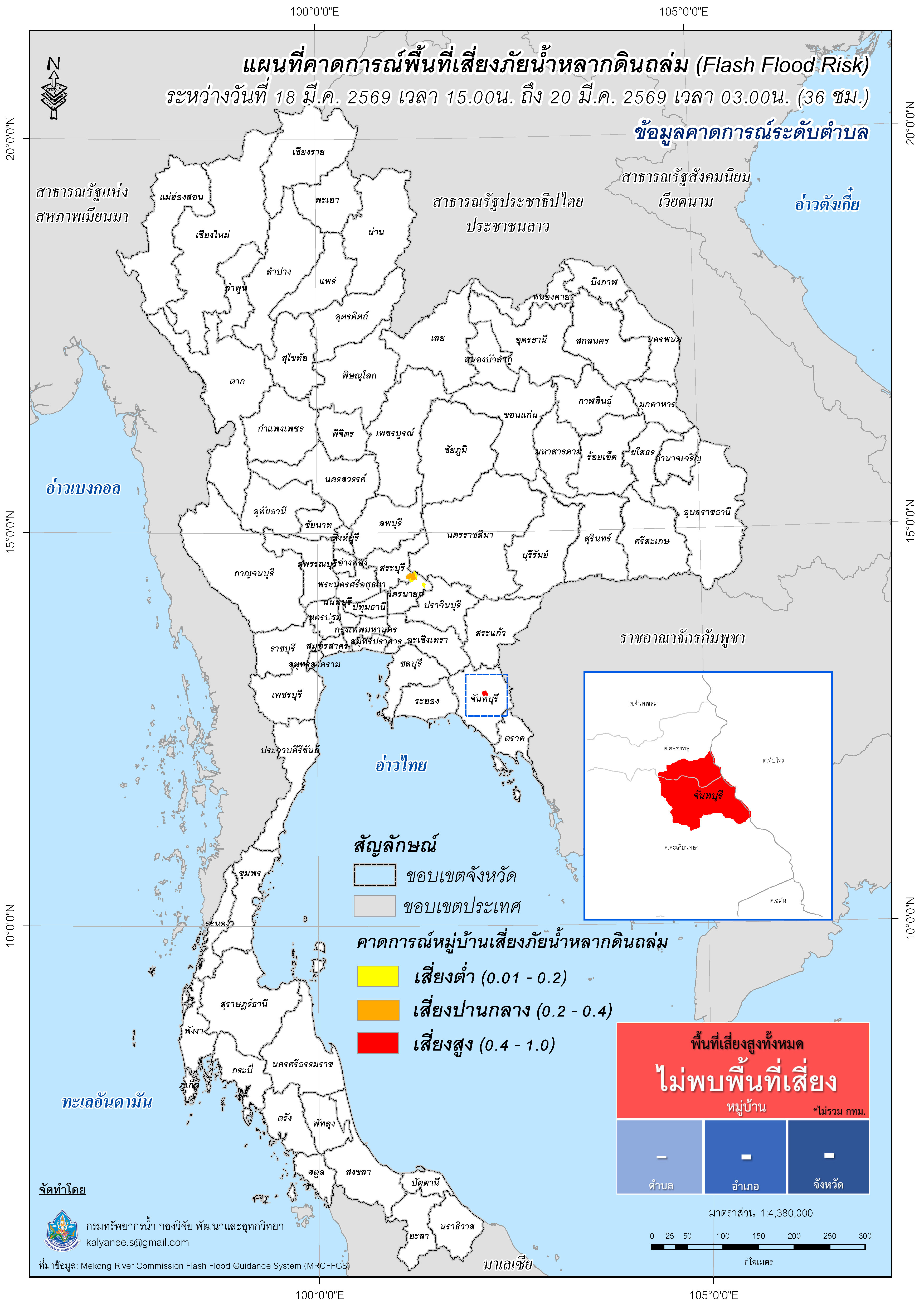การคาดการณ์ตำบล/หมู่บ้านเสี่ยงภัยน้ำหลากดินถล่ม (Flash Flood Risk) 18 มีนาคม 2569 - 20 มีนาคม 2569