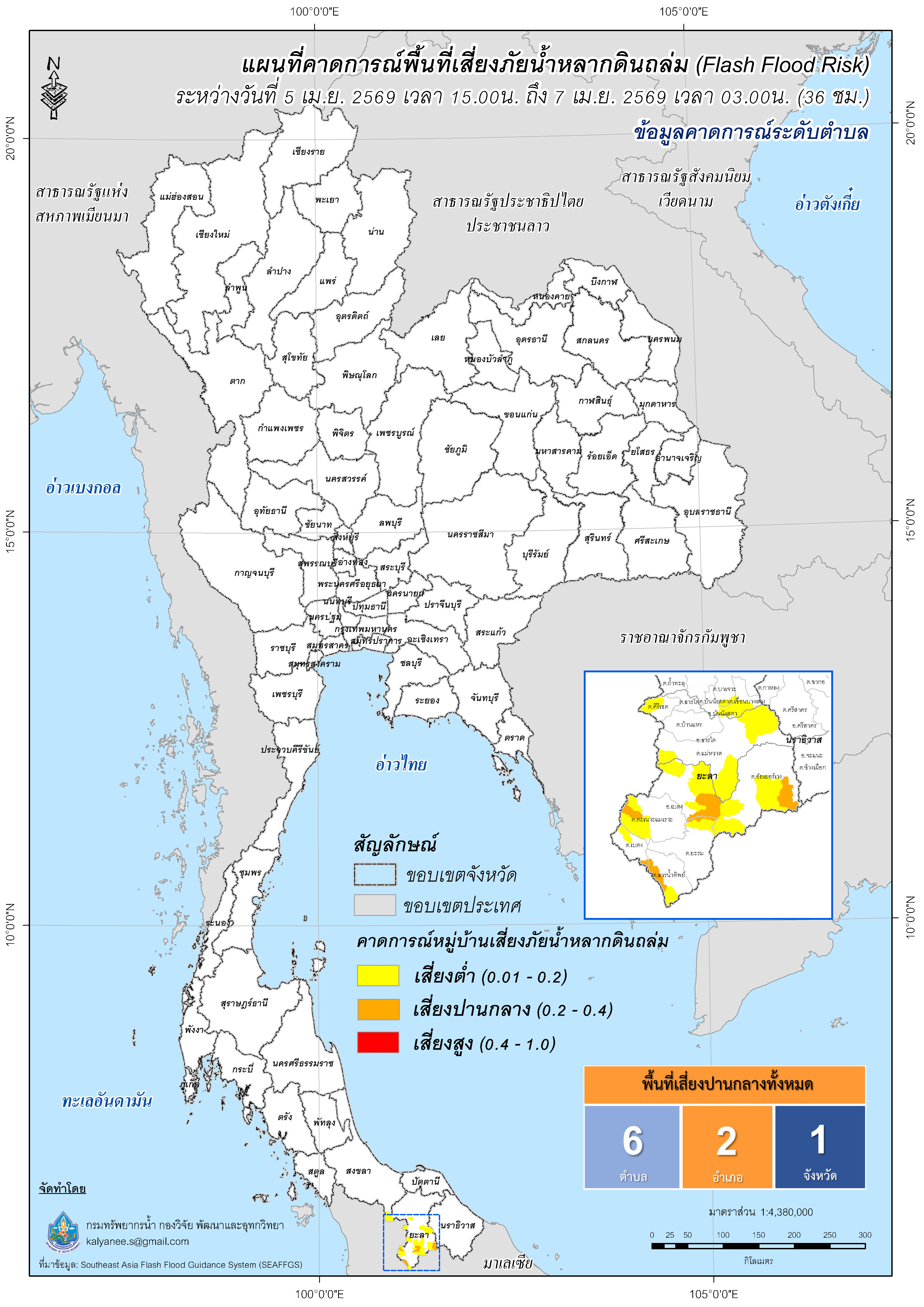 คาดการณ์พื้นที่เสี่ยงภัยน้ำหลากดินถล่ม (Flash Flood Risk) ระดับตำบล และระดับหมู่บ้าน 5 เม.ย. 2569 - 7 เม.ย. 2569 (36 ชม./ 03.00น.) |