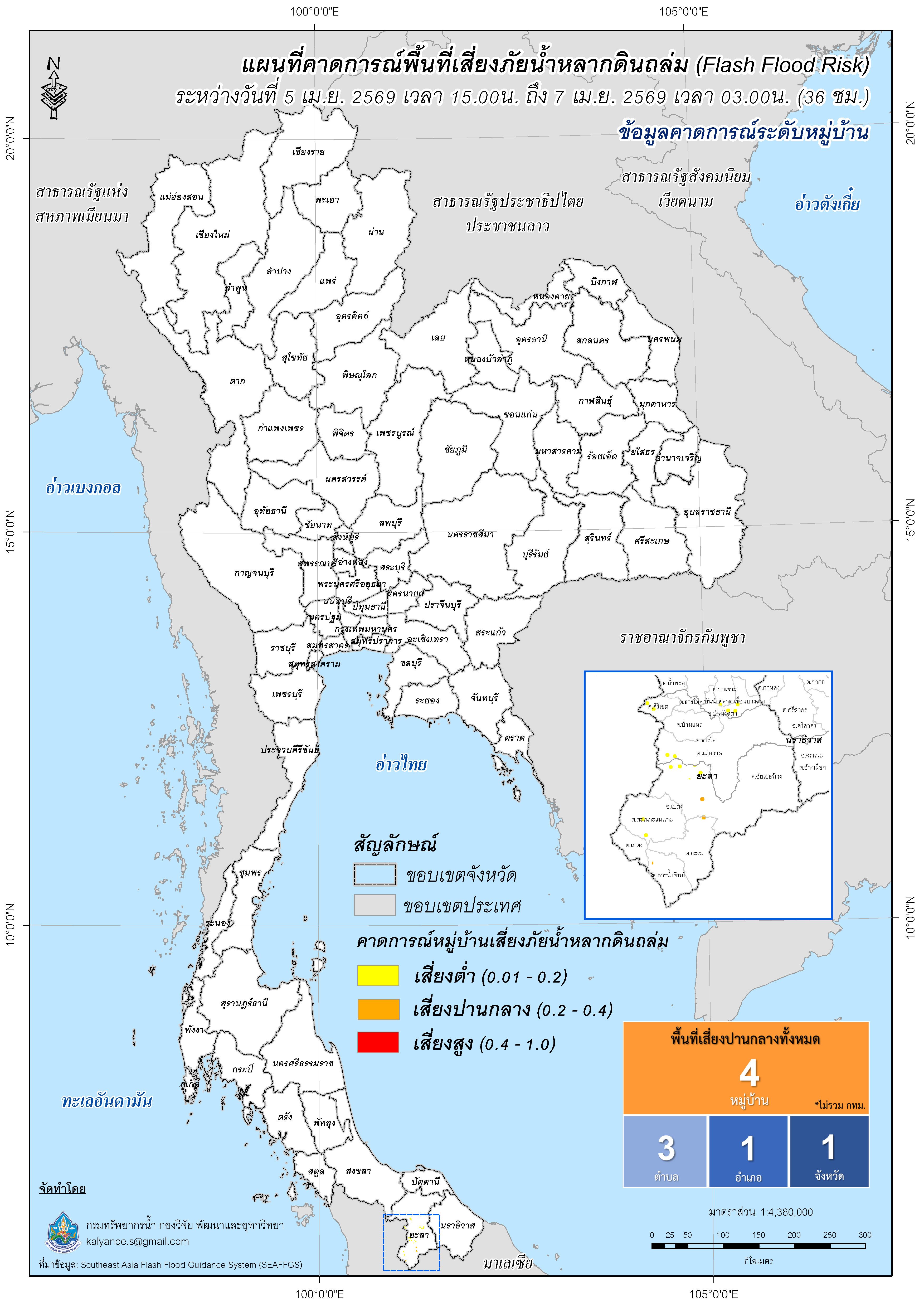 การคาดการณ์ตำบล/หมู่บ้านเสี่ยงภัยน้ำหลากดินถล่ม (Flash Flood Risk) 5 เมษายน 2569 - 7 เมษายน 2569