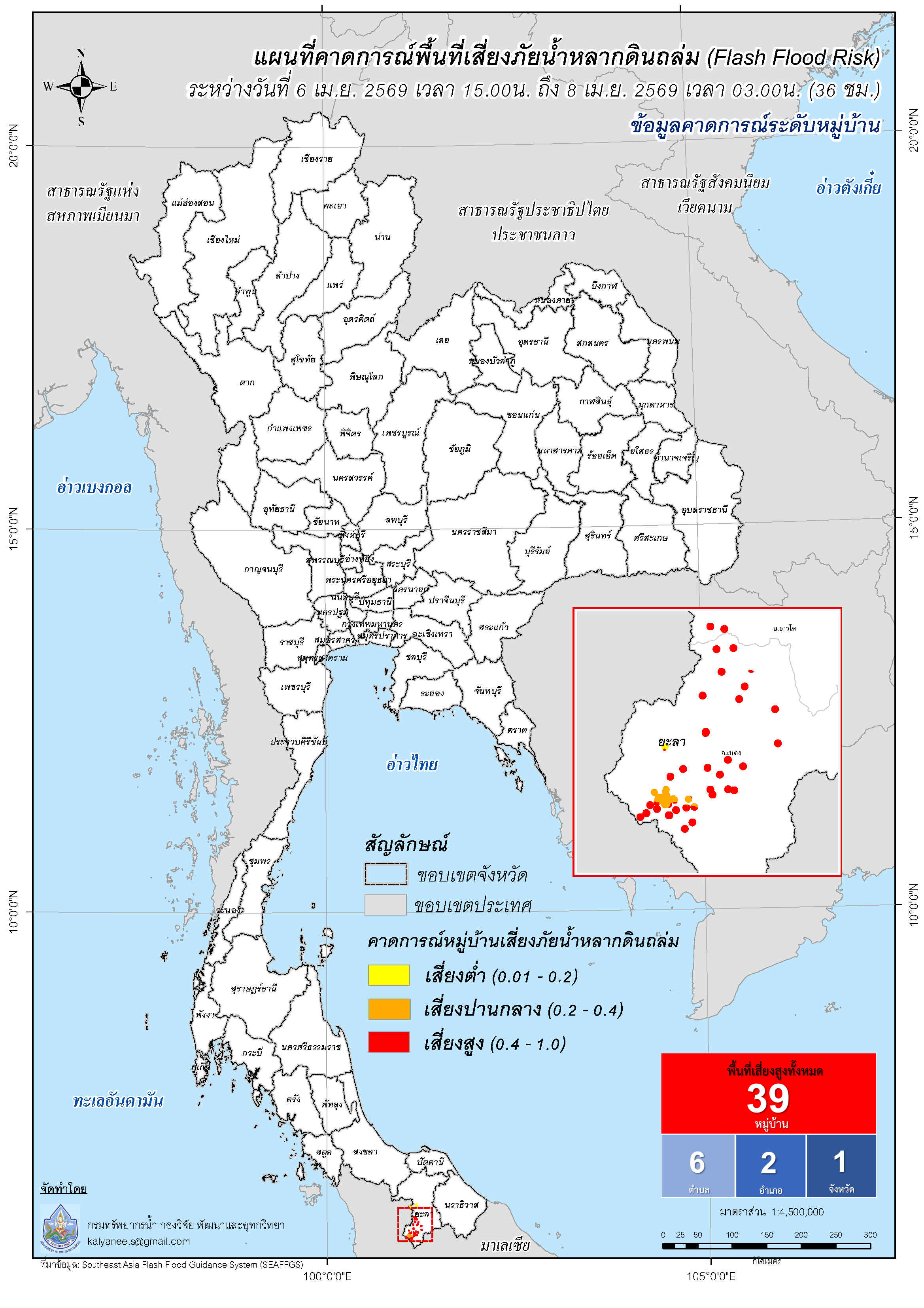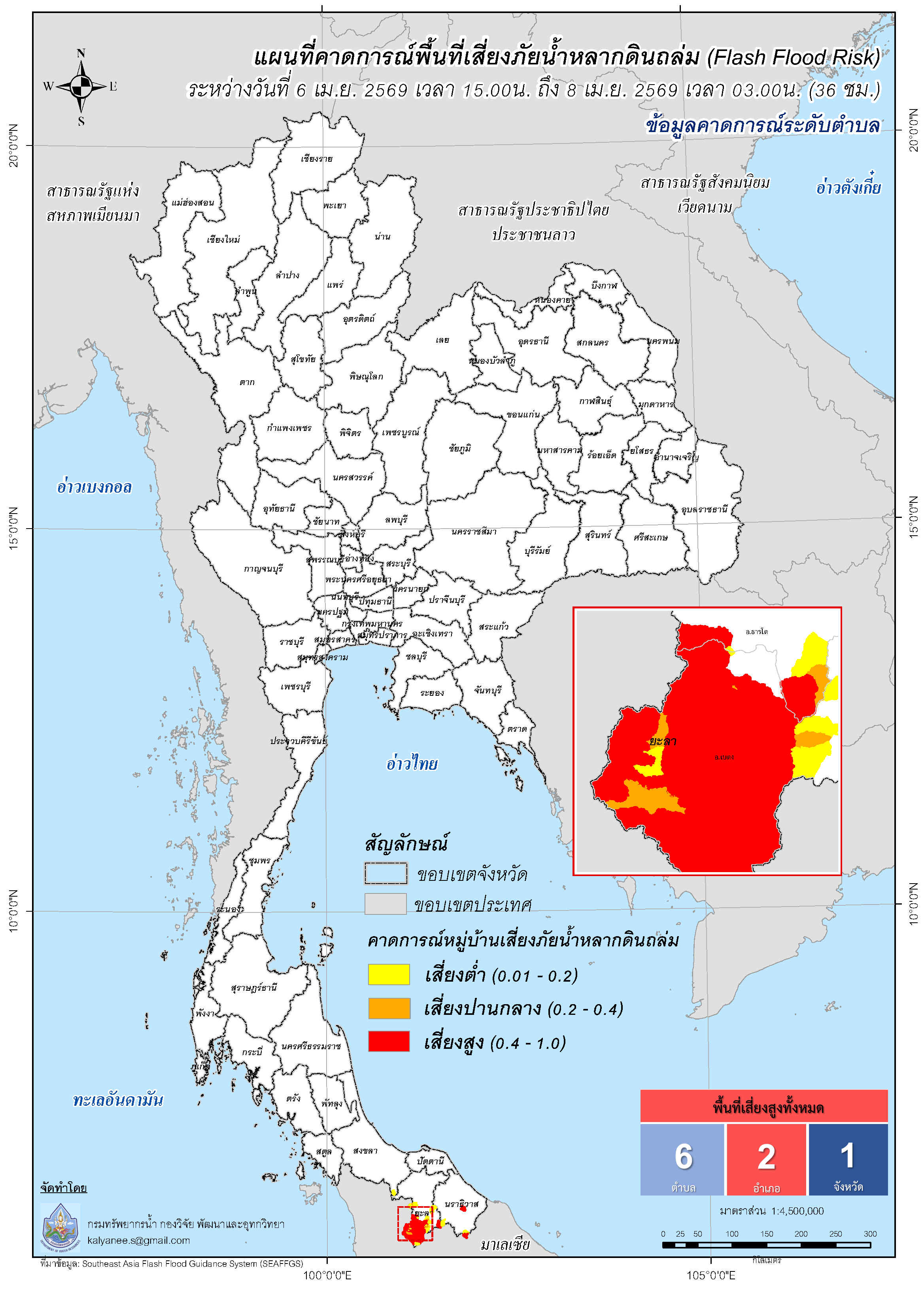 การคาดการณ์ตำบล/หมู่บ้านเสี่ยงภัยน้ำหลากดินถล่ม (Flash Flood Risk) 6 เมษายน 2569 - 8 เมษายน 2569
