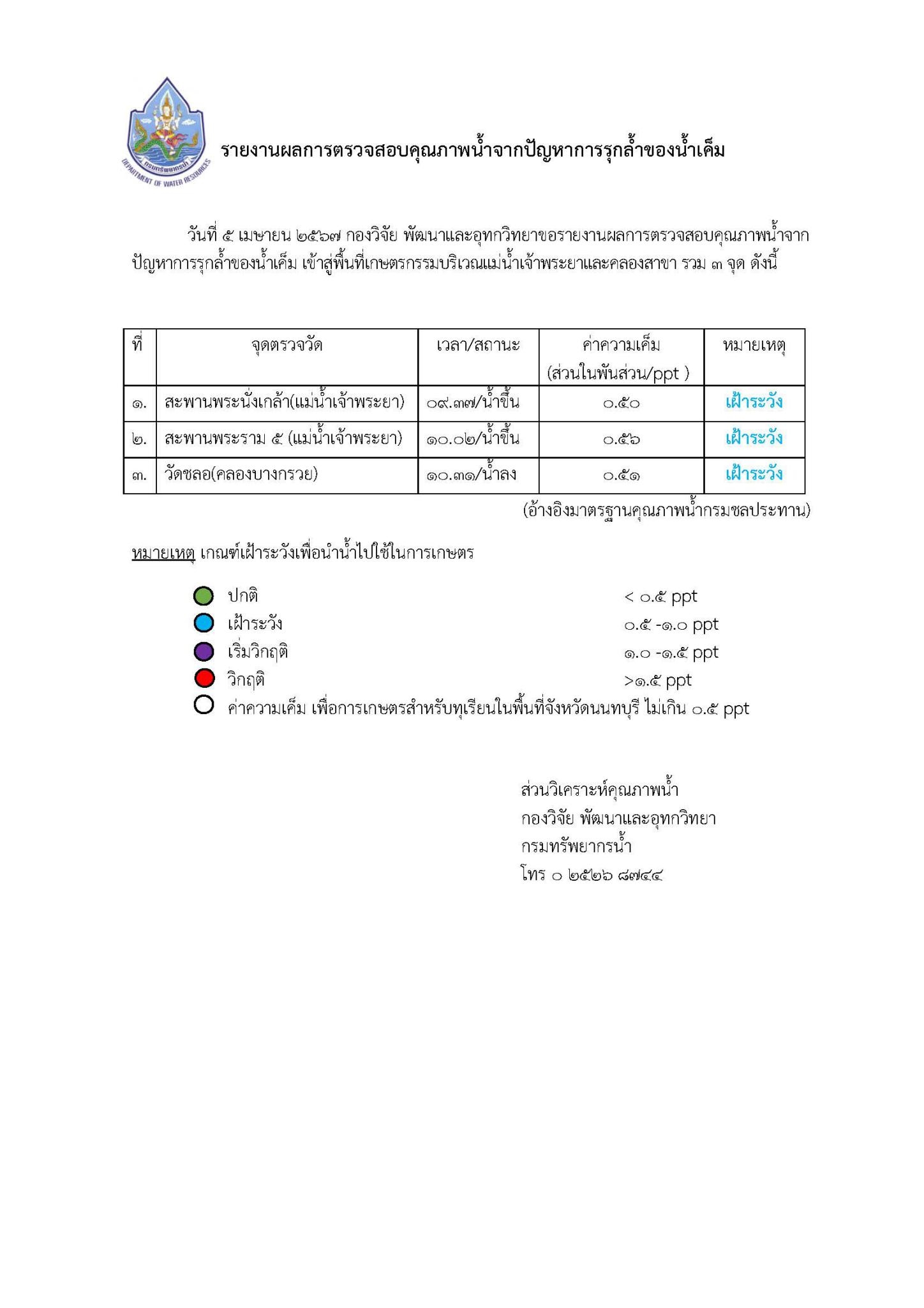 รายงานผลการตรวจสอบคุณภาพน้ำจากปัญหารุกล้ำของน้ำเค็ม วันที่ 5 เมษายน 2567